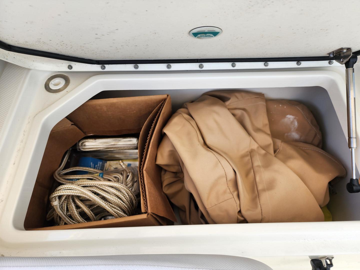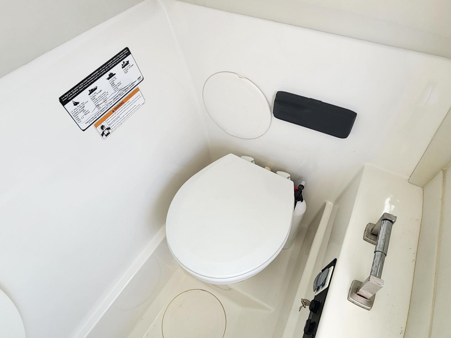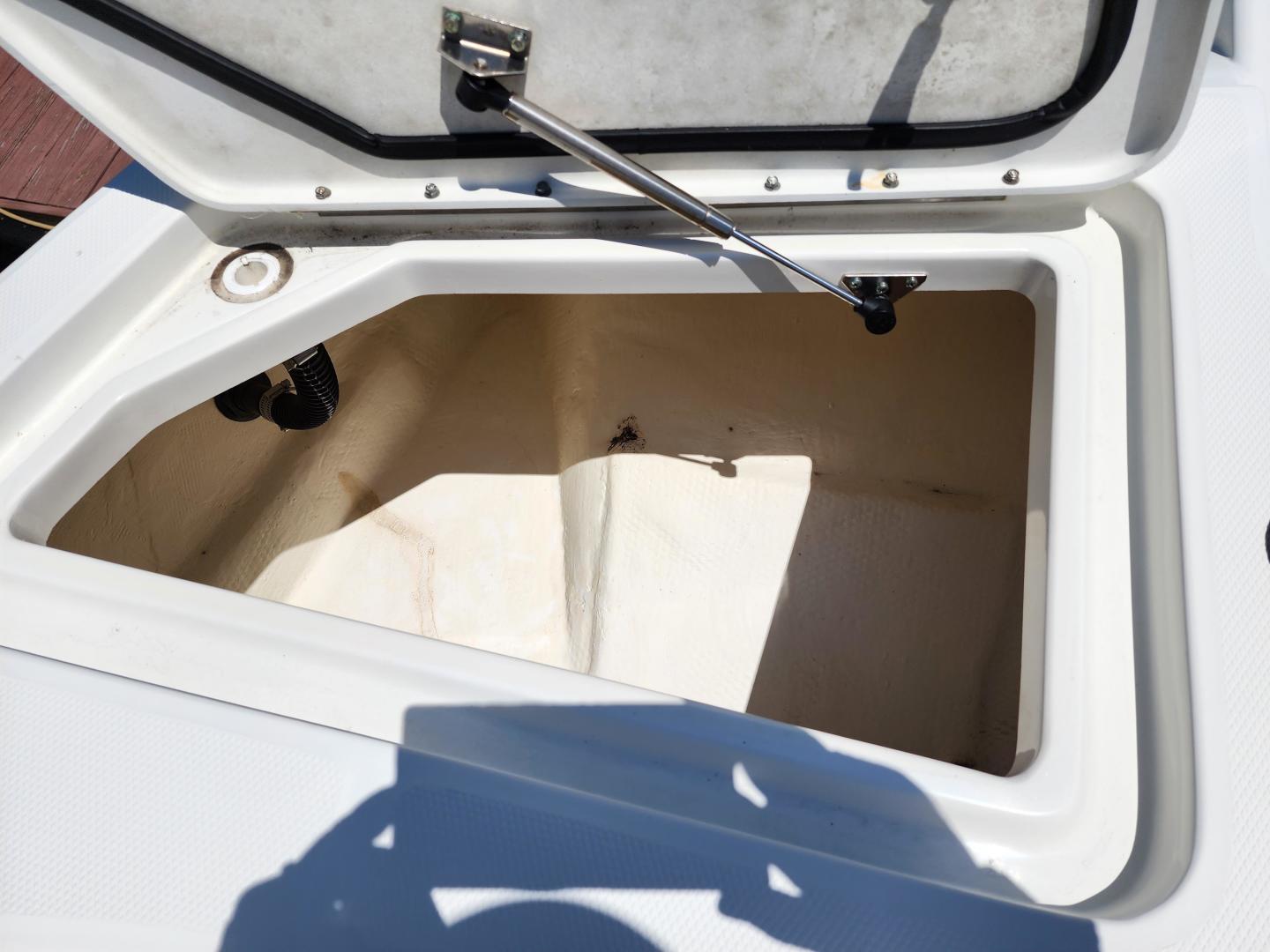 Forward of the helm deck to port is a enclosed head with a fresh water toilet, which also has additional storage, to starboard under the helm, there is a storage locker. The fore deck has wrap around seating, with storage underneath, and an insert area for the optional forward filler cushions, or table. Those items are in the original factory wrappers and have been stored in a climate controlled garage. Just forward of the seating are two large storage lockers an electric windlass, with galvanized Delta fast set anchor, galvanized chain with braided rode.