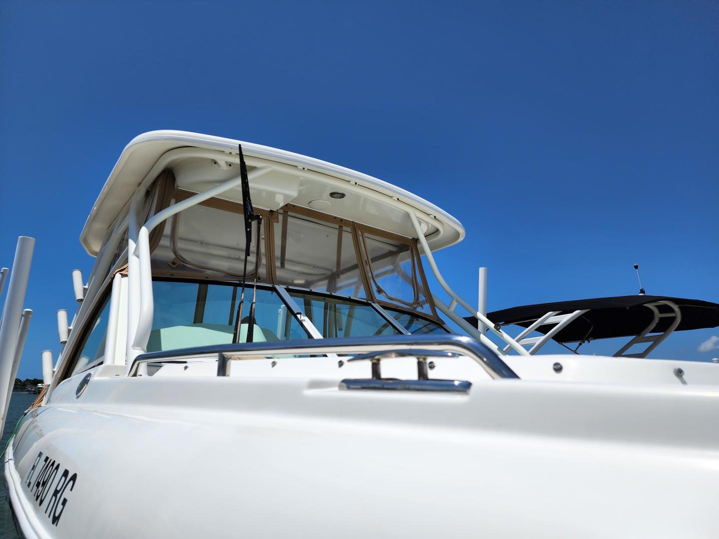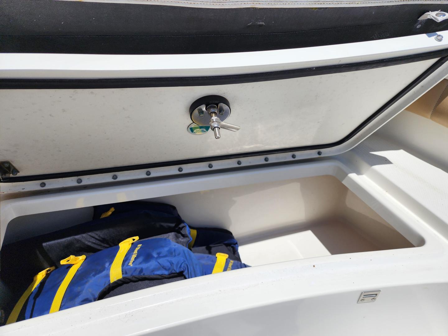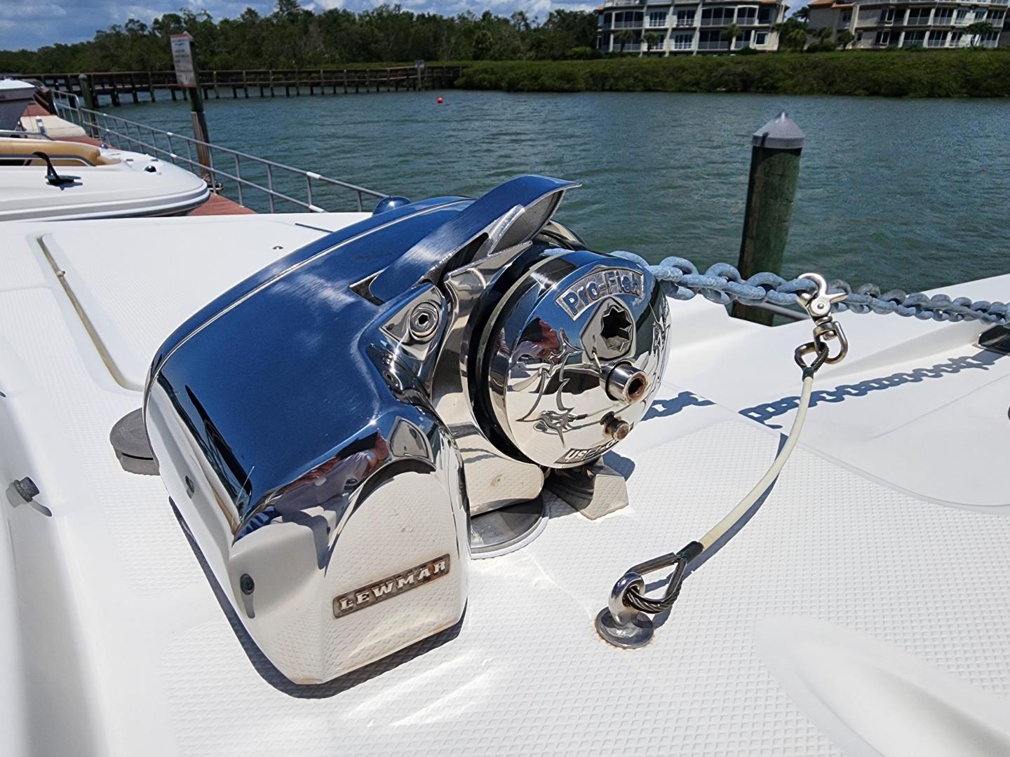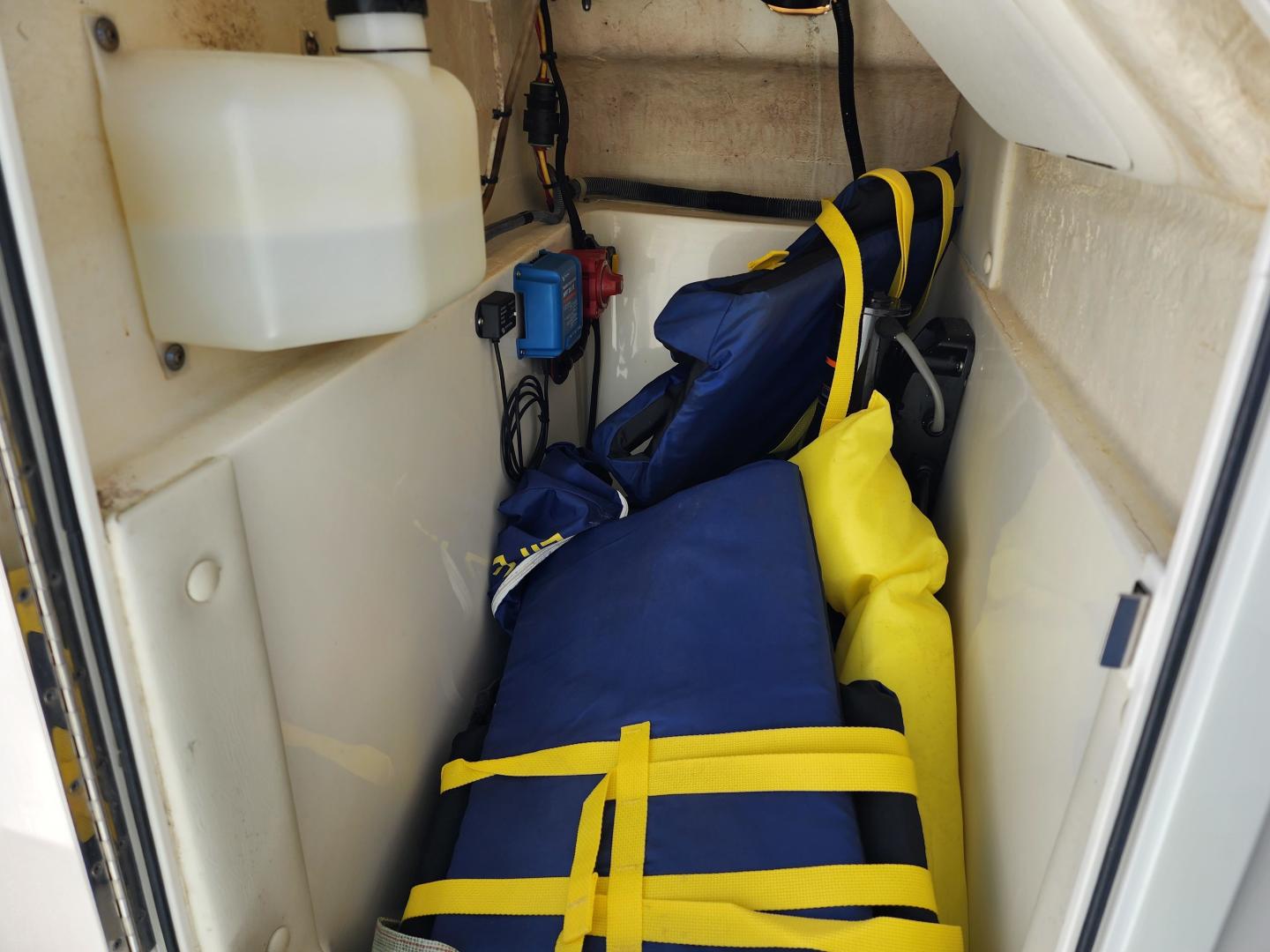Forward of the helm deck to port is a enclosed head with a fresh water toilet, which also has additional storage, to starboard under the helm, there is a storage locker. The fore deck has wrap around seating, with storage underneath, and an insert area for the optional forward filler cushions, or table. Those items are in the original factory wrappers and have been stored in a climate controlled garage. Just forward of the seating are two large storage lockers an electric windlass, with galvanized Delta fast set anchor, galvanized chain with braided rode.