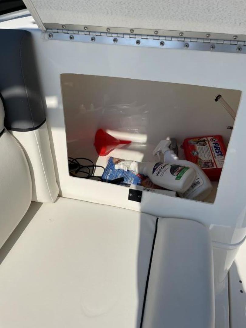 • Innovative portside storage with tote may be replaced with an optional head with privacy curtain.