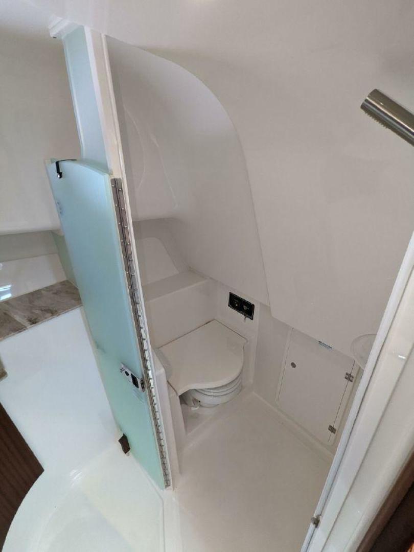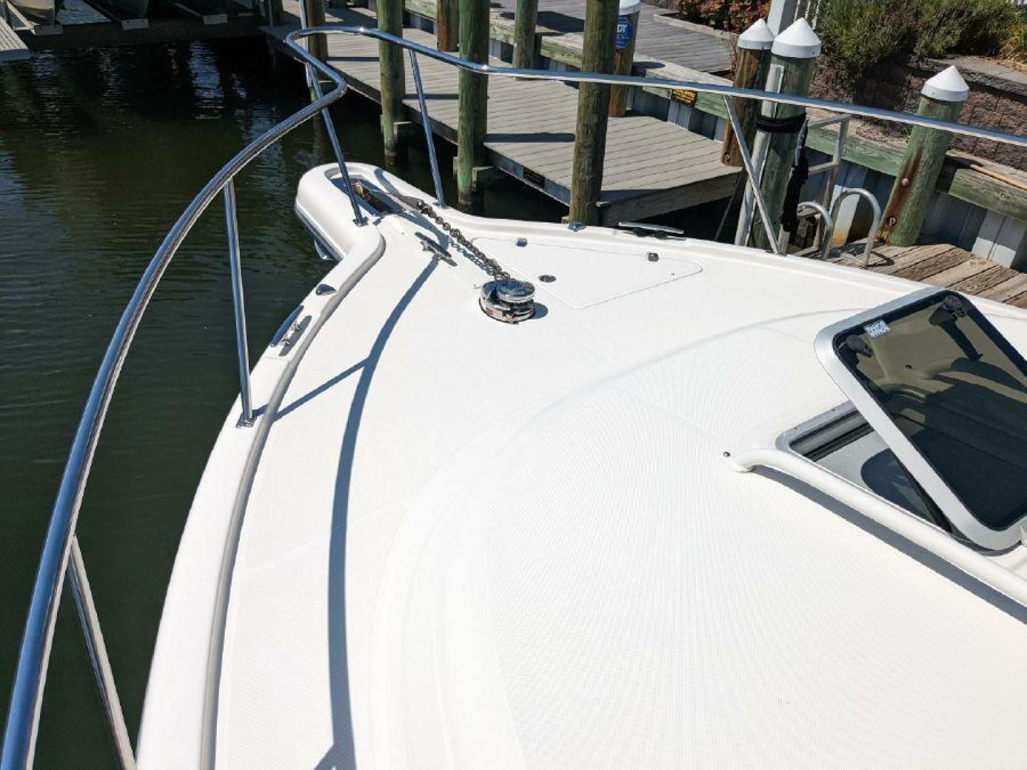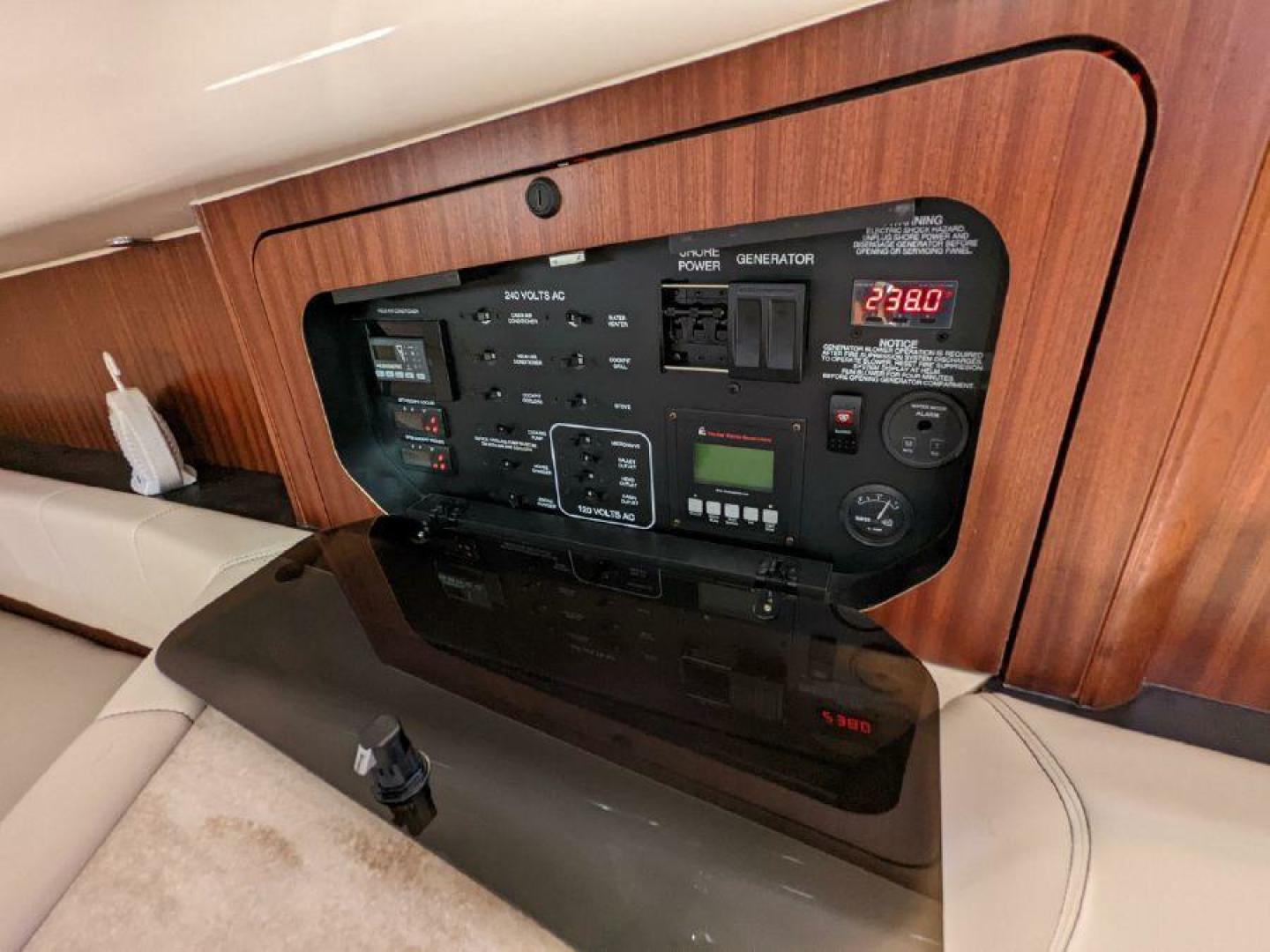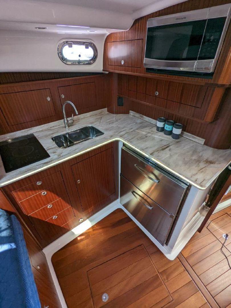 Structural and sound deadening insulation materials matched to proprietary stringer and assembly processes result in one of the quietest cabin environments in the market.Every inch of this boat exudes yacht caliber fit and finish, from its beefy grab rails, to its bow thruster, to its Corian®-countered gourmet kitchen — complete with a two-burner glass stovetop, microwave, 7.5 cubic-foot stainless steel refrigerator/freezer and fiberglass sink with hot and cold pressurized water.