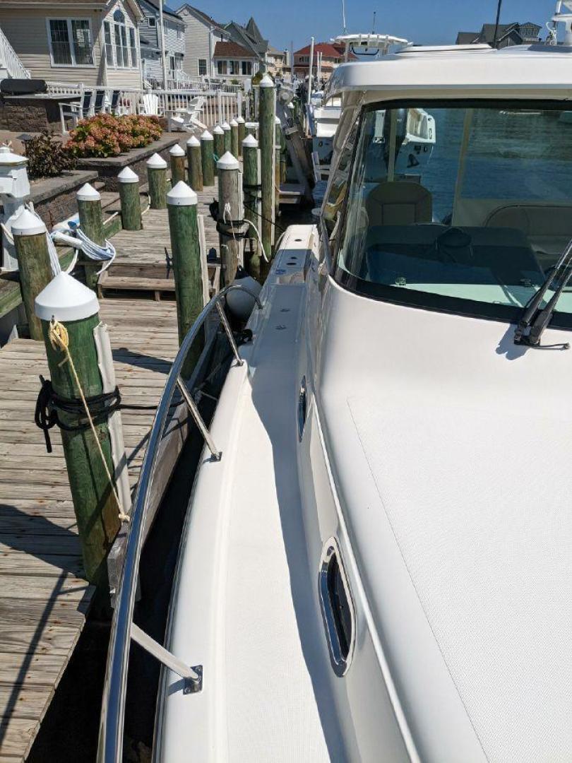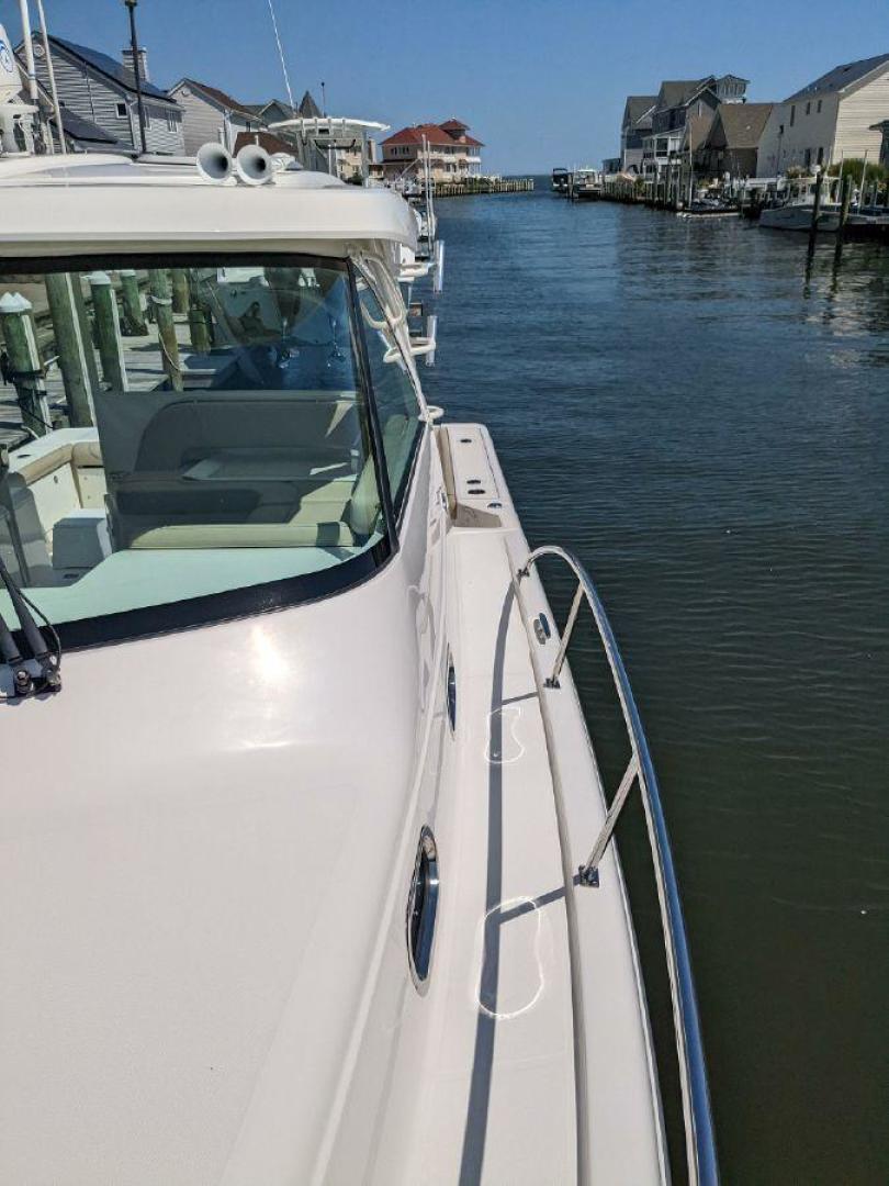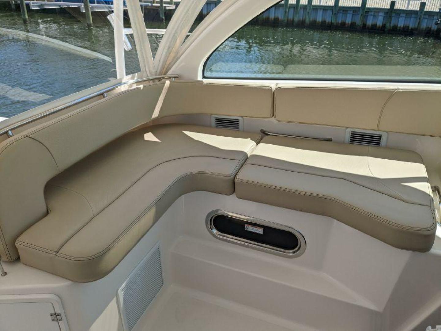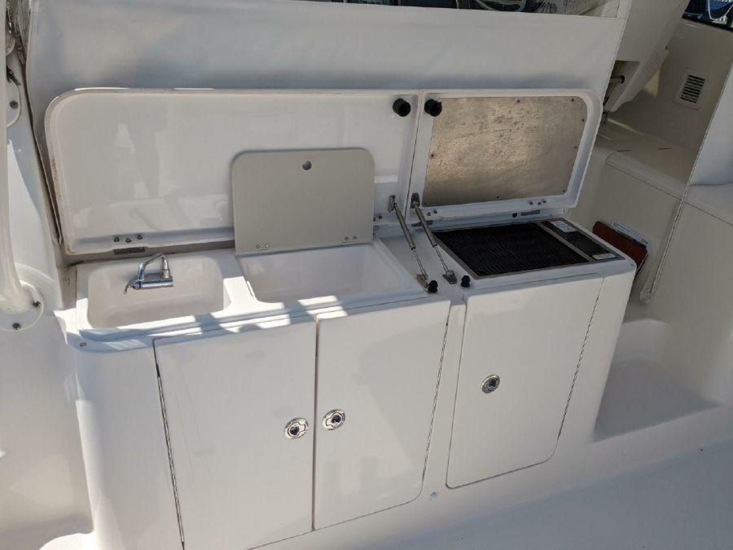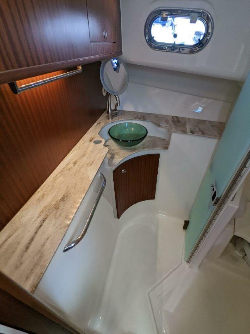 Structural and sound deadening insulation materials matched to proprietary stringer and assembly processes result in one of the quietest cabin environments in the market.Every inch of this boat exudes yacht caliber fit and finish, from its beefy grab rails, to its bow thruster, to its Corian®-countered gourmet kitchen — complete with a two-burner glass stovetop, microwave, 7.5 cubic-foot stainless steel refrigerator/freezer and fiberglass sink with hot and cold pressurized water.