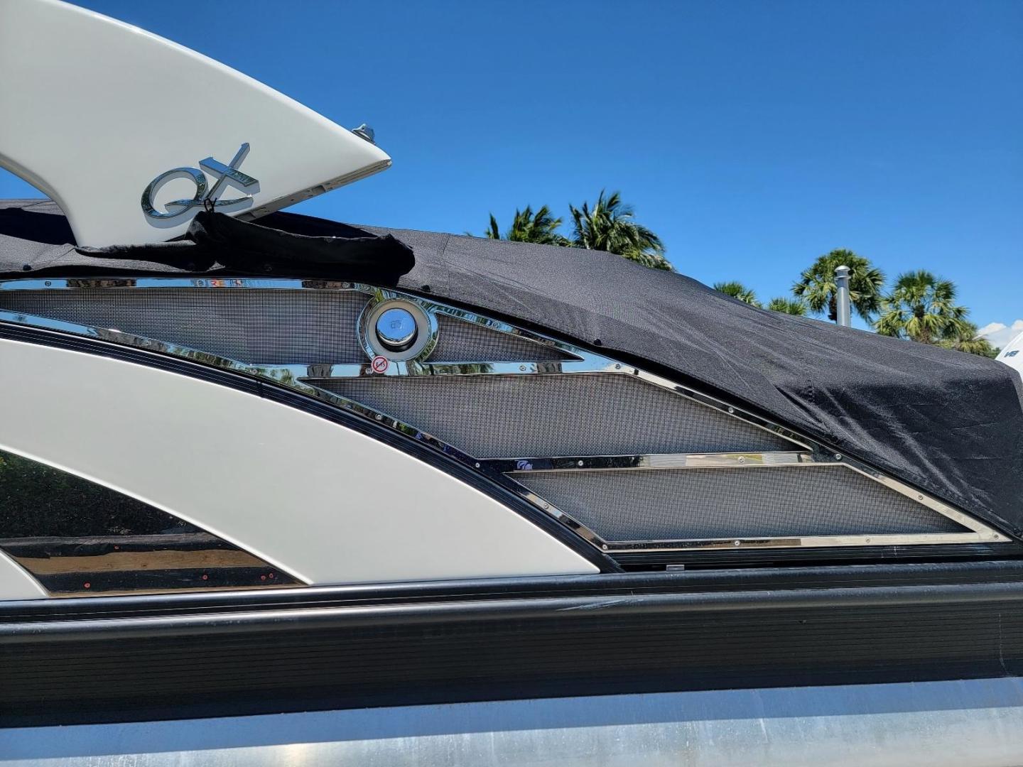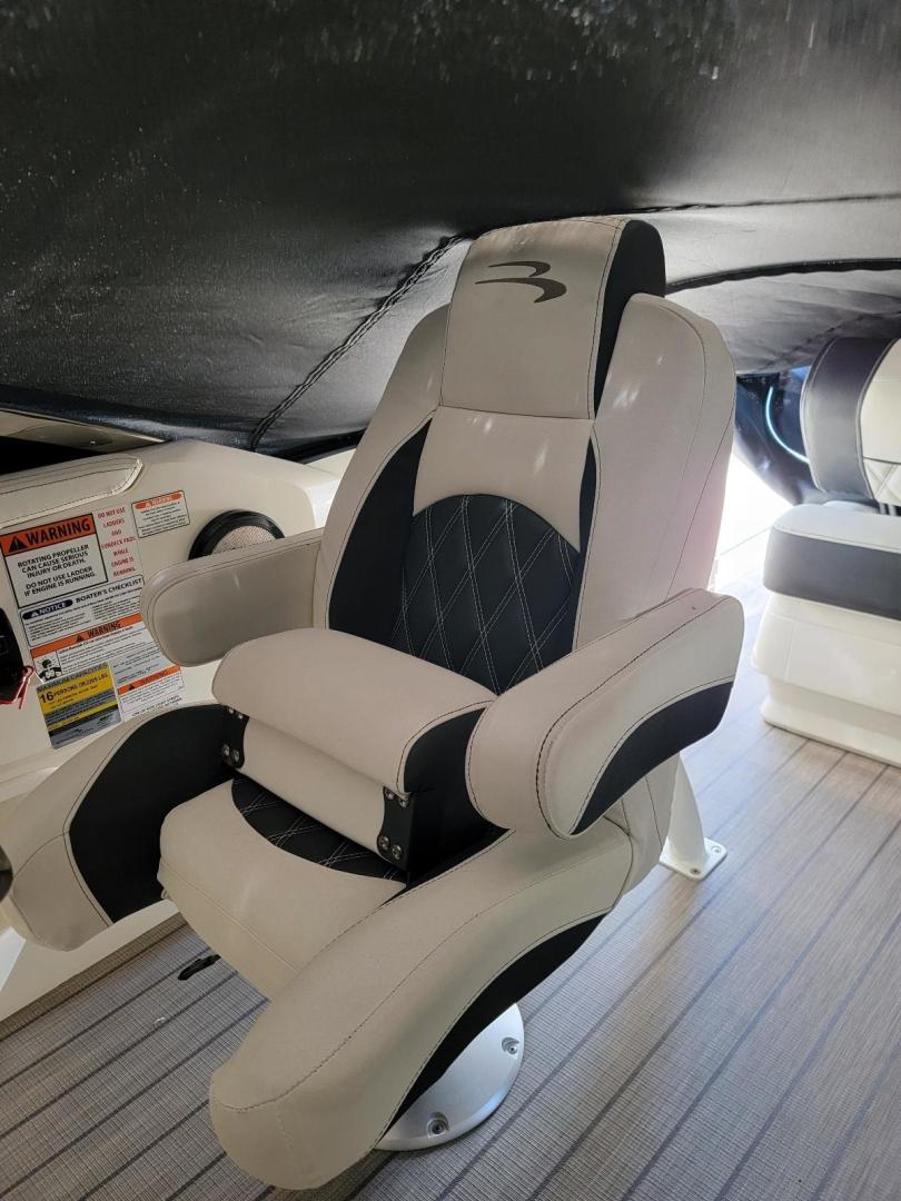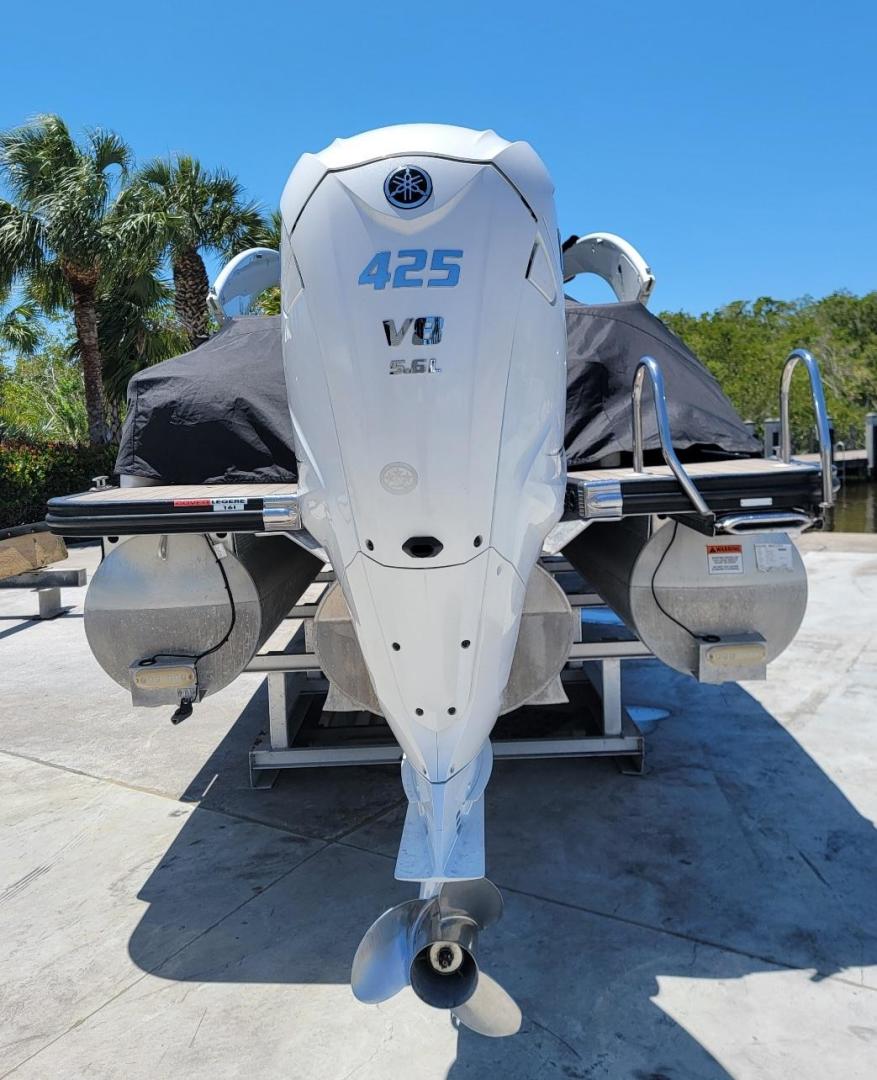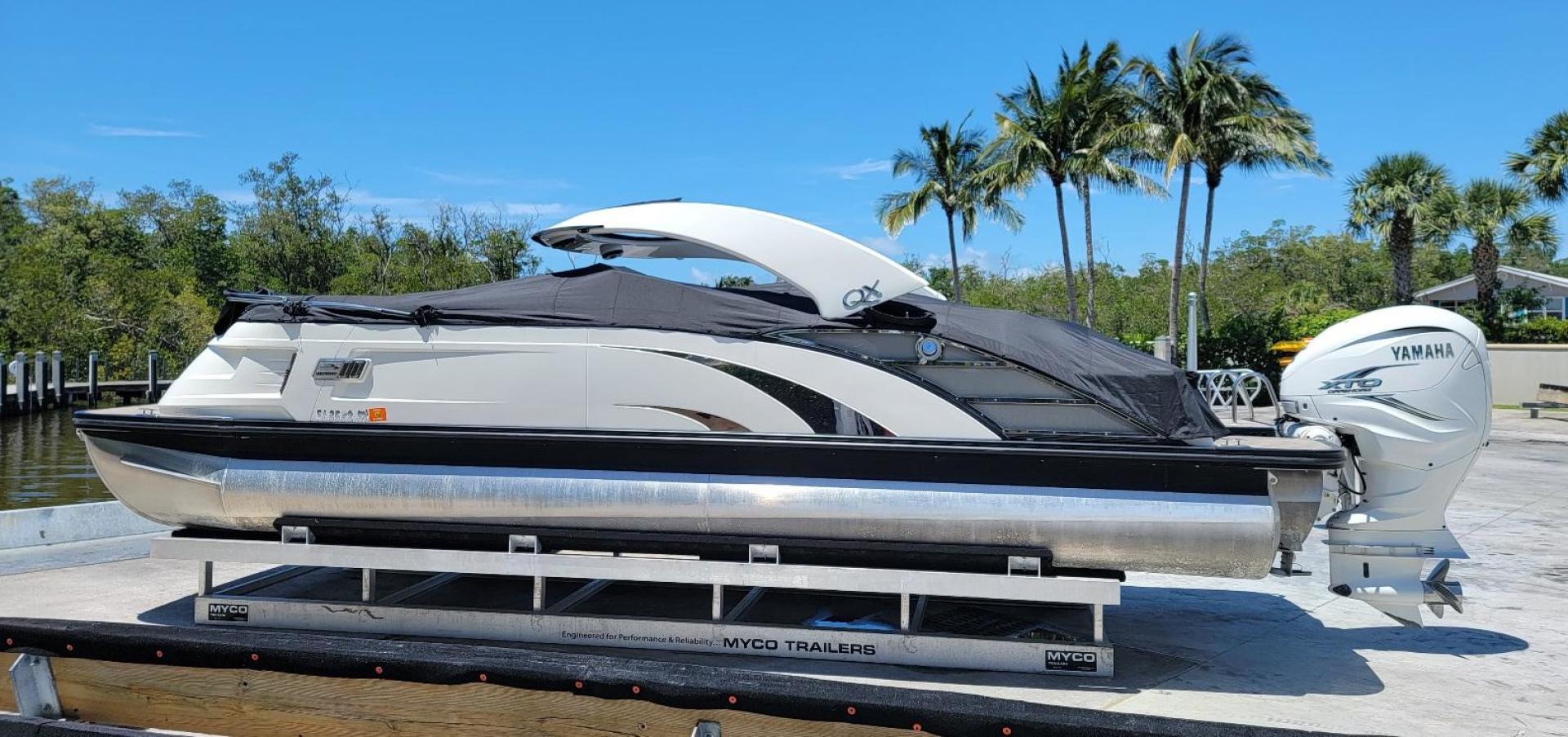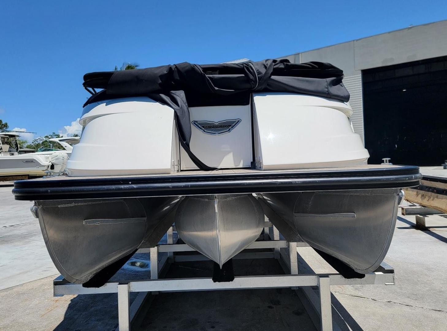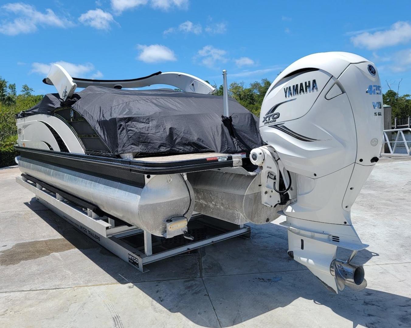 Bennington 25 QX White full molded deck area, Folding sport arch, Bimini tops off arch, full cover, Deluxe seating in white and grey and black, Yamaha 425 with 41.5 hours, Full tri toon hulls, Teak Weave flooring, Stereo, Porto potty, Depth finder and much more. Get superb luxury with top notch performance in this high styled tri toon.
