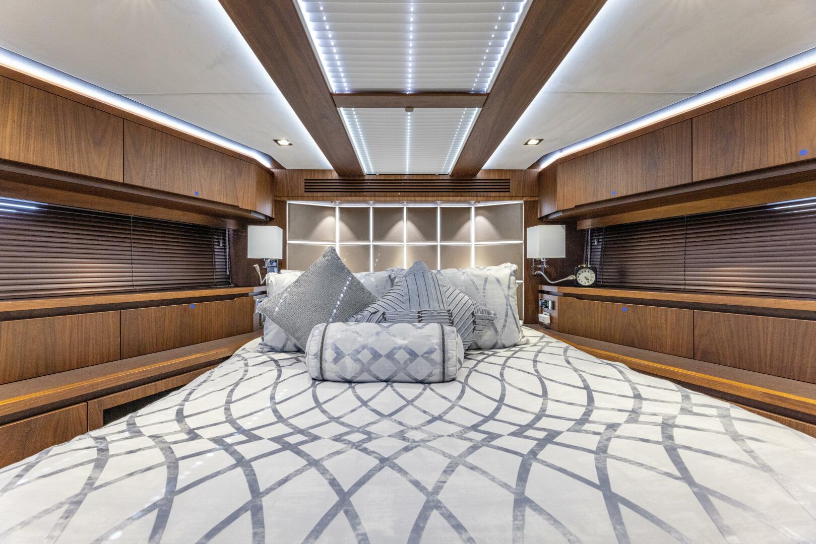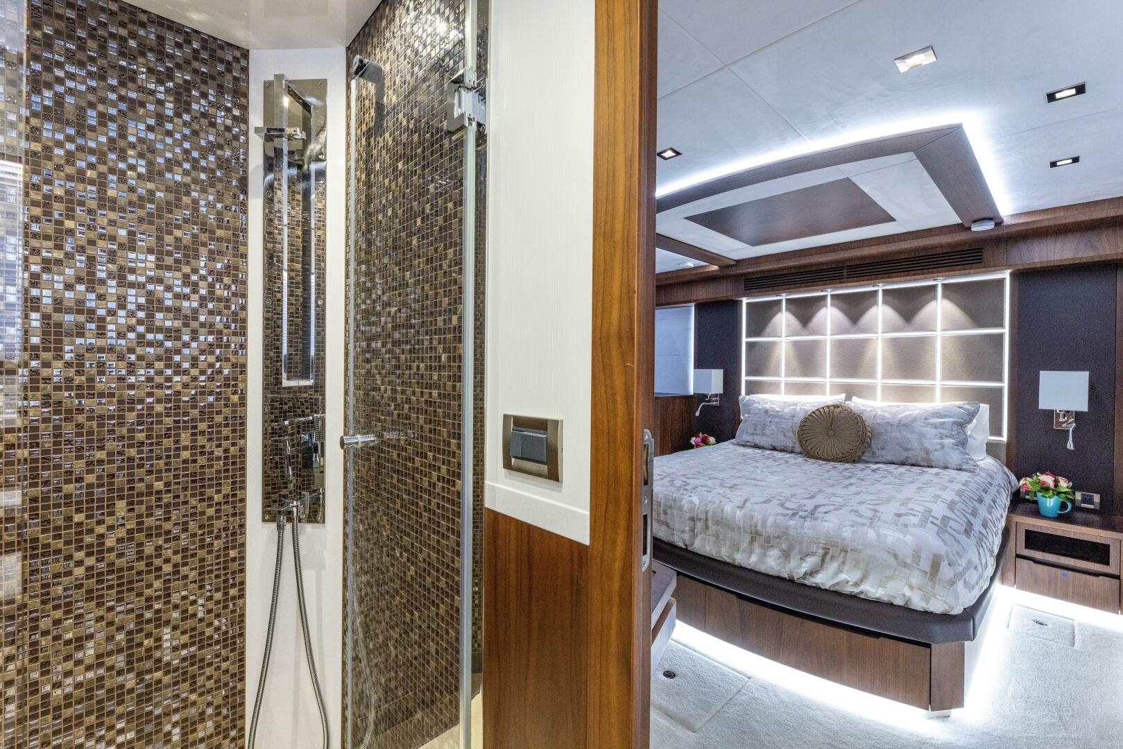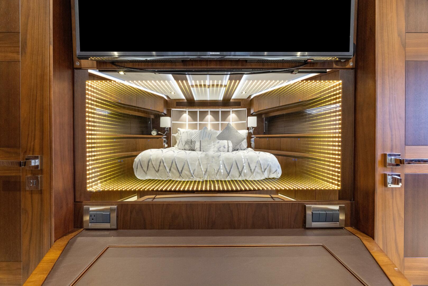 The top deck is enlarged to offer a generous dining space, a full-sized bar and plenty of lounge space surrounding the steering console. The bow deck area can be approached by the revolutionary, electric front window entrance revealing two separate movable sofas with integrated foldable tables for sundeck purpose. Serve the area from a nearby wine bar to further impress your guests. Everyone’s favorite Beach Mode makes a welcome reappearance, fitted with six meter long balconies with partially glazed floors and a breakfast bar on both sides.