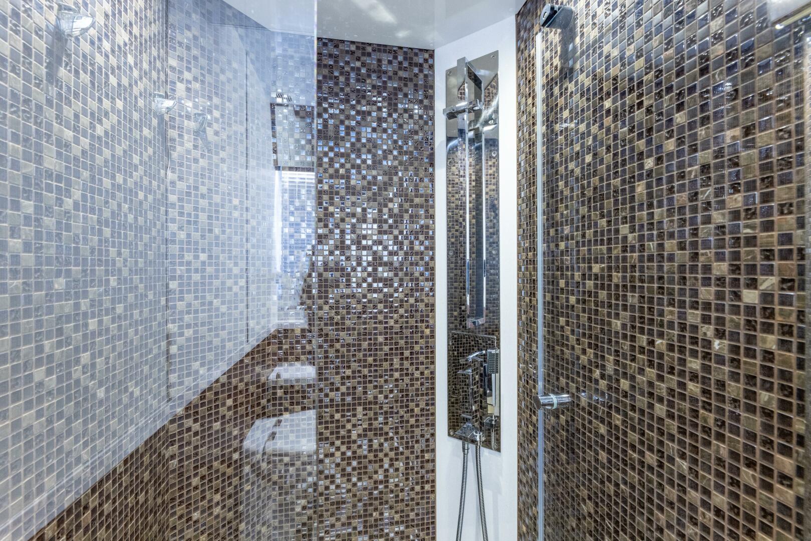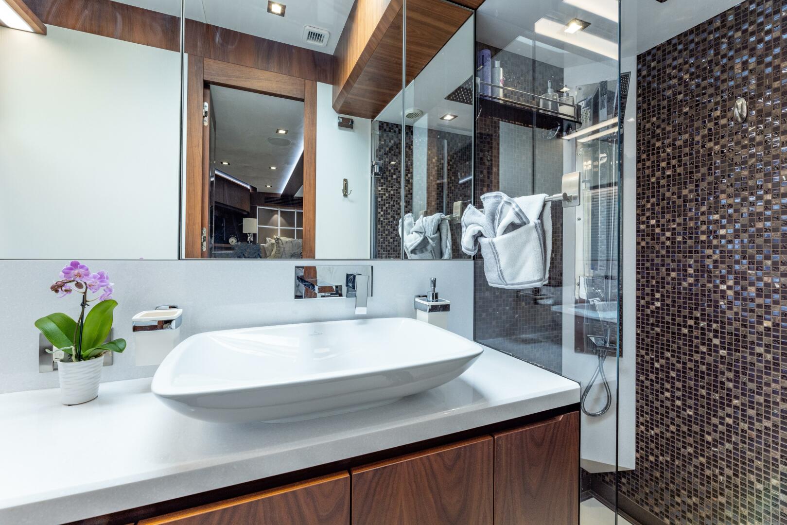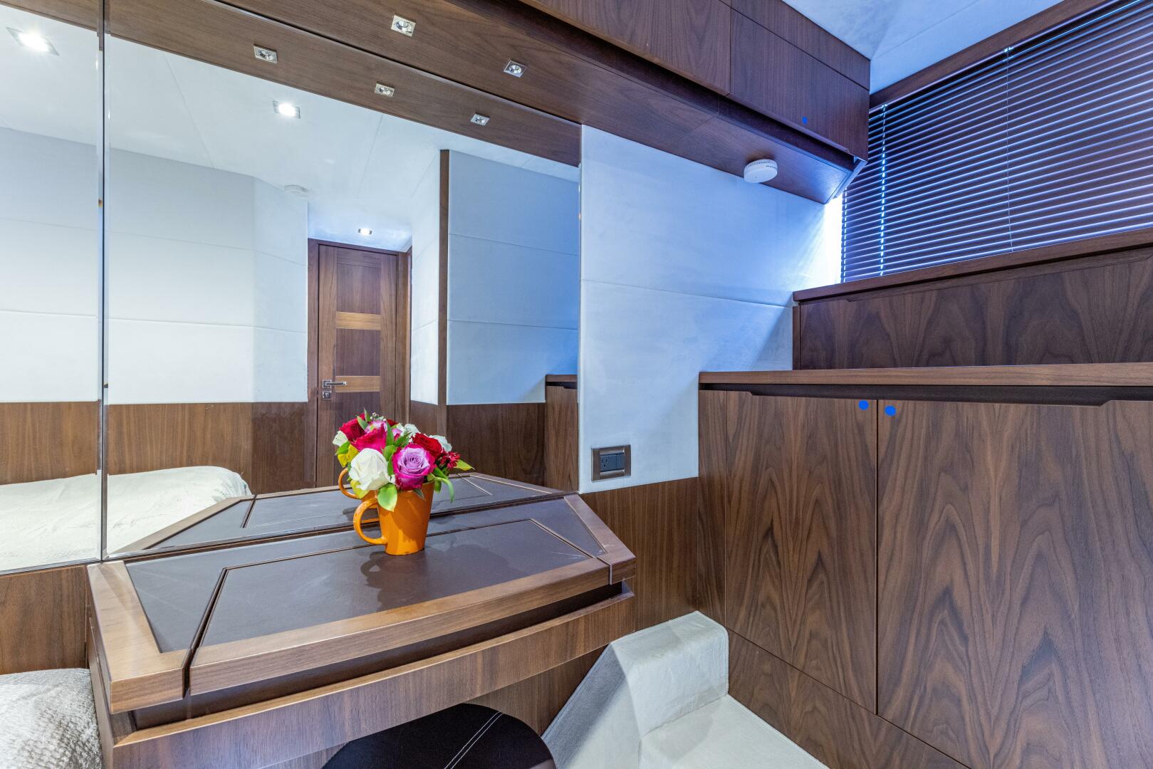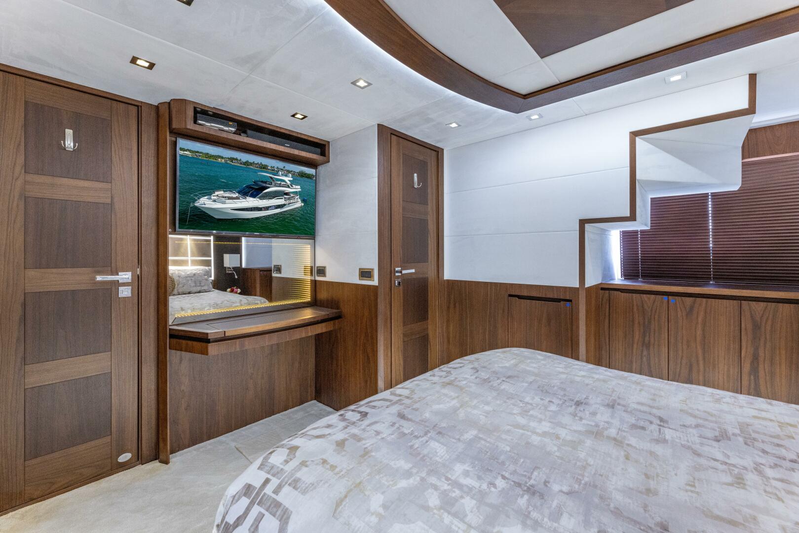 The top deck is enlarged to offer a generous dining space, a full-sized bar and plenty of lounge space surrounding the steering console. The bow deck area can be approached by the revolutionary, electric front window entrance revealing two separate movable sofas with integrated foldable tables for sundeck purpose. Serve the area from a nearby wine bar to further impress your guests. Everyone’s favorite Beach Mode makes a welcome reappearance, fitted with six meter long balconies with partially glazed floors and a breakfast bar on both sides.