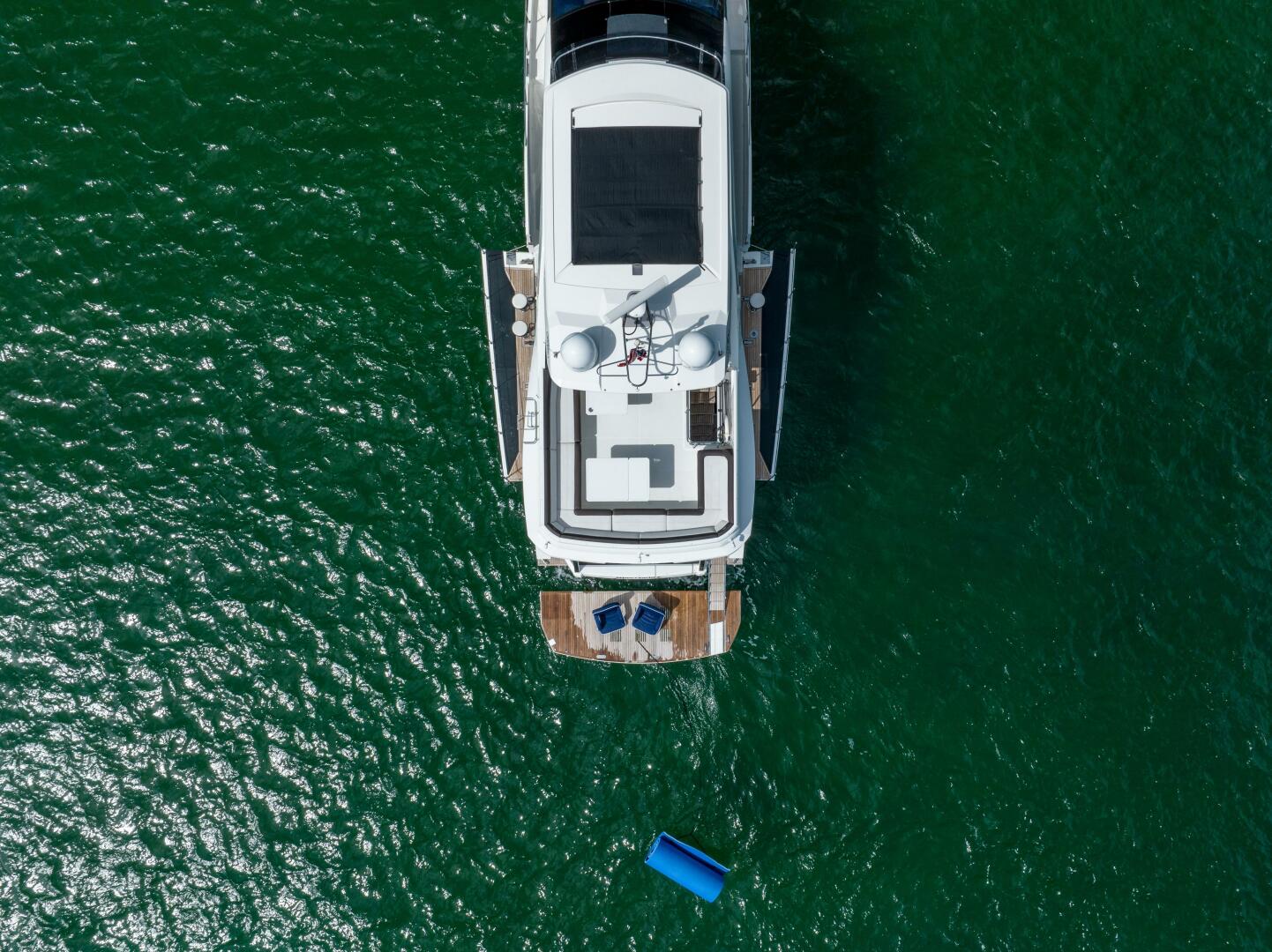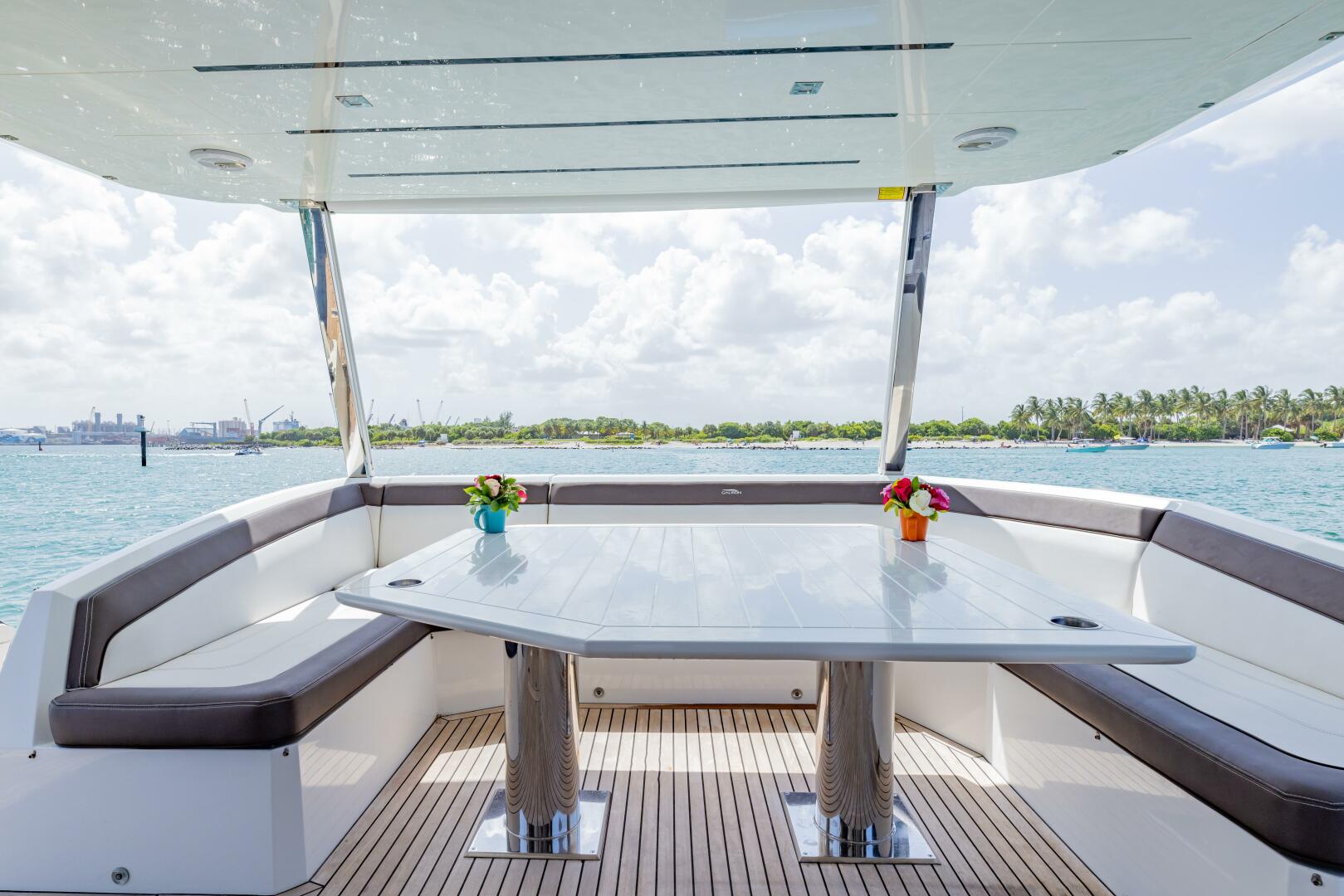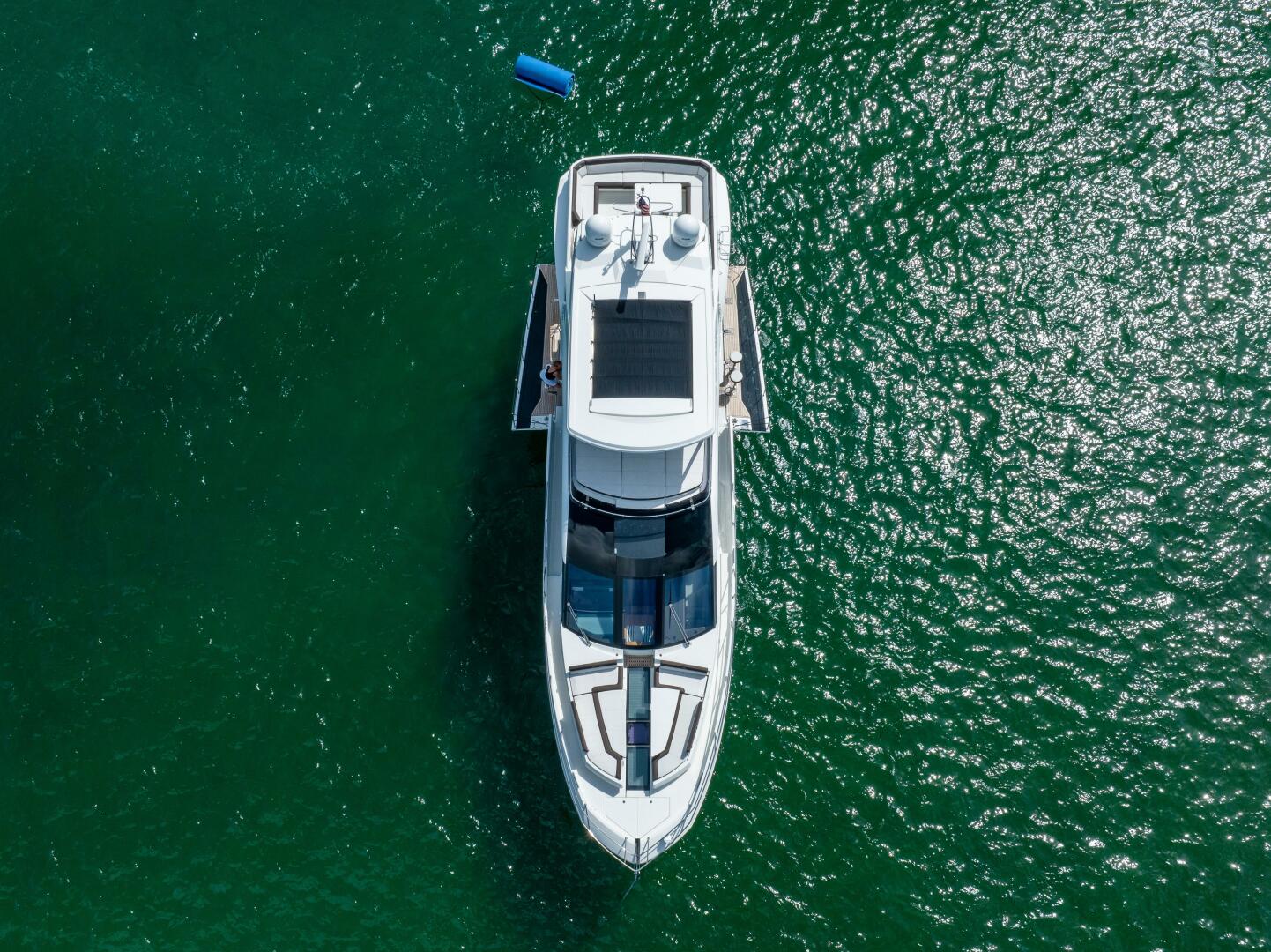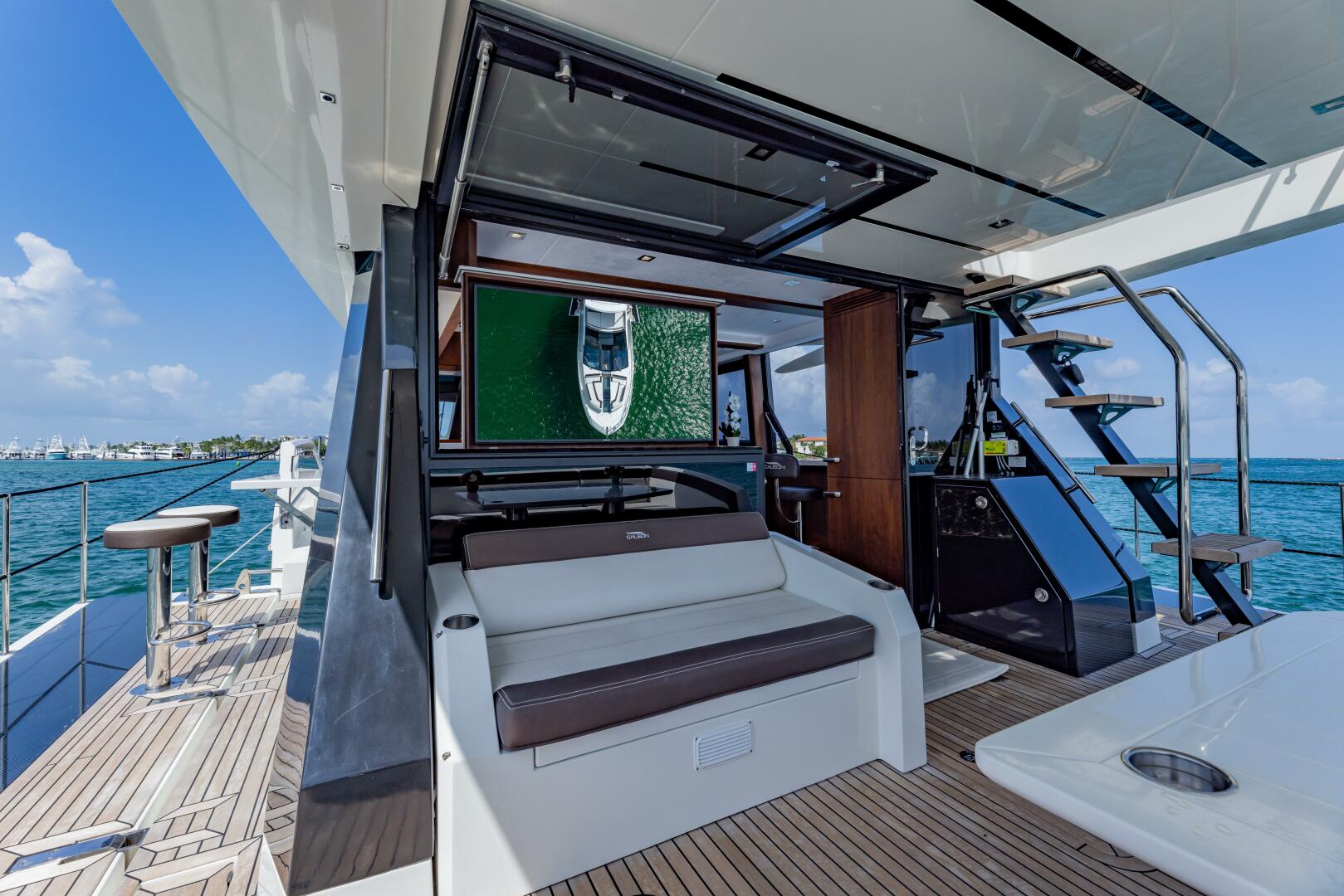 Outside, the aft cockpit dining area holds eight people who can enjoy an entertainment system with a 40 inch TV sliding up from the kitchen top, all while protected from the elements by the electric aft sunshade. Further back, find the hydraulic bath platform capable of handling all water paraphernalia and a convenient access to a large skipper cabin.