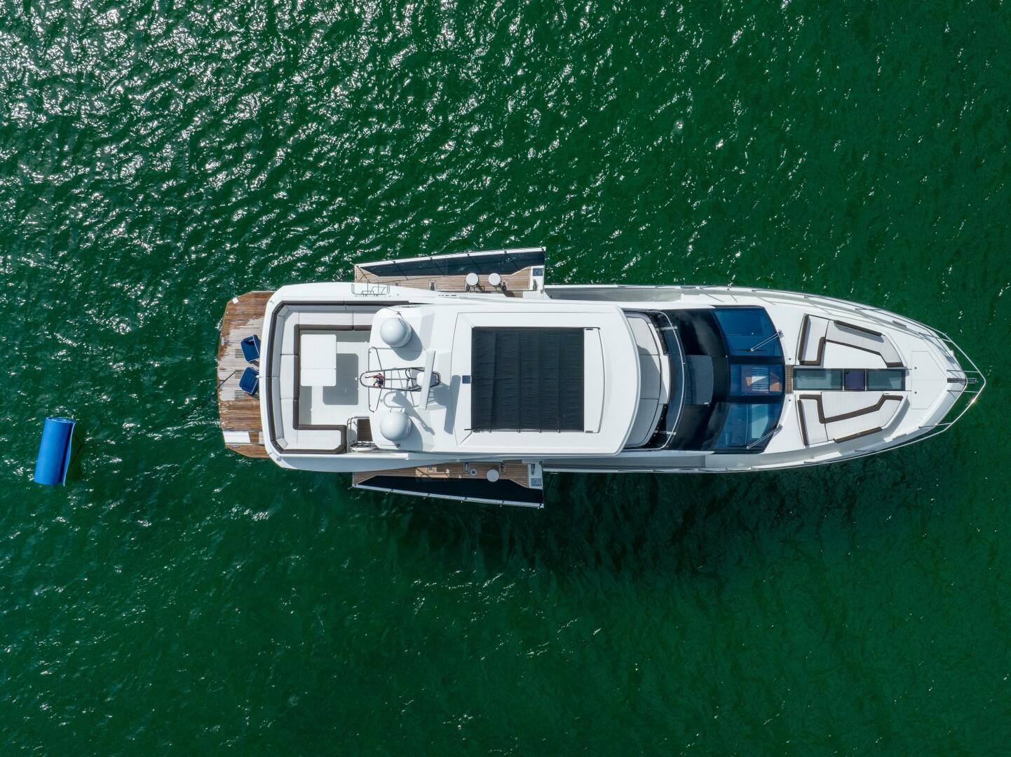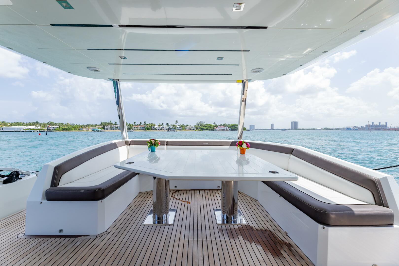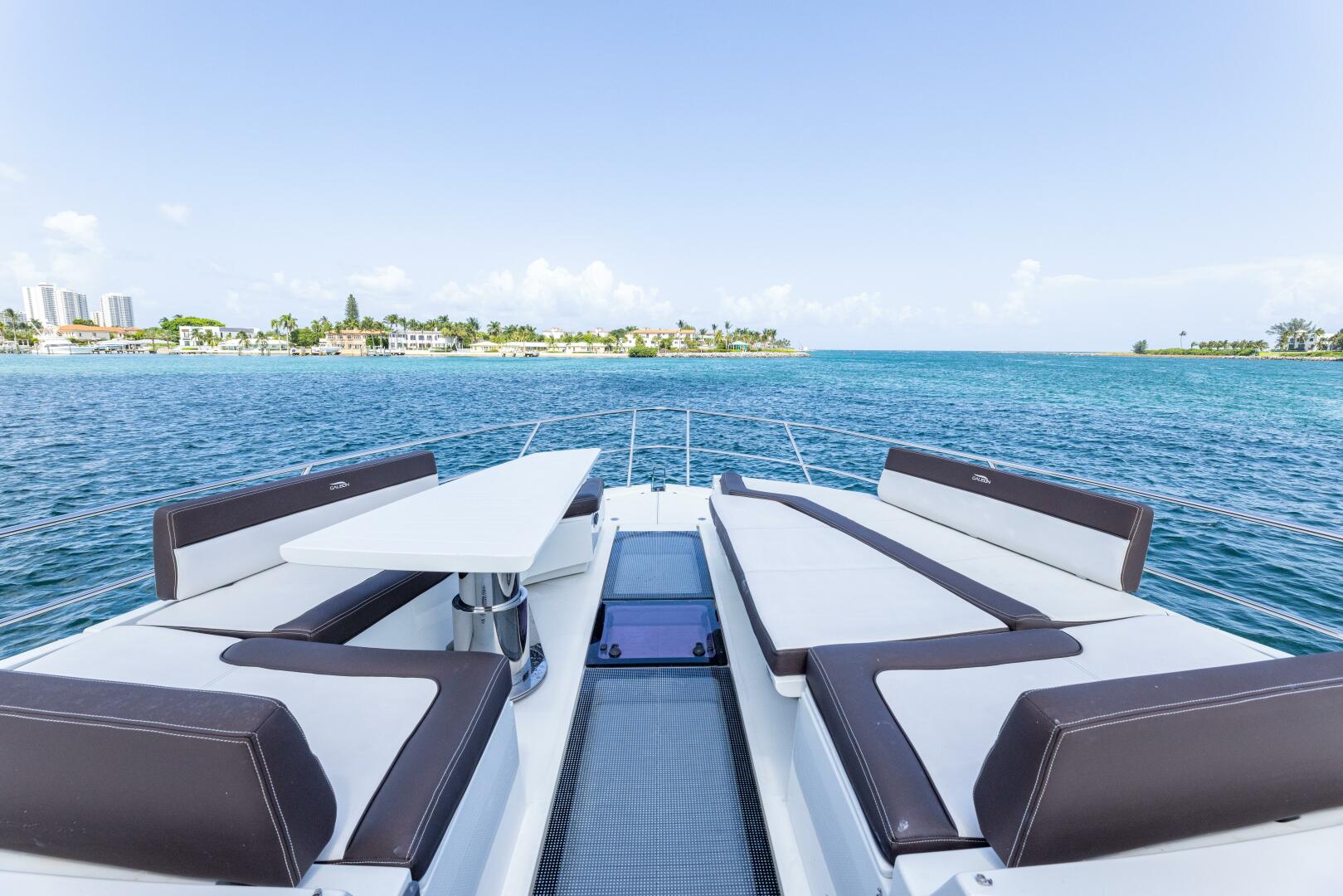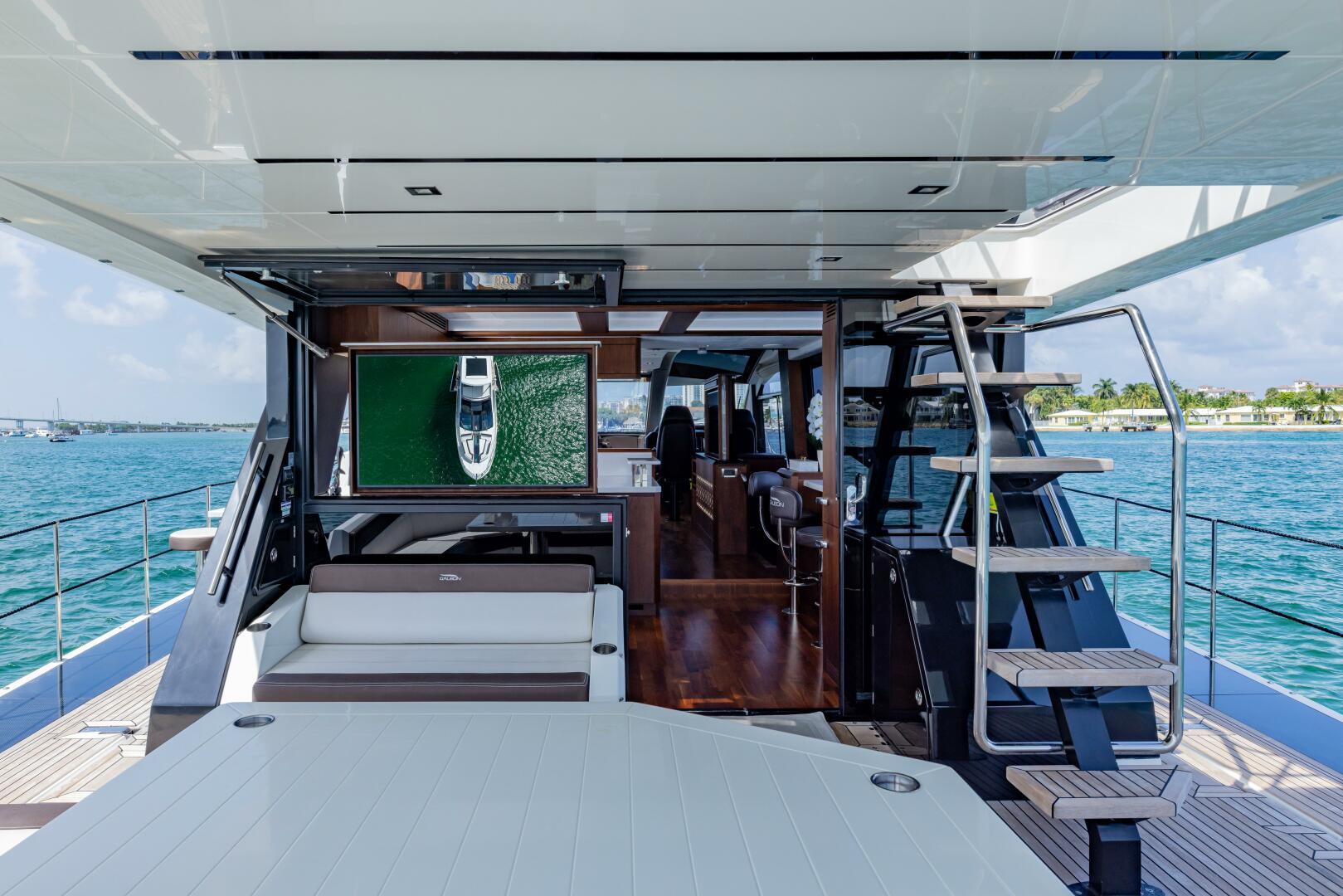 Outside, the aft cockpit dining area holds eight people who can enjoy an entertainment system with a 40 inch TV sliding up from the kitchen top, all while protected from the elements by the electric aft sunshade. Further back, find the hydraulic bath platform capable of handling all water paraphernalia and a convenient access to a large skipper cabin.