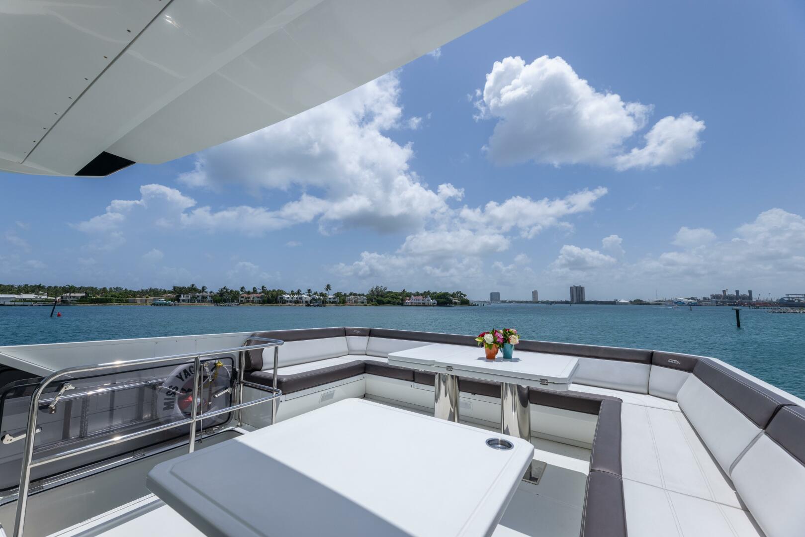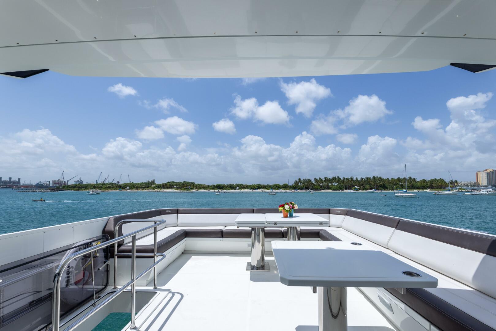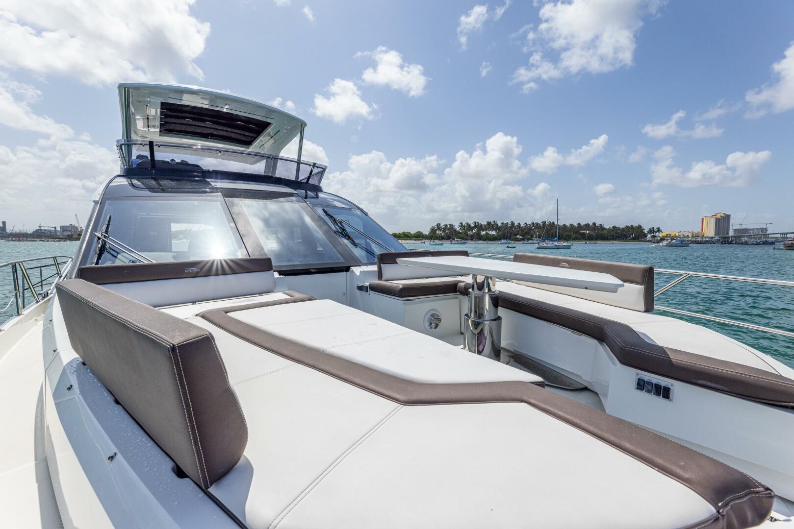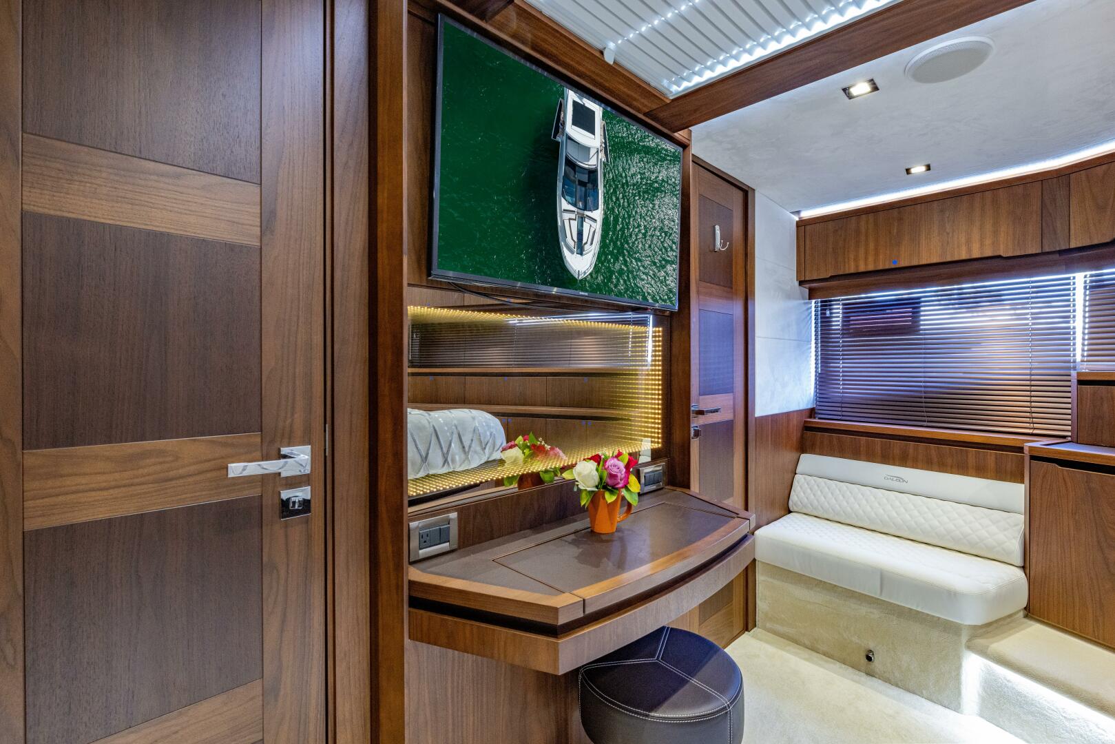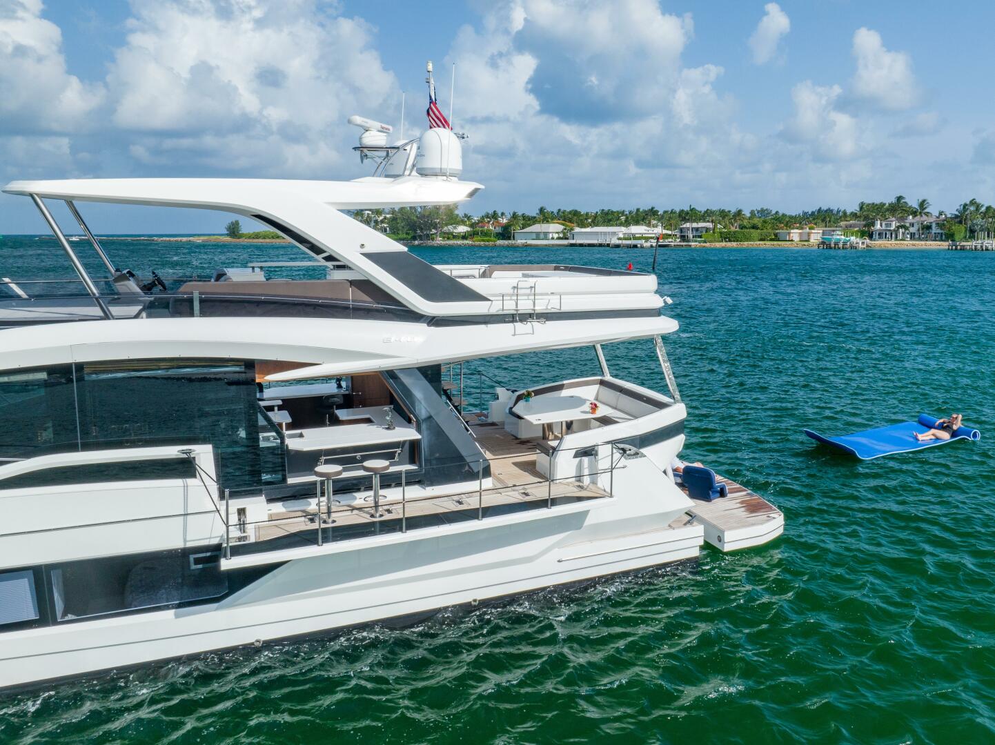 Outside, the aft cockpit dining area holds eight people who can enjoy an entertainment system with a 40 inch TV sliding up from the kitchen top, all while protected from the elements by the electric aft sunshade. Further back, find the hydraulic bath platform capable of handling all water paraphernalia and a convenient access to a large skipper cabin.