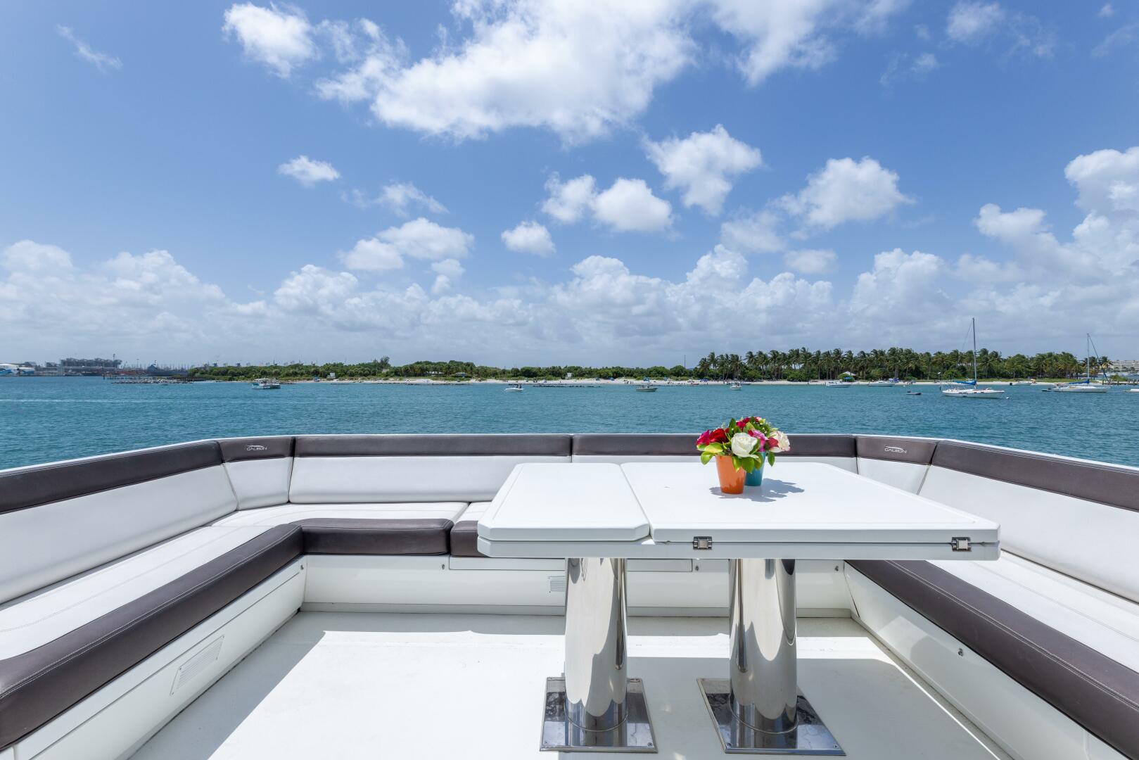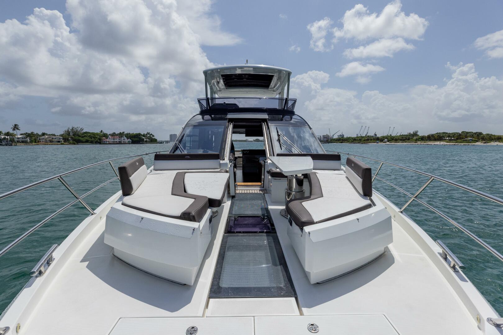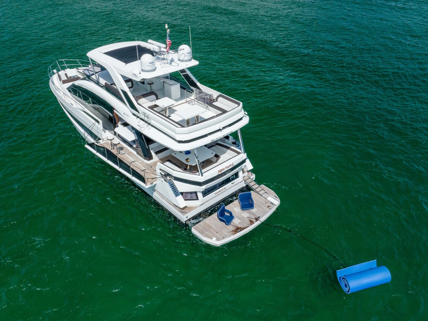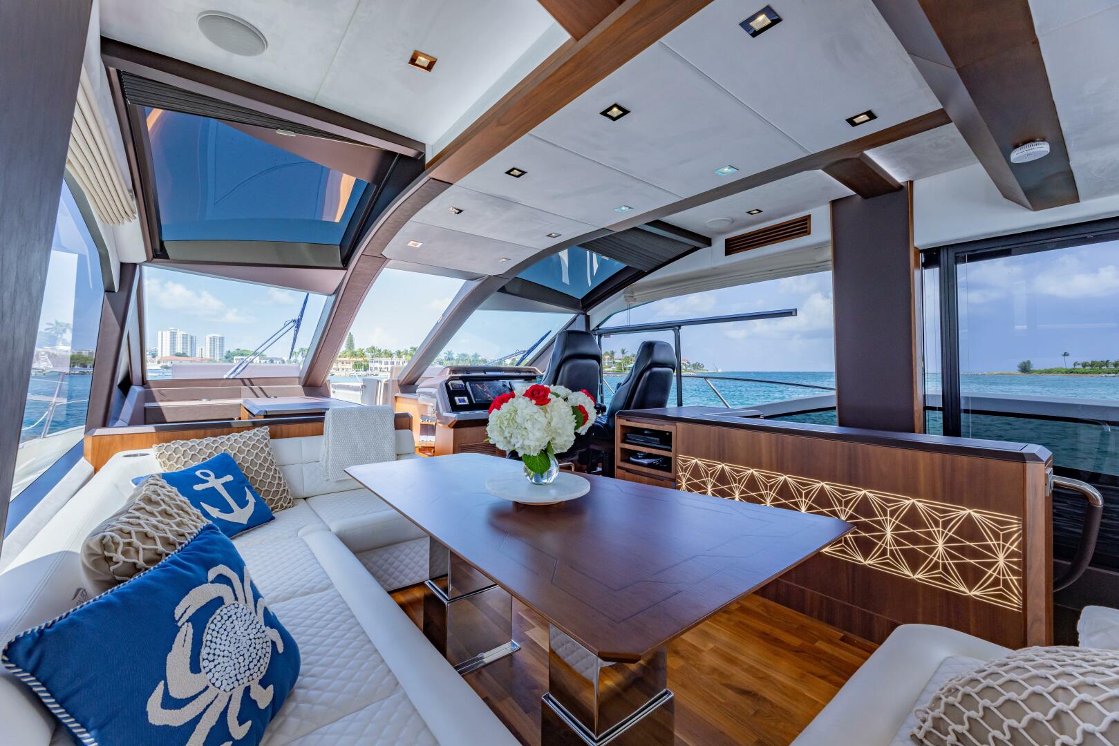 Outside, the aft cockpit dining area holds eight people who can enjoy an entertainment system with a 40 inch TV sliding up from the kitchen top, all while protected from the elements by the electric aft sunshade. Further back, find the hydraulic bath platform capable of handling all water paraphernalia and a convenient access to a large skipper cabin.