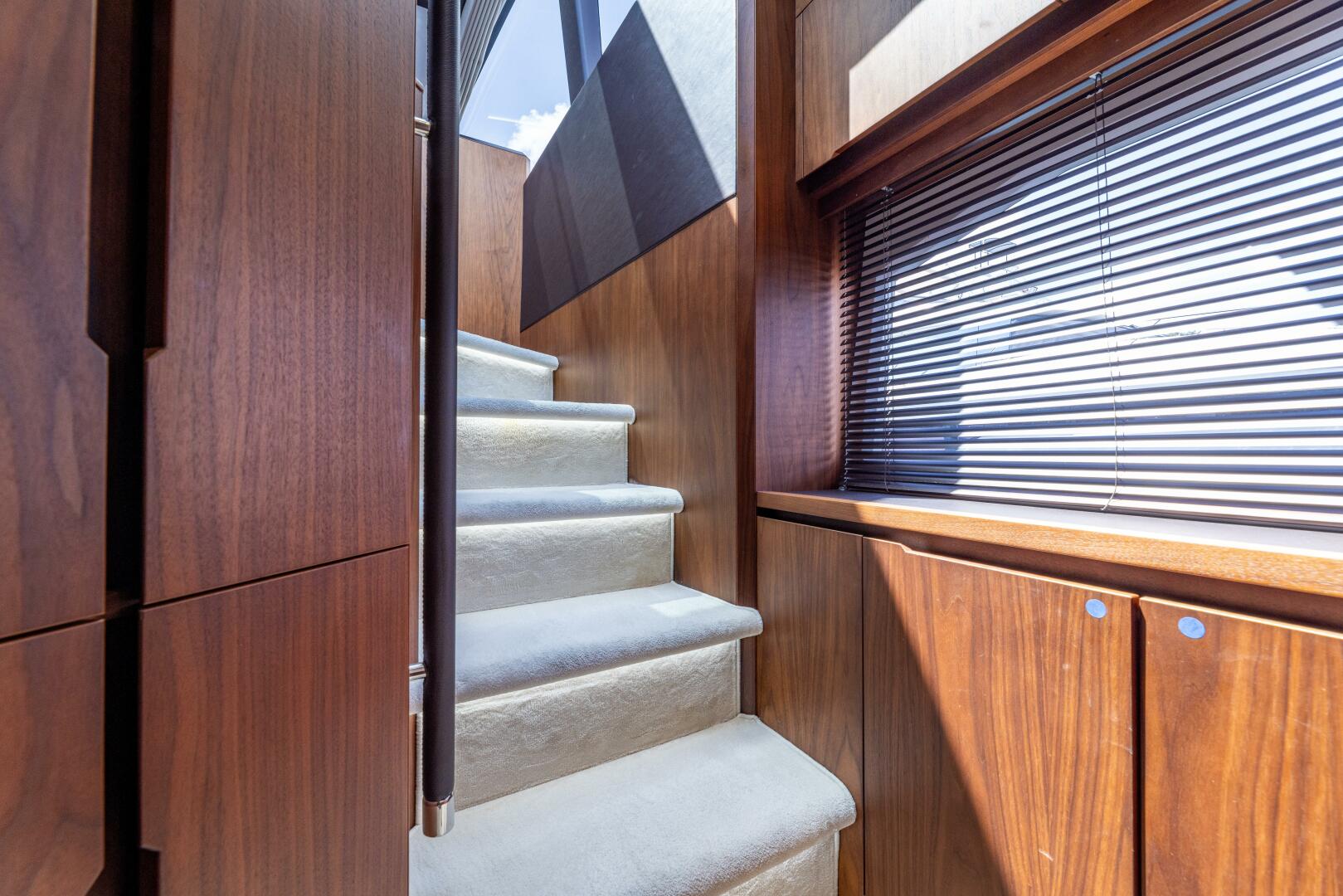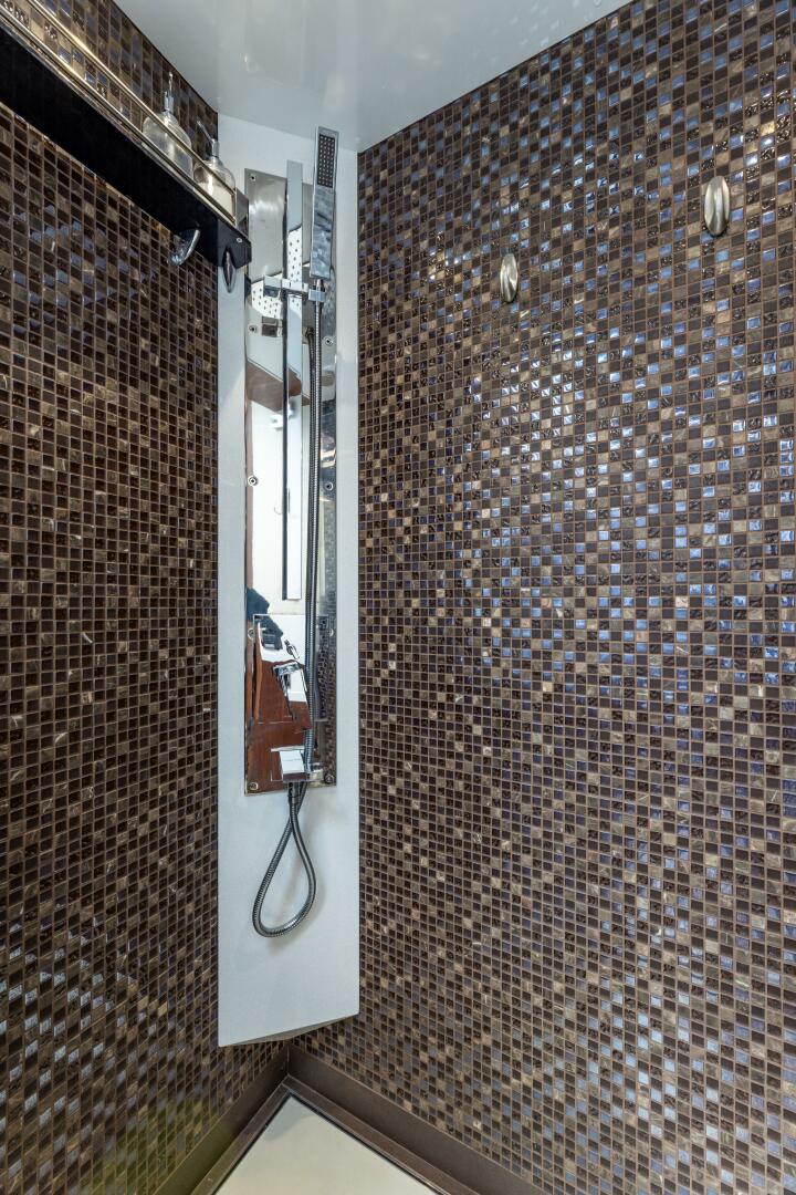 The spacious crew's quarters are entered from the swim platform with upper and lower berths, microwave, enclosed head compartment, washer and separate dryer and access to the engine room.