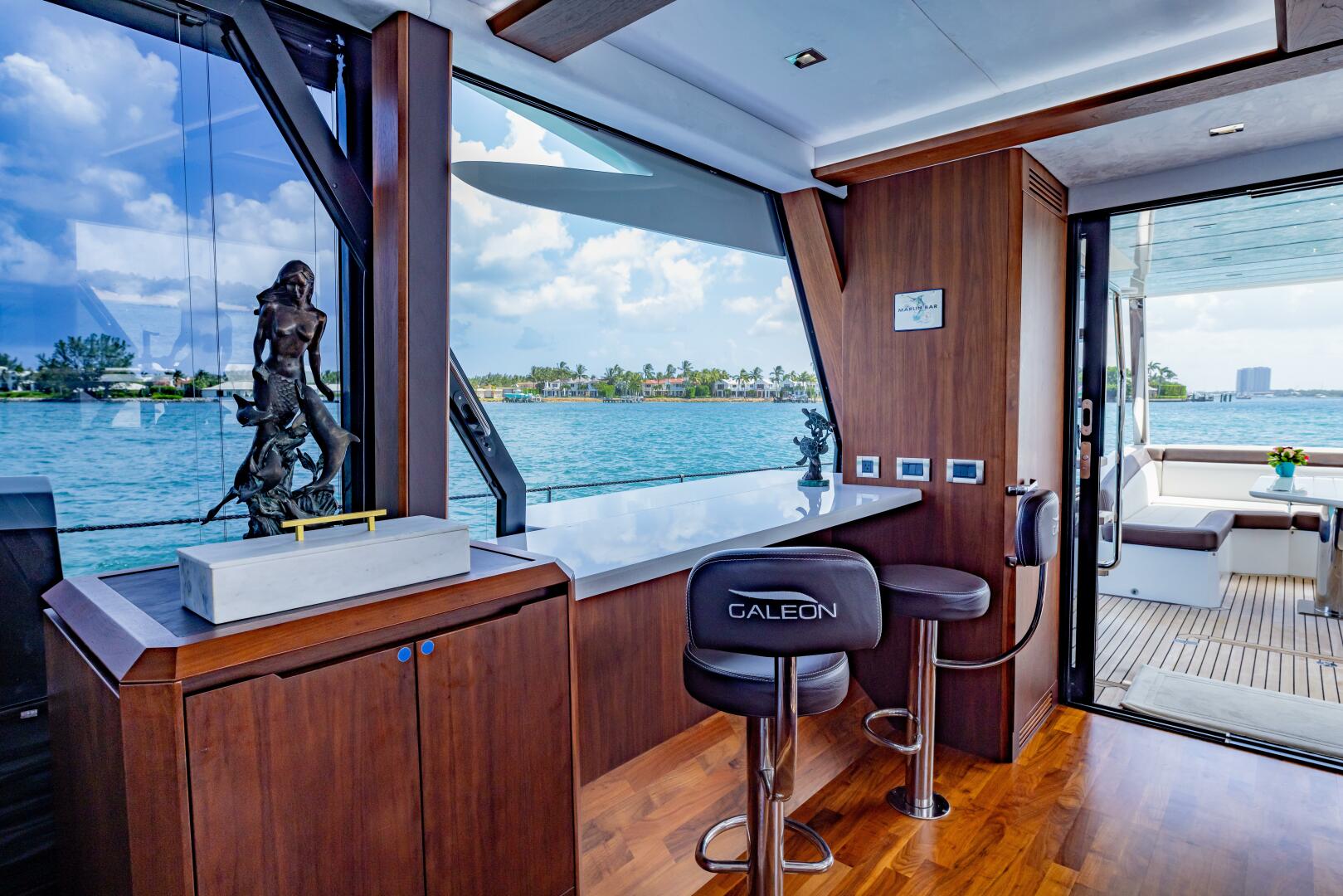 The Galeon 640 Fly is a Euro style motor yacht with many unique features. From the very large flybridge with factory hardtop to the spacious cockpit, "drop down side decks", foredeck seating/tables and hydraulic swim platform. Her exterior offers excellent entertainment areas for everyone.