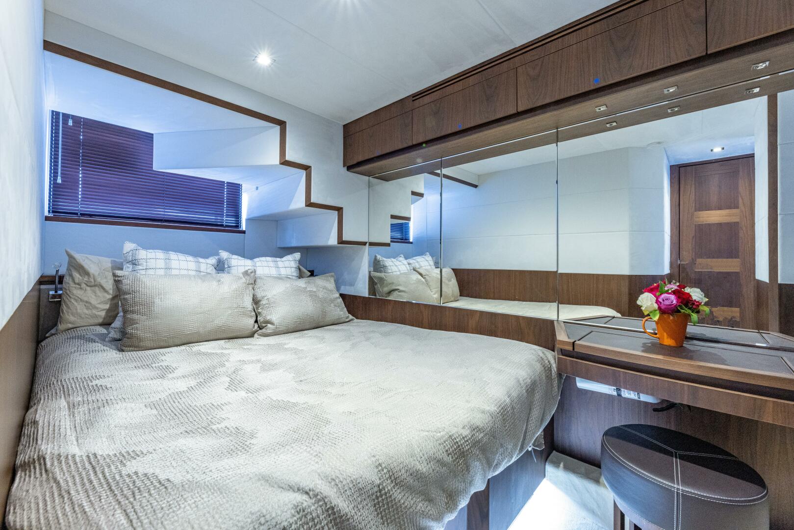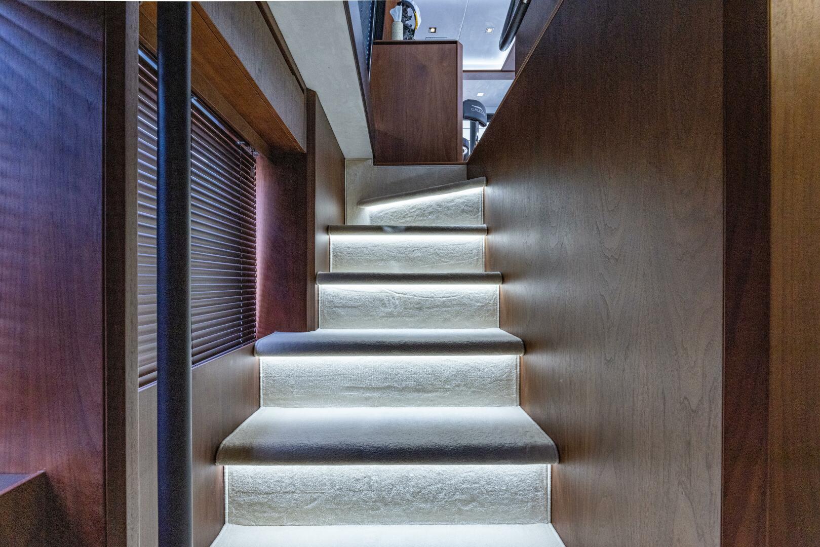 Equip the cockpit area with a rotating sofa option with a 3,2 m tender garage below to completely separate your yacht from the pack. Inside find extensive lounge and dinner areas with openable side windows next to the bar and steering station. Thanks to the innovatory, two-way stair system, a three full-beam cabin layout was made possible for extra privacy and comfort. A four cabin layout is sure to please enlarged families and charter enthusiasts.