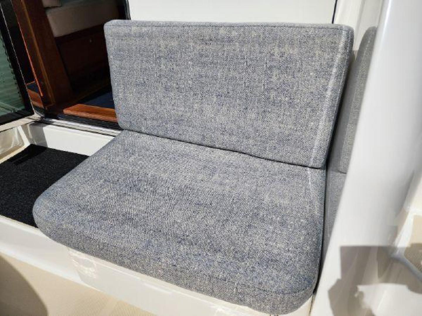 - “L” settee to port with storage and Sabre tool drawer beneath. 5” foam cushions covered with Sunbrella fabric