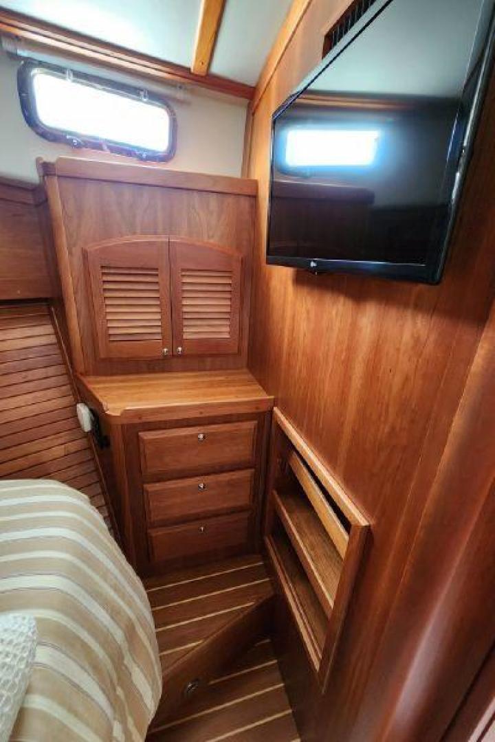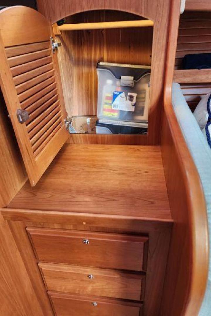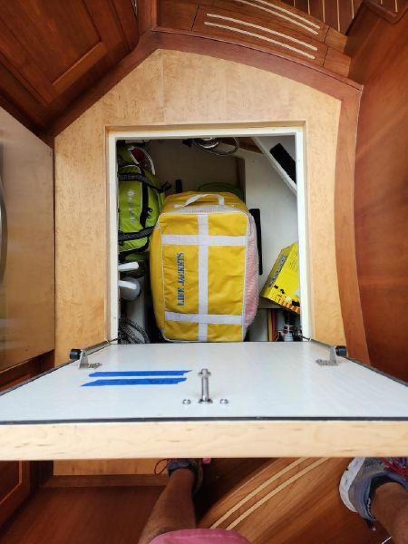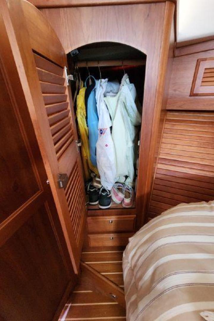 - Large cedar lined hanging locker to port, with louvered door, shelf and hangar pole