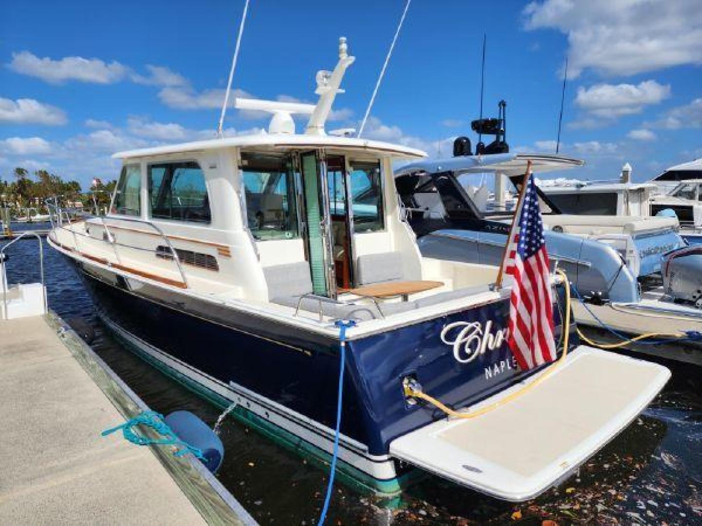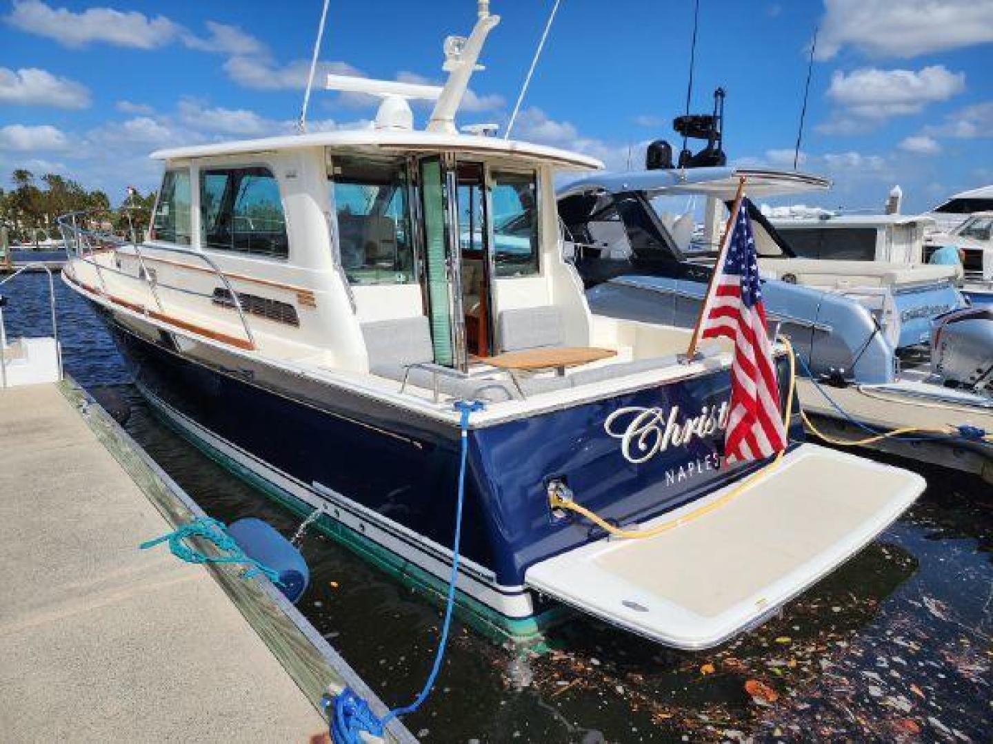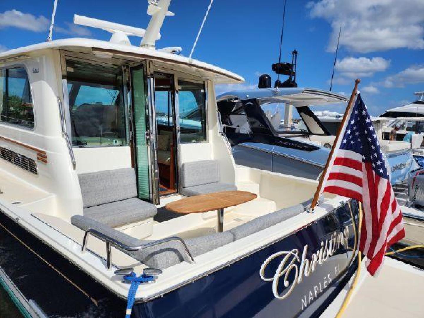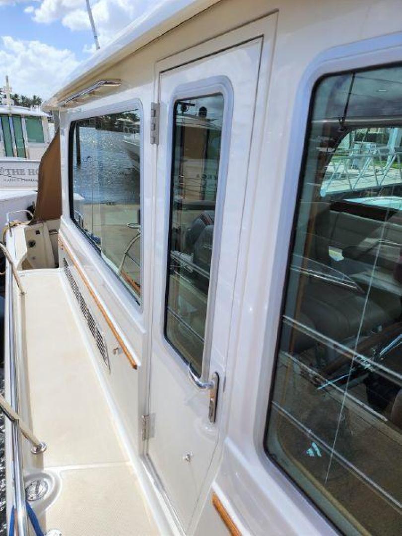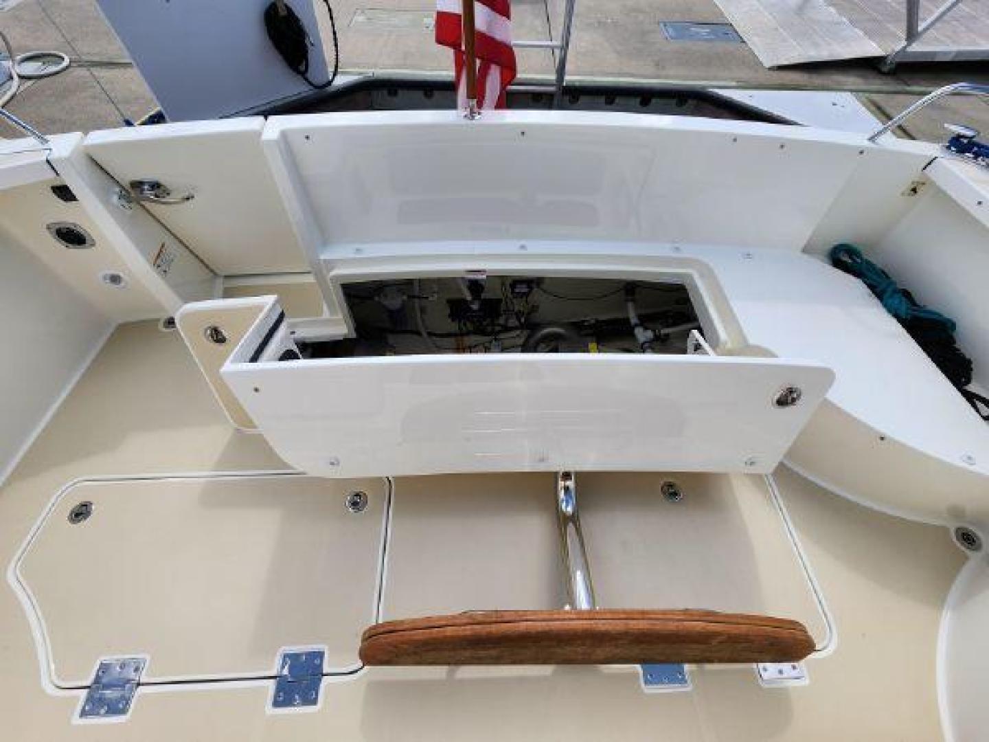 - Hinged access door to side deck at helm