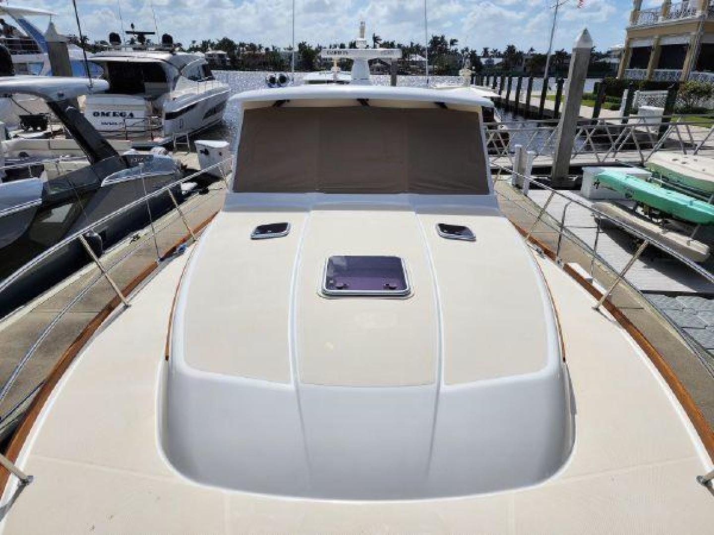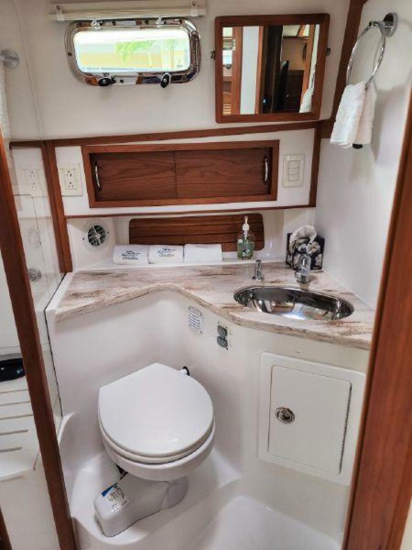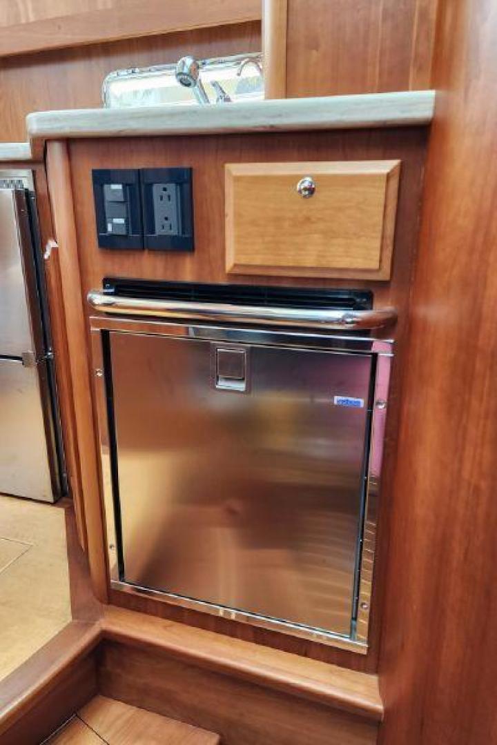 Her salon provides an elegant social space with the same 360-degree visibility available at the helm. Her galley is bright and naturally included in the social spaces due to her half-up layout. Below, the 42 Salon Express has a master stateroom forward featuring a comfortable island berth, and a conveniently designed head, while the second dinette converts to a double berth and pocket doors create a cozy guest cabin.