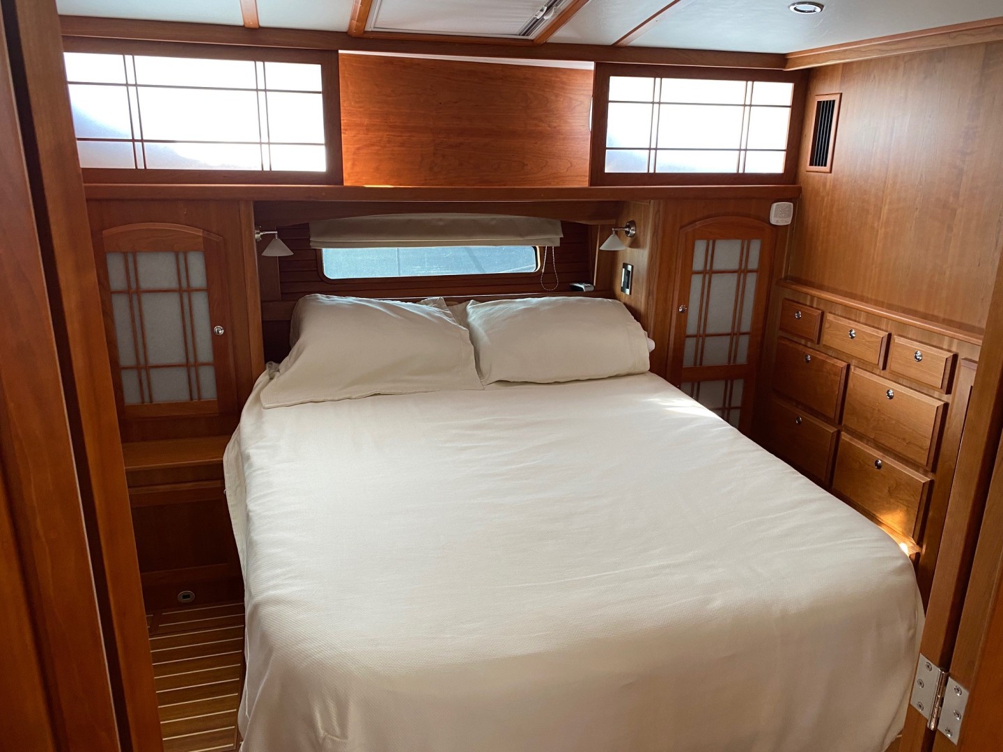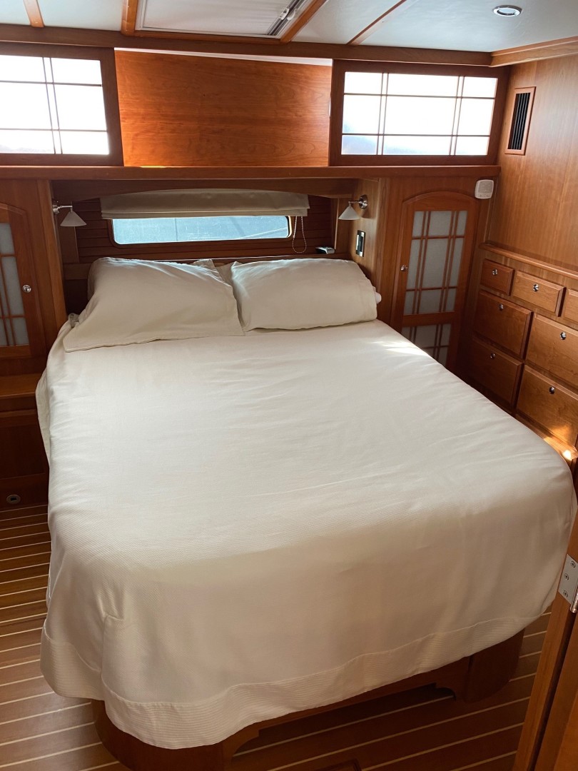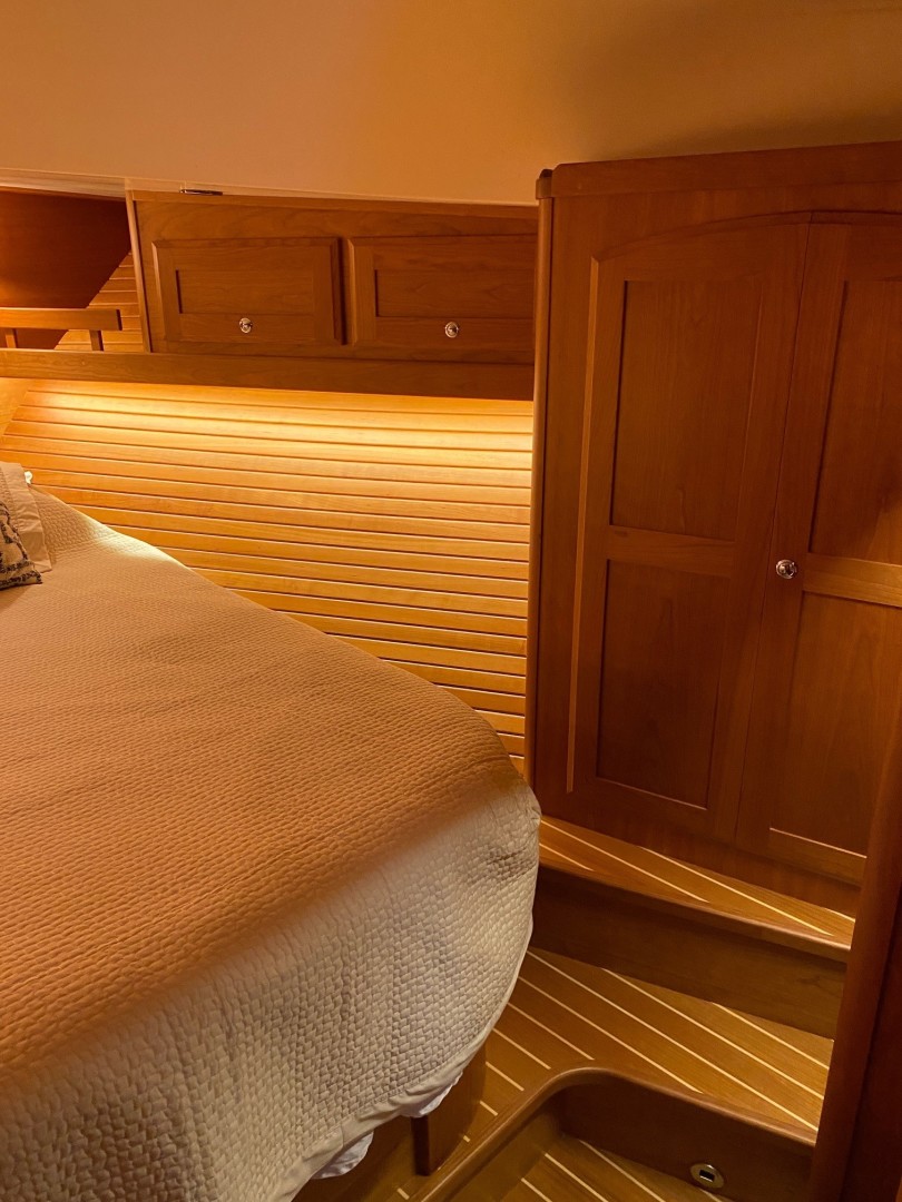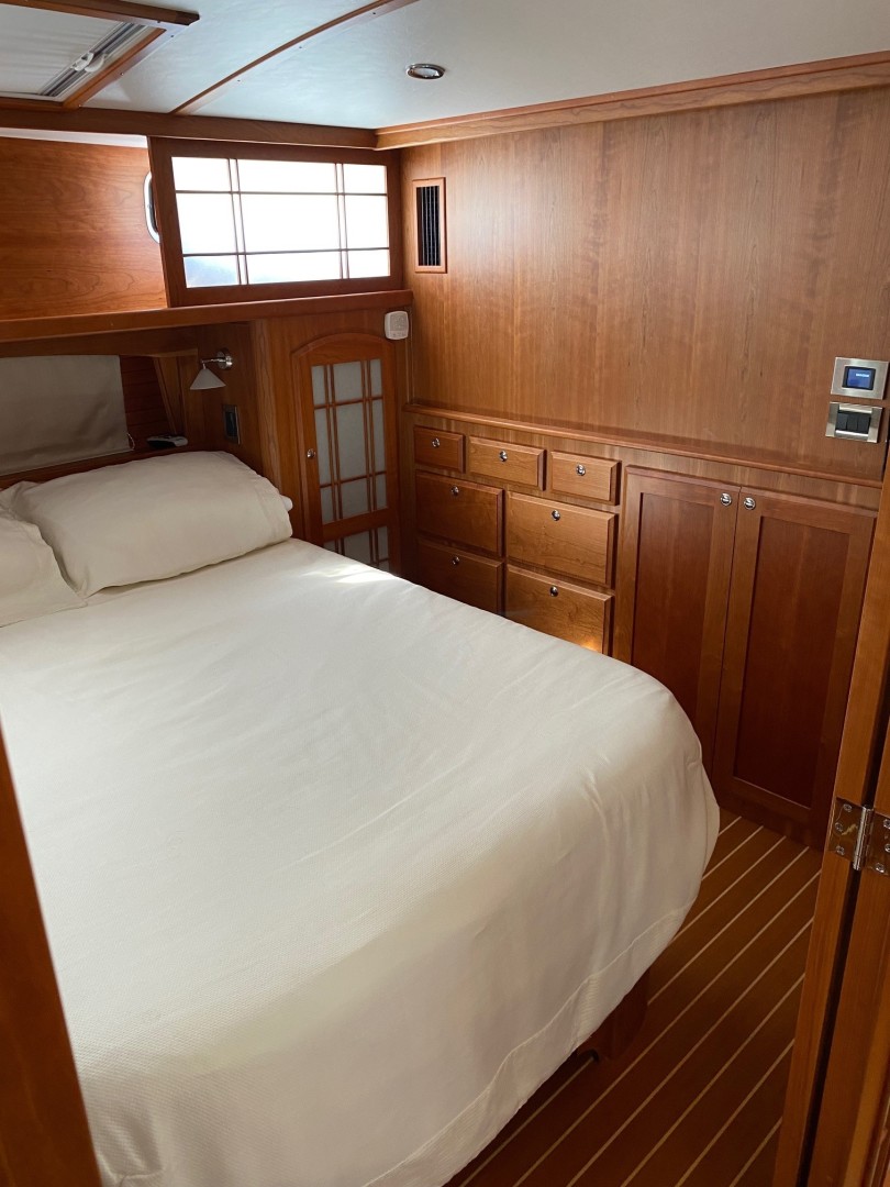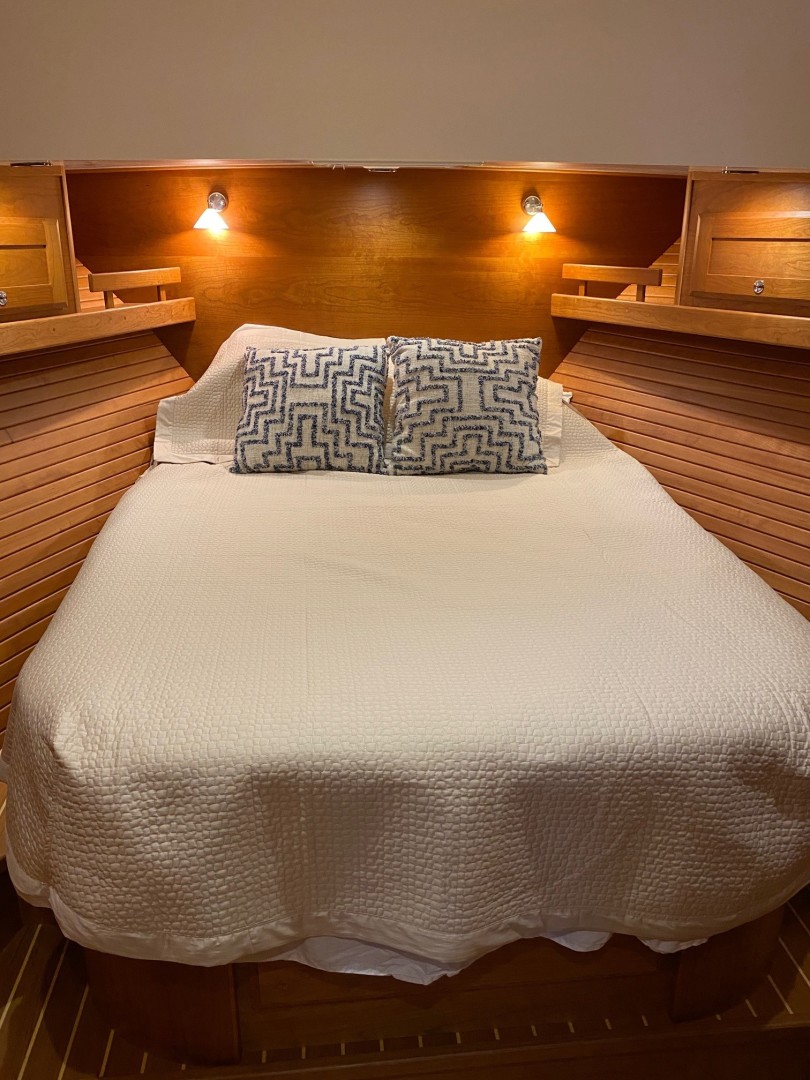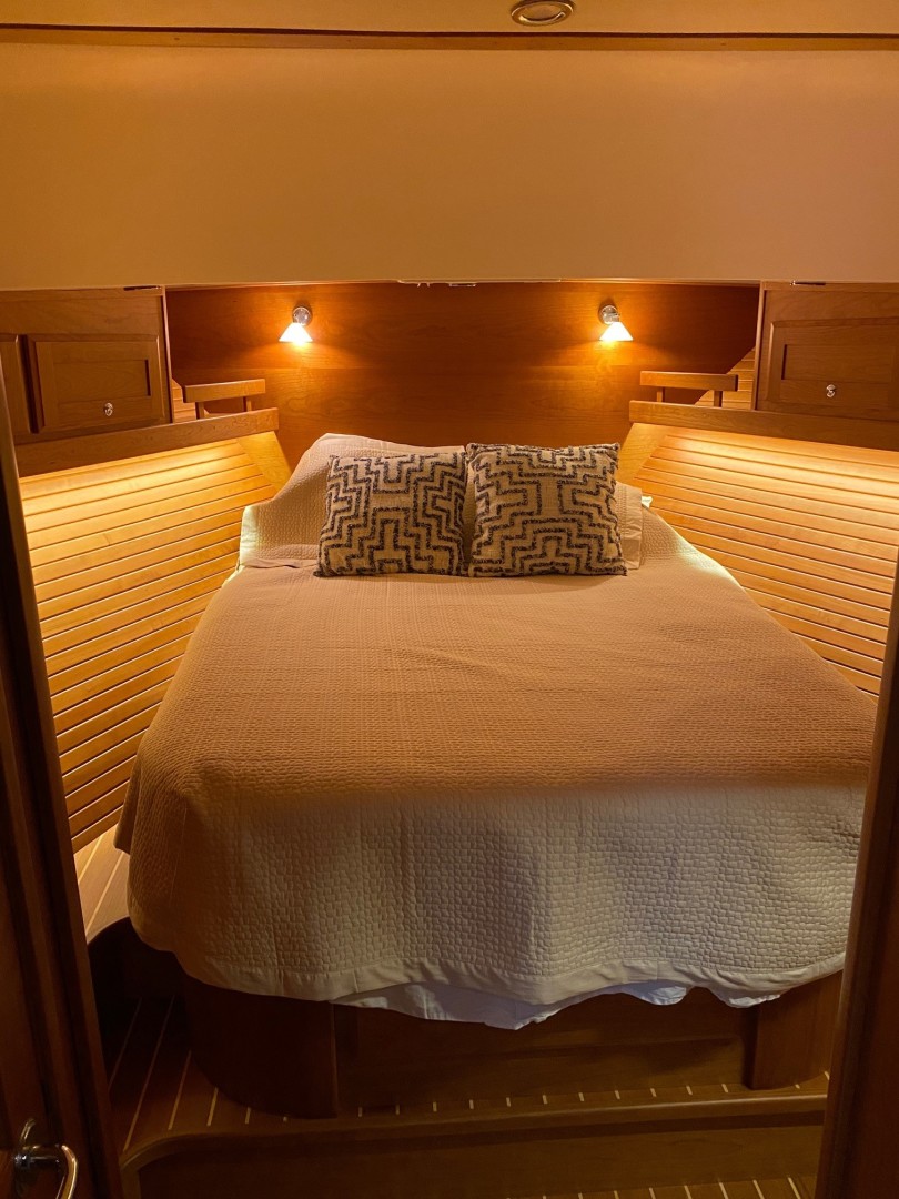 - Island berth athwartship layout with 9″ foam mattress and laminated trim.