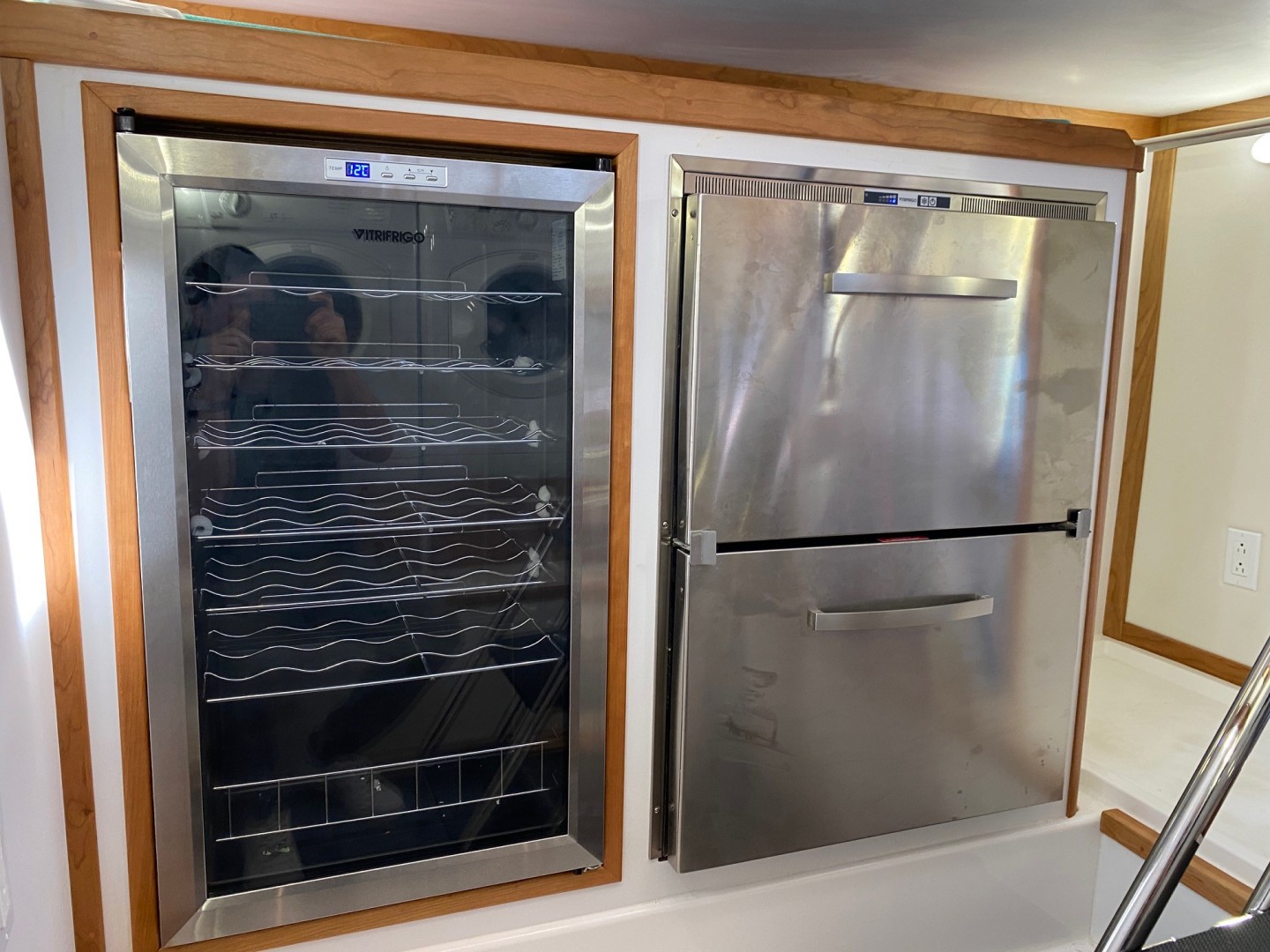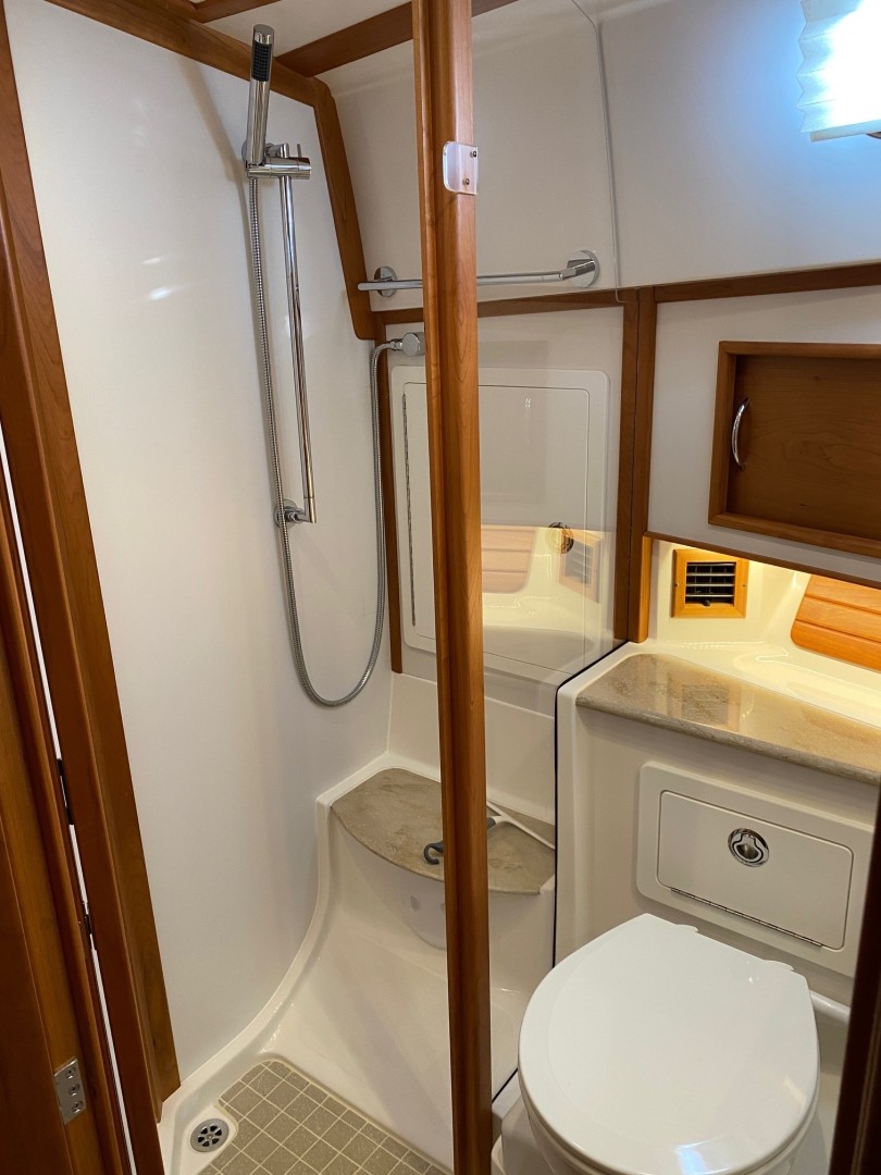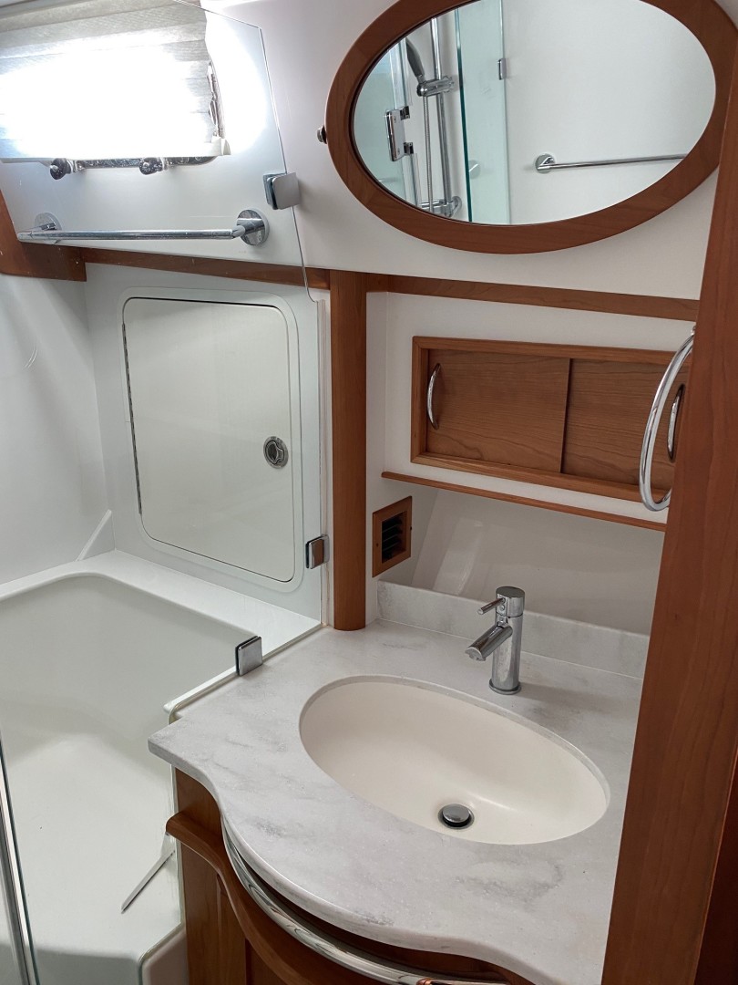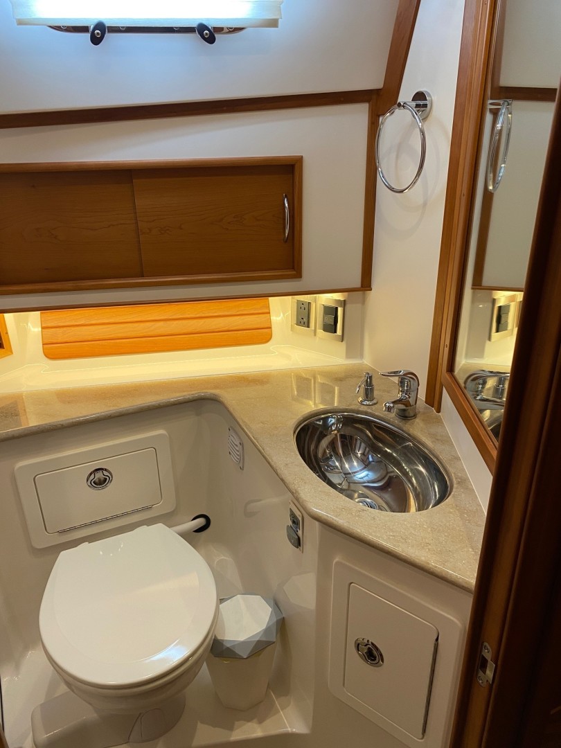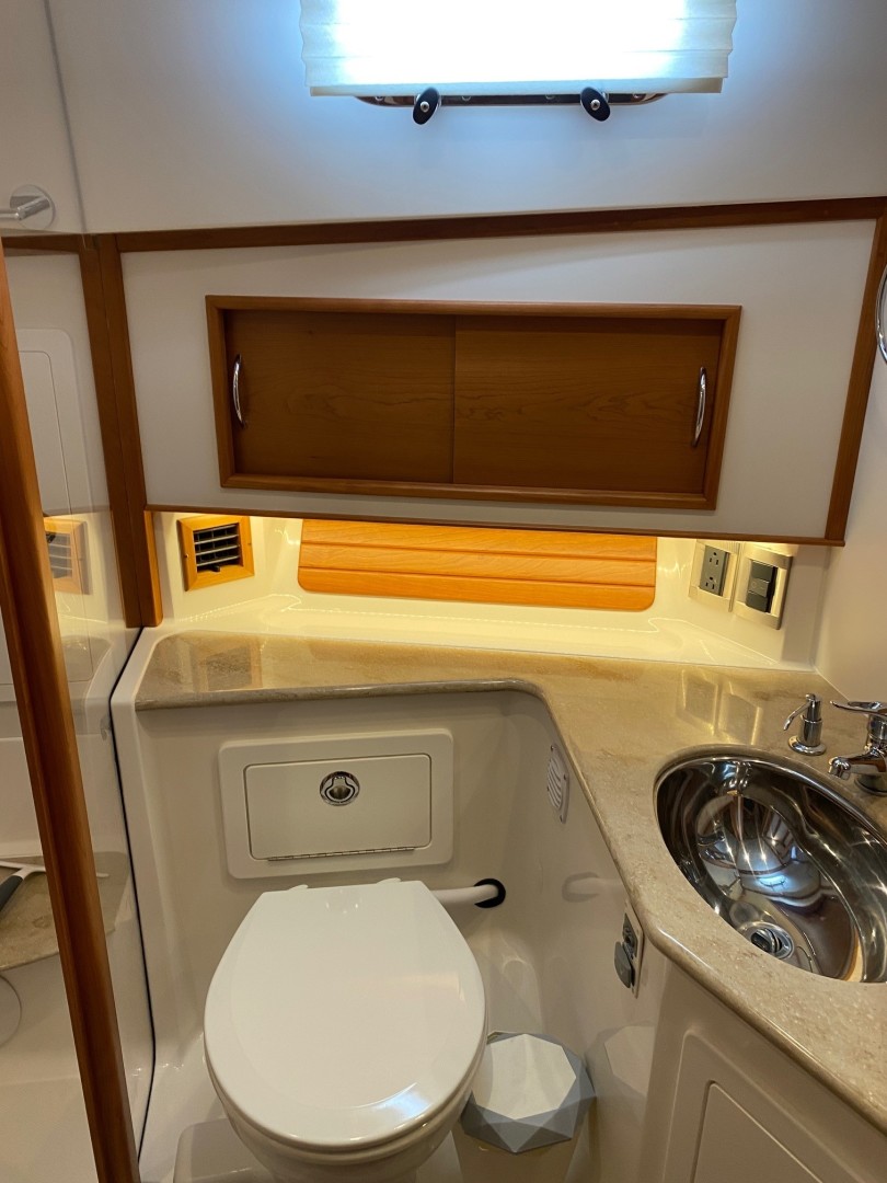 - Island berth athwartship layout with 9″ foam mattress and laminated trim.