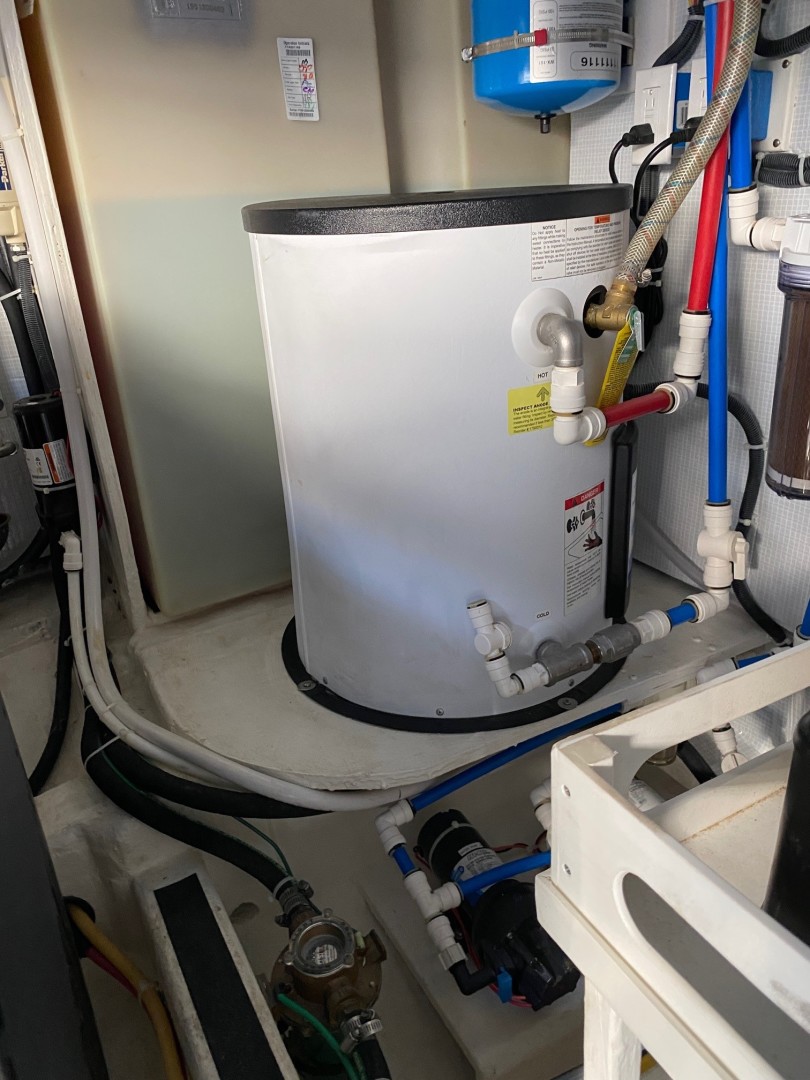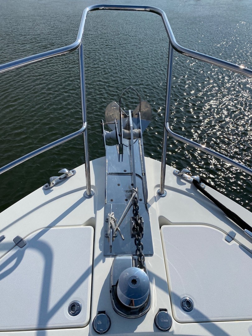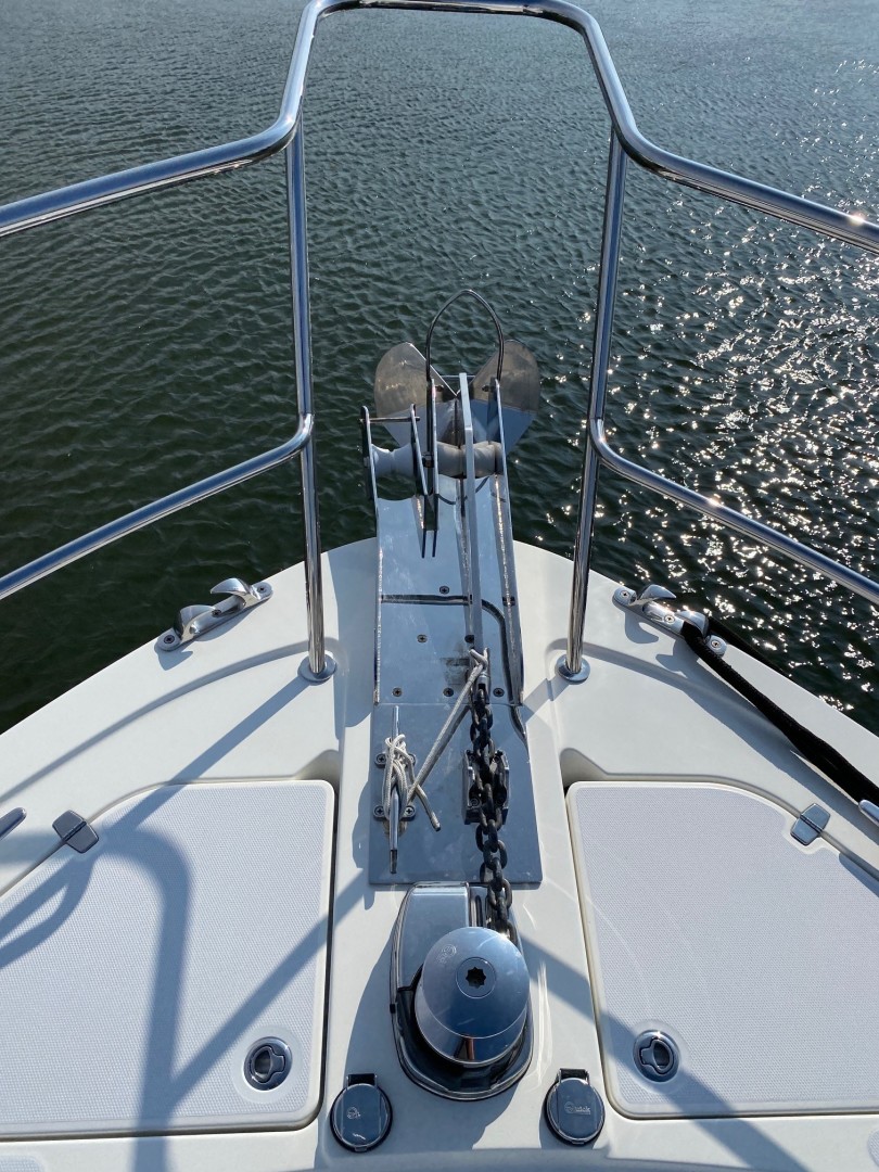 - 10” Stainless steel cleat to starboard of windlass as anchor rode tie off.