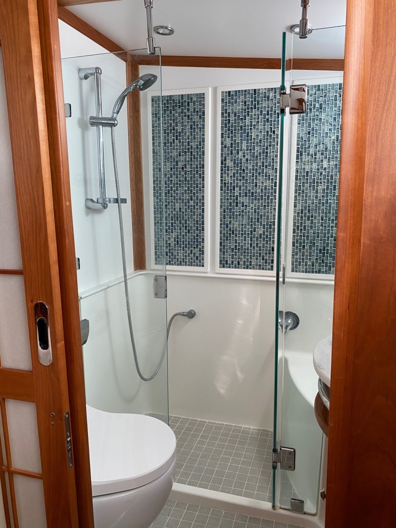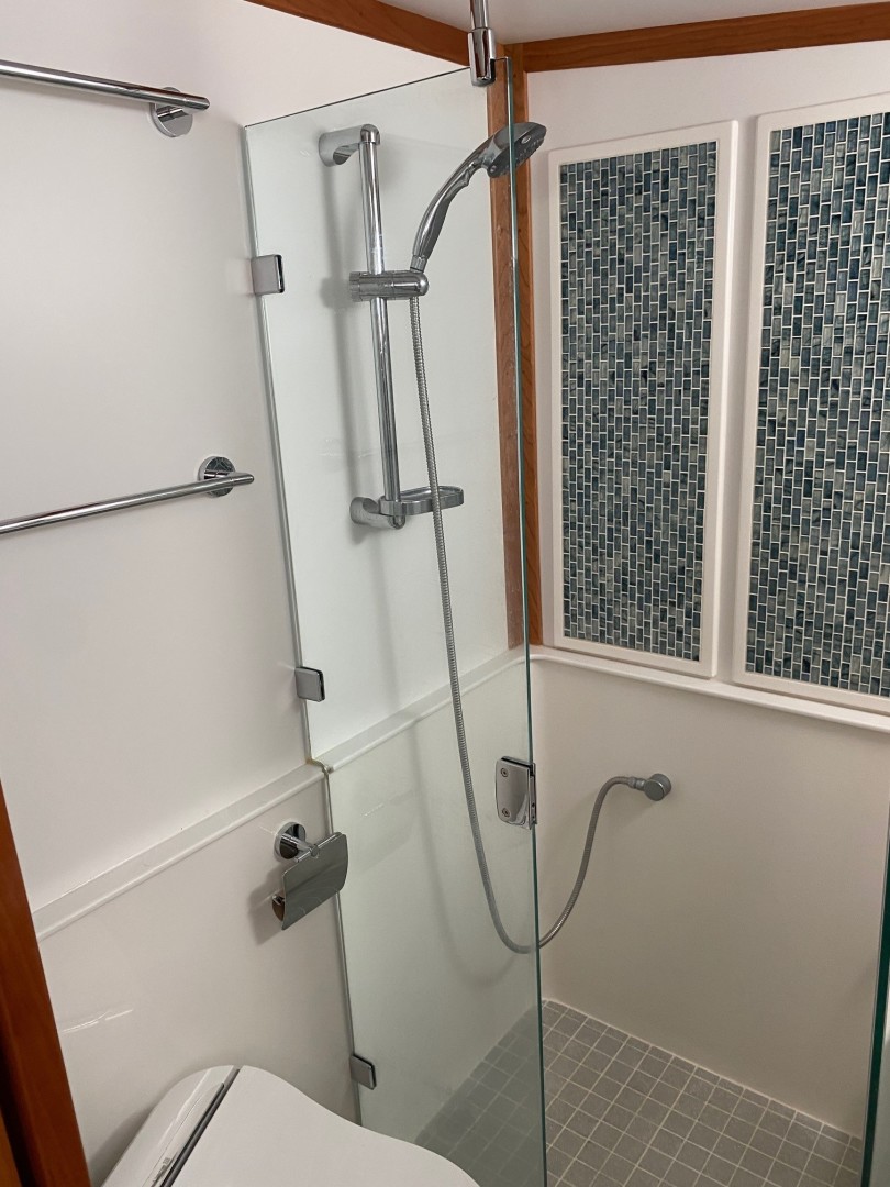 - Separate shower stall with clear bi-fold enclosure and glass tile accent wall within