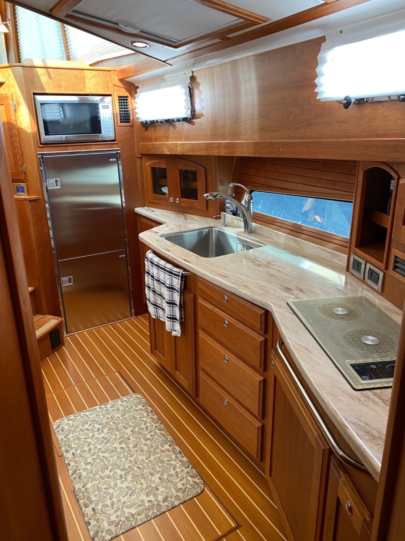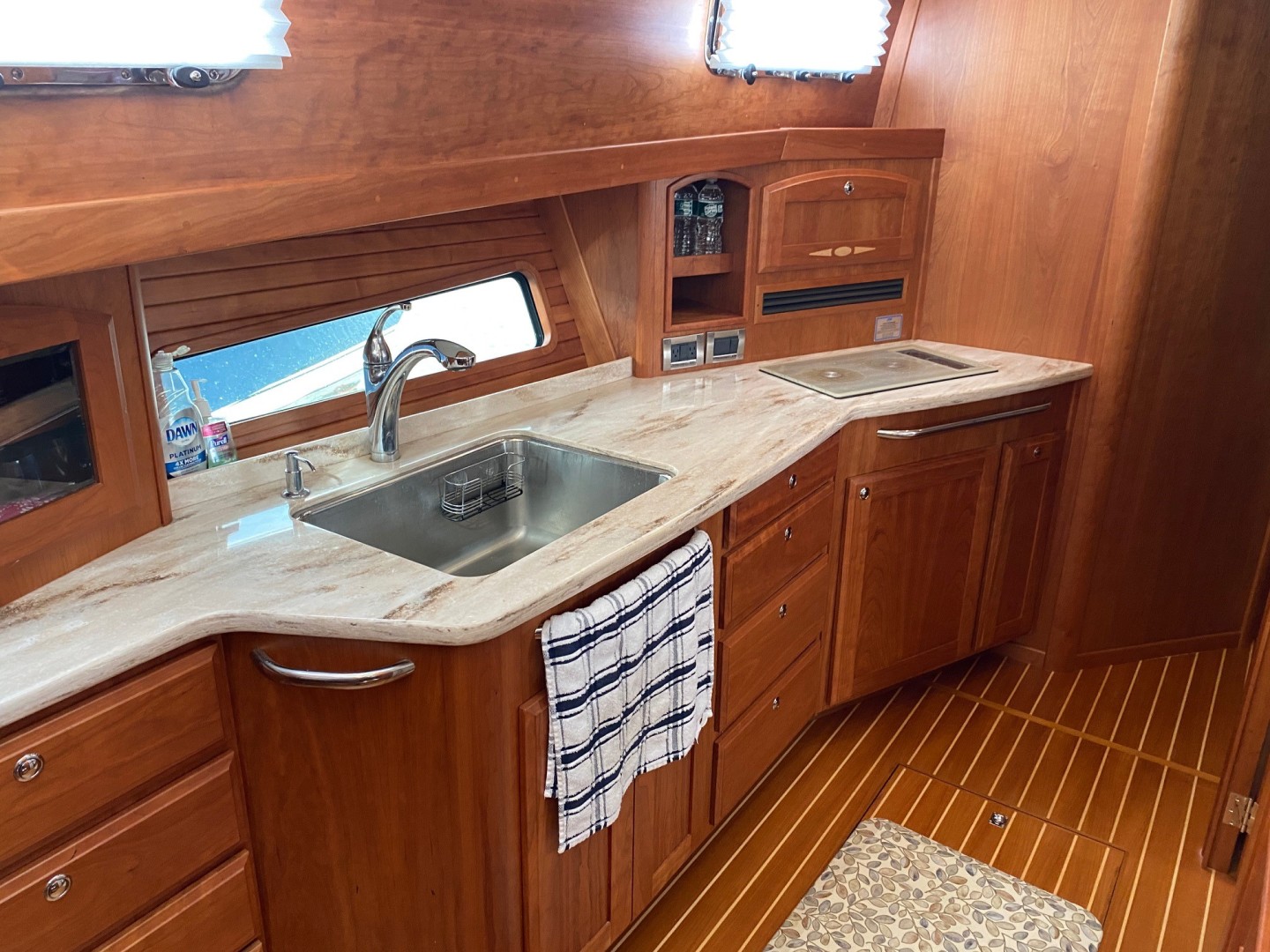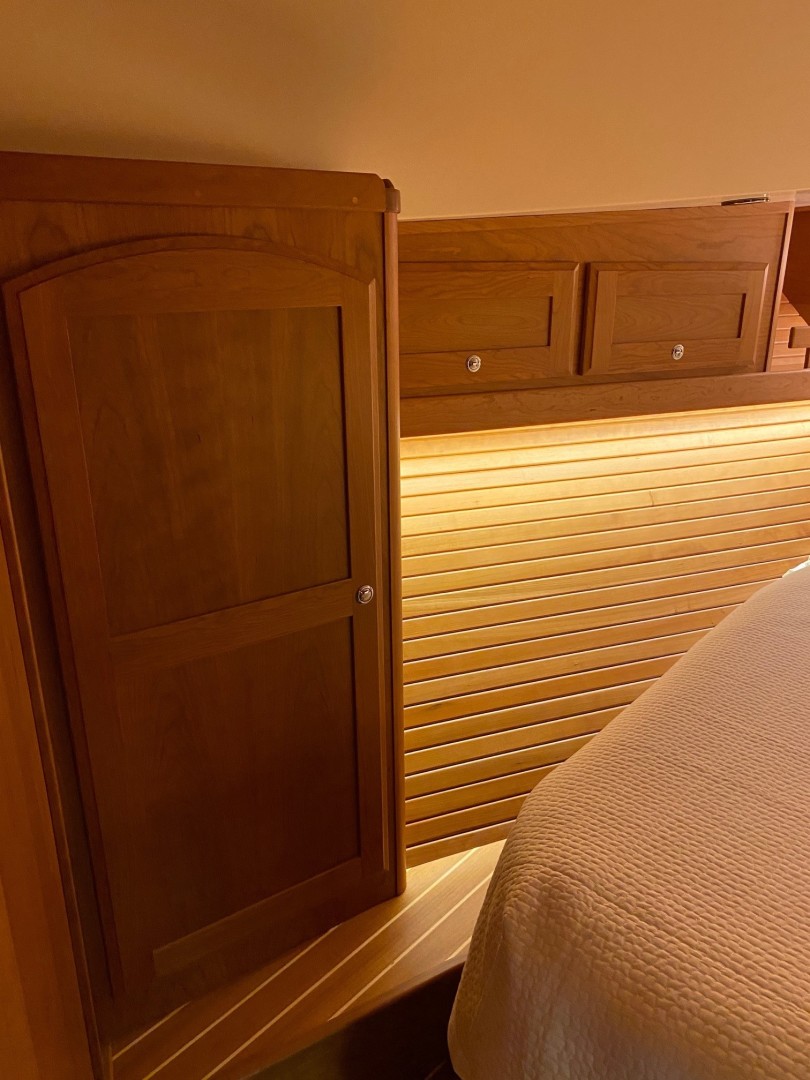 - Spacious island berth, with 6″ mattress and laminated trim.