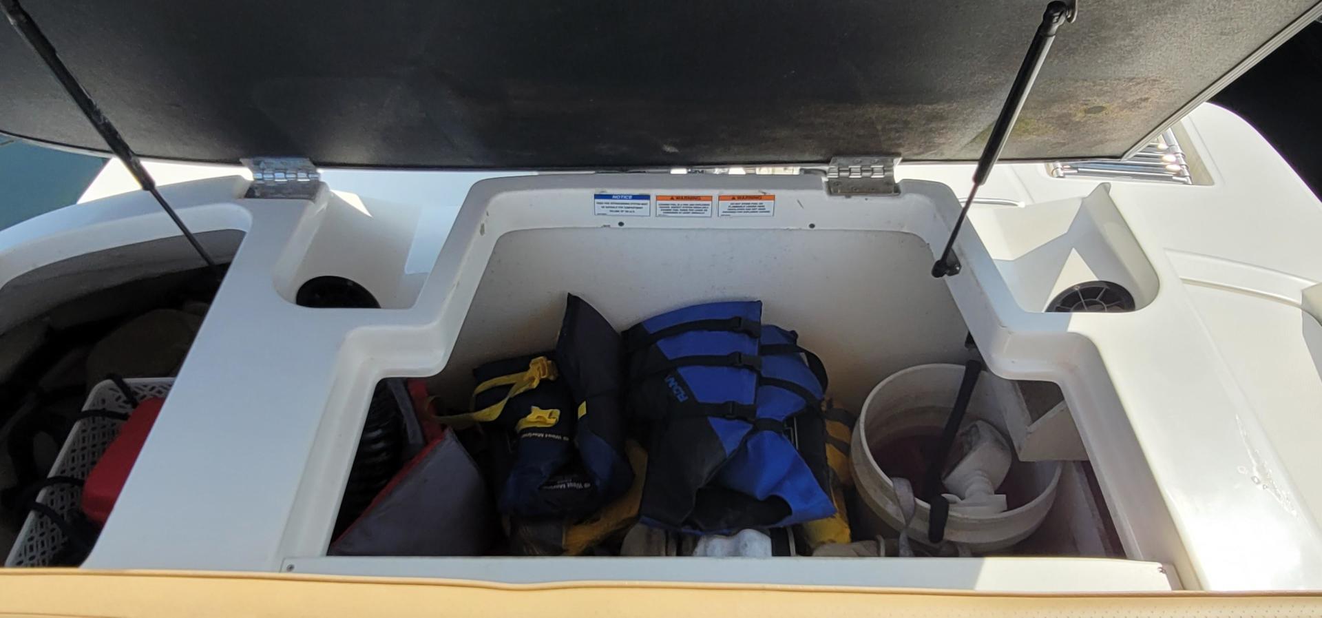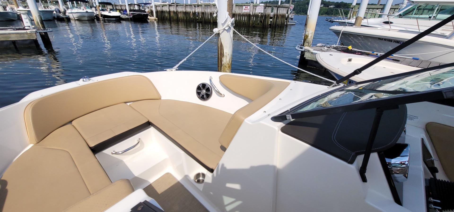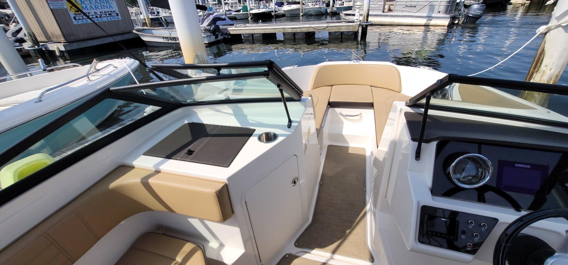 Other optional items are the Simrad flush mounted MFD offering Navigation Charts, Fishfinder and engine information. The Fusion stereo offers great sounds on the water. There is also a bimini top, bow and cockpit canvas.