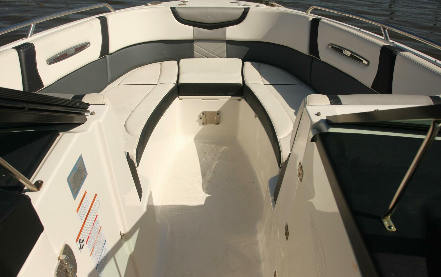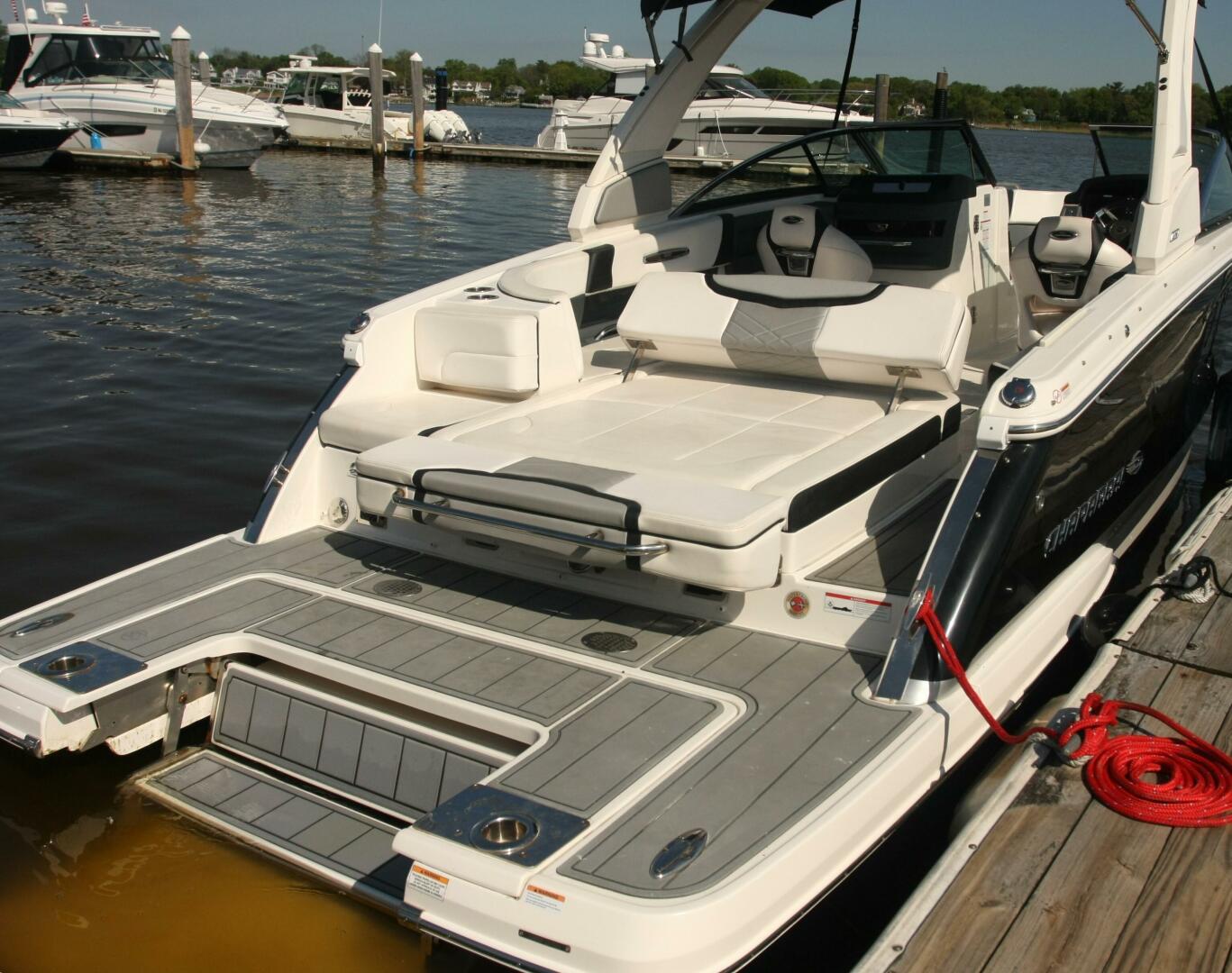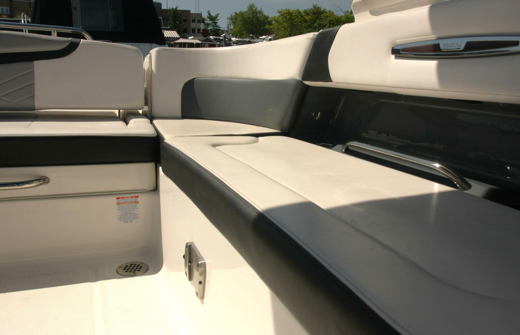 Large, 3/4 wide aft-facing bench seat.The starboard side is cutout for a walk-thru entry with a fresh water shower. The port side also features a stereo control panel. The oversized extended swim platform sits at water level and features the unique Infinity Power Step which converts to a below water level seat.