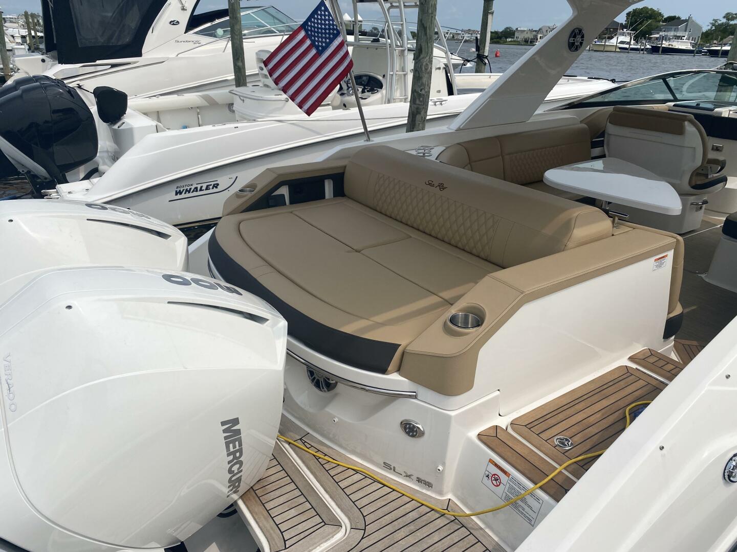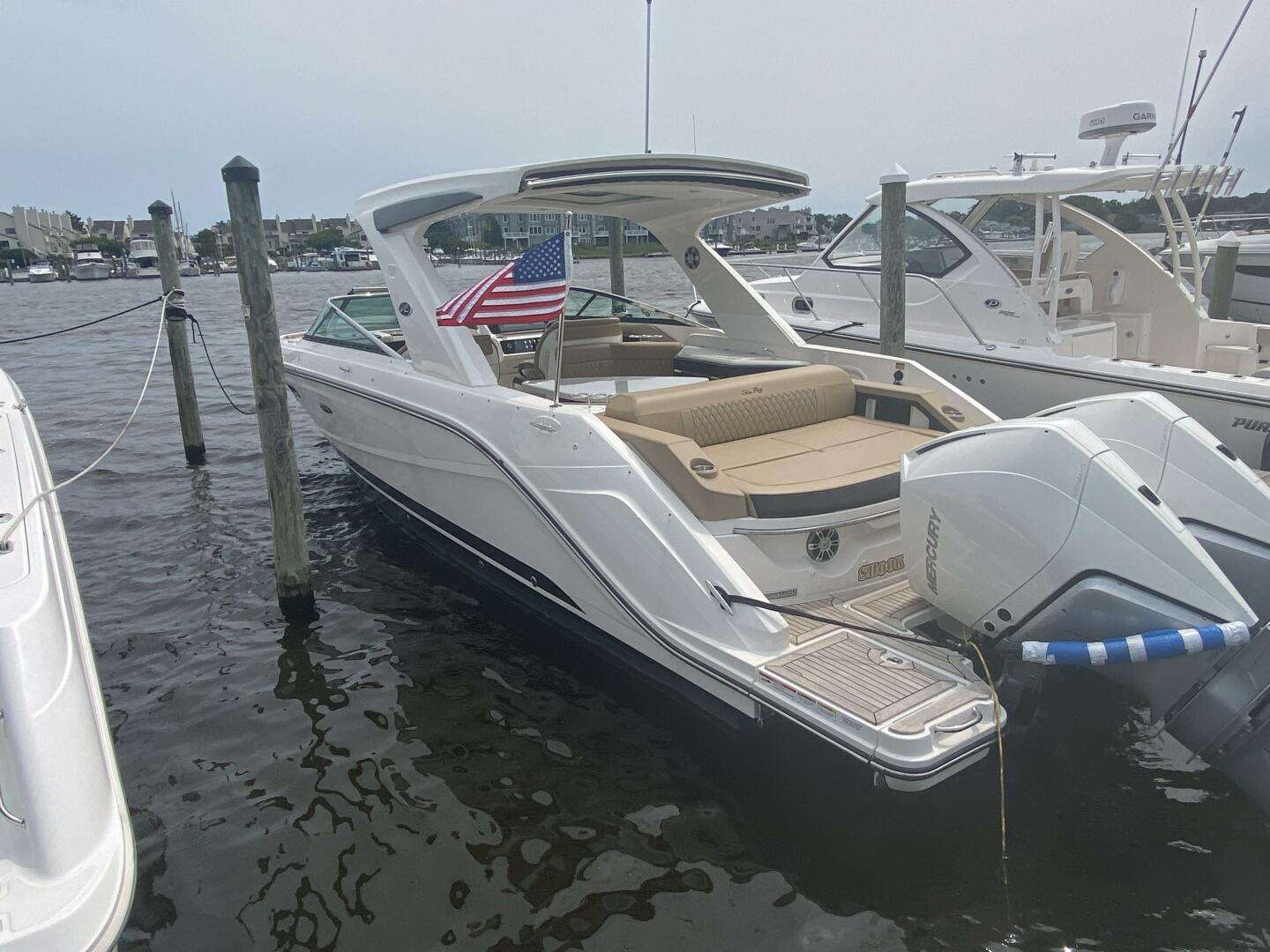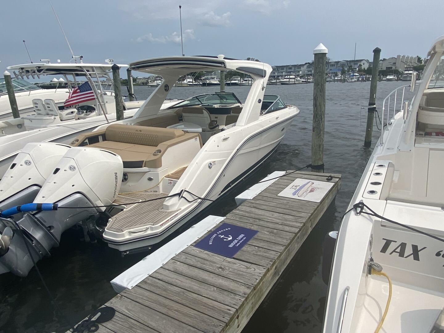 2023 Sea Ray 310 SLX OB, Powered by twin Mercury 300 Verados (only 20 hours) Joystick, Digital Controls Dual 12" Simrads, Simrad VHF Radio, Upgraded Fusion Sound System, Underwater Lighting, RGB LED Lighting, Hardtop with Slider, Teak Swim Platform w/swim ladder, Cockpit Refrigerator 12 V, Wet Bar Area with sink & storage & built in cooler, Sidestep for fixed boarding, Infinity woven flooring, Large head w/sink and vacu flush toilet & macerator, Wind screen door, Windlass stainless steel anchor, Fender clips, Electric extendable Sunshade, Docking lights, Battery charger, Bow & cockpit covers, Cockpit table.