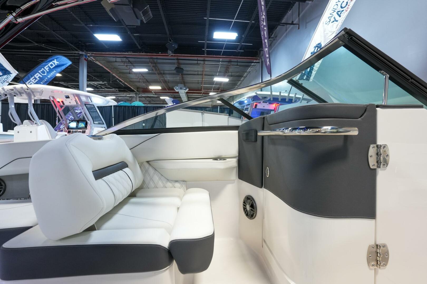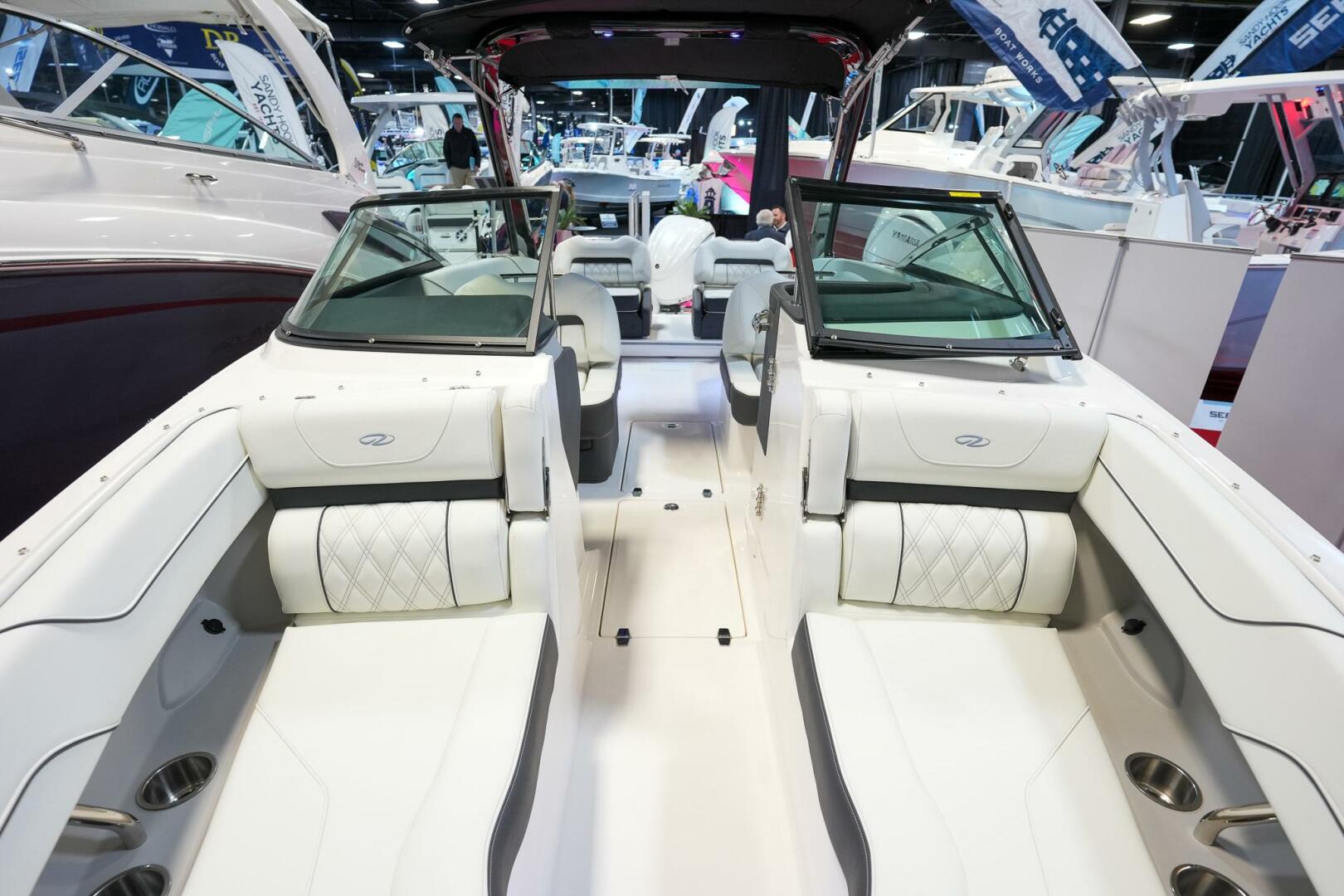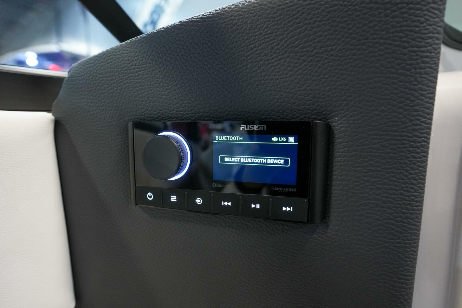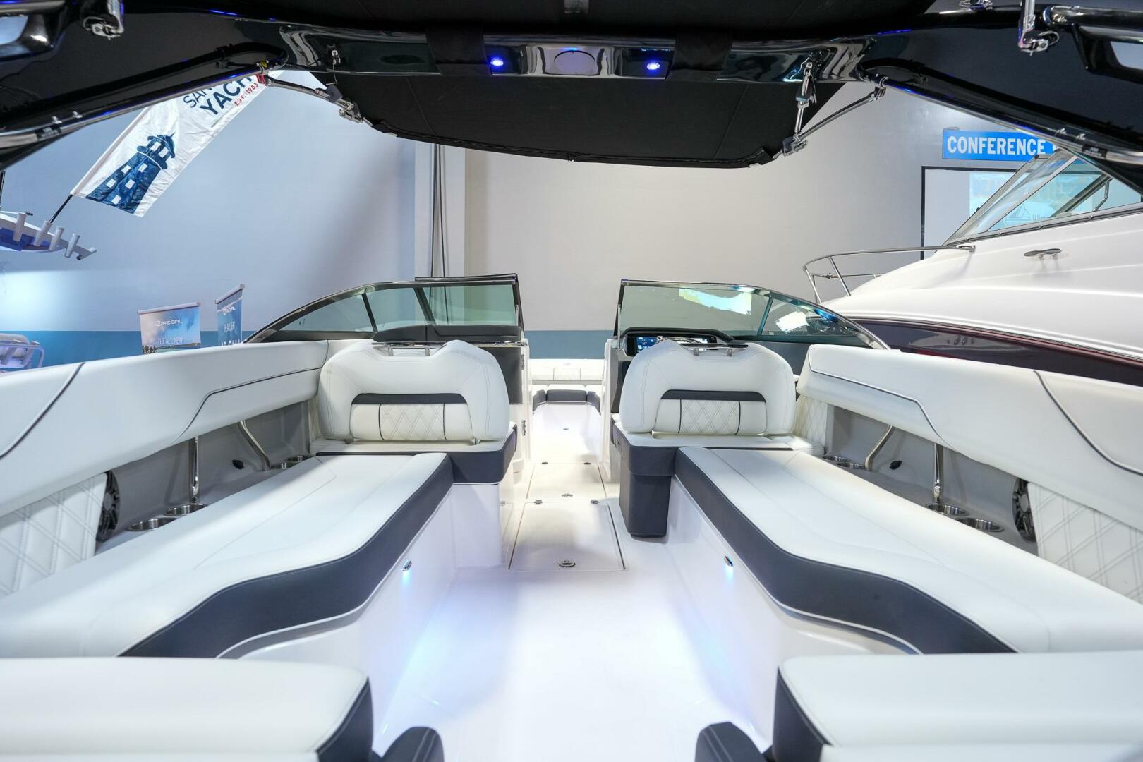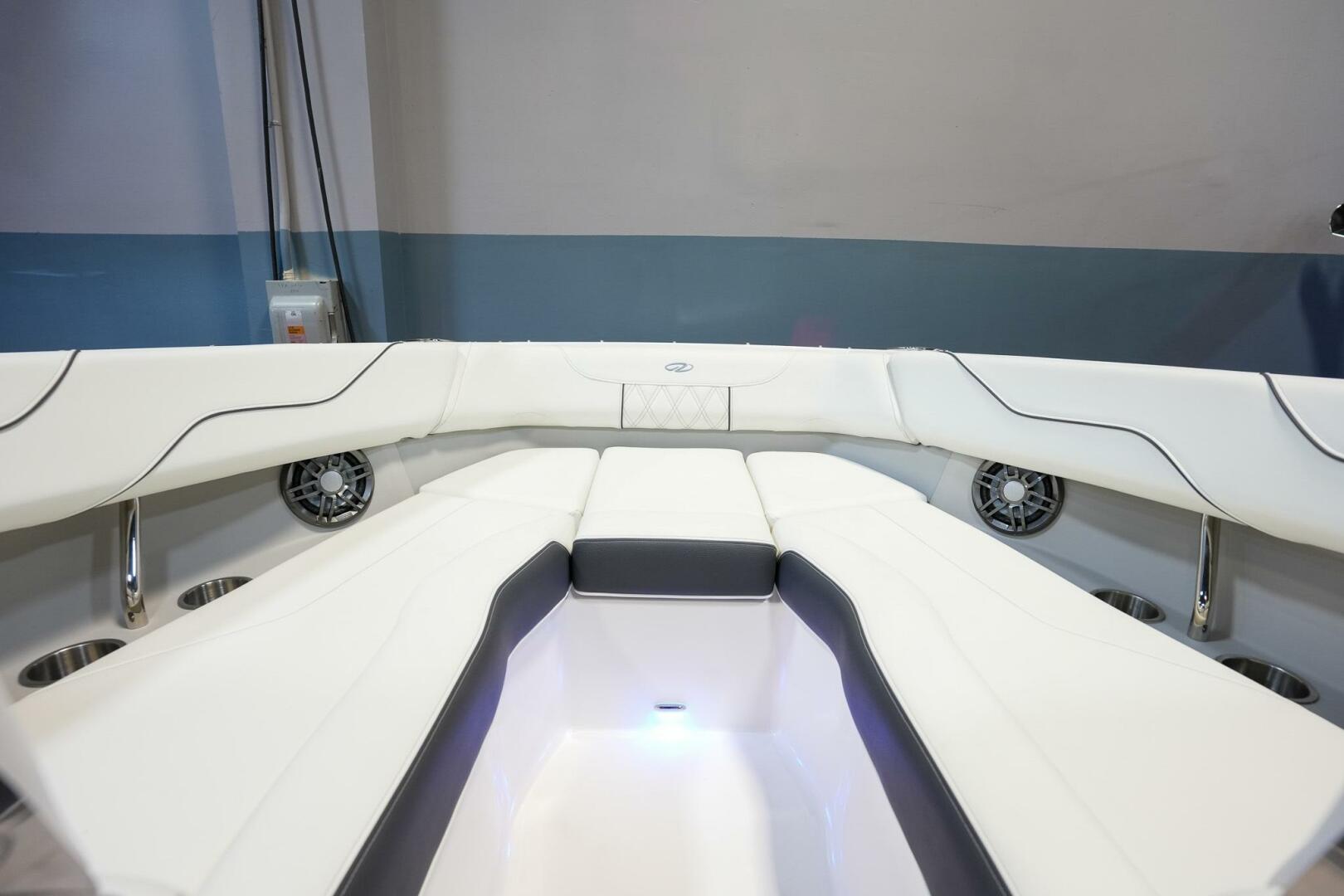 Offered as an entirely open-air boat or, for those looking for shade in the warmer climes, with a floating hardtop, this is the ideal yacht for weekend cruising all year round. Let stress and worry melt away as you make your way offshore, the sound of the soft waves lapping against the hull as you relax in a cozy bow lounge with wraparound seating. Cushioned backrests, cup-holders on hand, marine-grade upholstery with a diamond-stitched finish and integrated Fusion stereo speakers make this the perfect place to both relax and entertain, while a pop-up, teak-lined table can be used for drinks, snacks and even the occasional poker game. Utilize the seating out here as a pair of chaise-longues, or fix a filler cushion into place to turn this entire bow area into one, casbah-style day-bed where you can soak up the sun and absorb the healing qualities of the serene water.