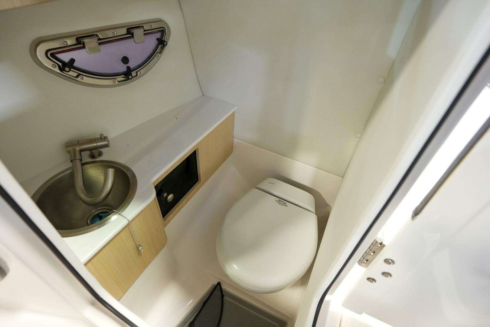Though the cockpit will look familiar to fans of sister vessel the LS6, the cockpit on the LX6 is actually 14 inches longer thanks to a reconfigured layout to stern. This enhances the sense of space back here for those long, therapeutic afternoons spent luxuriating in sheer bliss across comfortable edge-to-edge seating with an adaptable appeal. Two cushioned bench-seats with back-rests flush up against the bulwark can be used as chaise-longues thanks to movable backrests shared with the helm seats, while Ultra-lounge rumble seats to aft can face toward the social action in the cockpit or be turned around for exceptional views out to stern. A Seagrass or Seadek sole in here gives a reassuring, non-slip feel as you move around deck, while stainless grab-rails and cleats are so intuitively placed that you are bound to find one at just the right moment. Amenities that you might not notice at first sight include a hidden cooler underneath the seating, ideal for keeping refreshments ice-cold, while a head compartment boasts a coastal driftwood interior, a chemical toilet, a stainless steel sink and overhead vanity lighting.