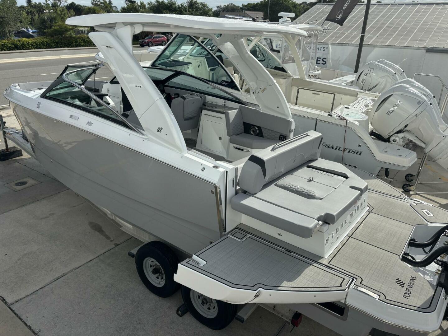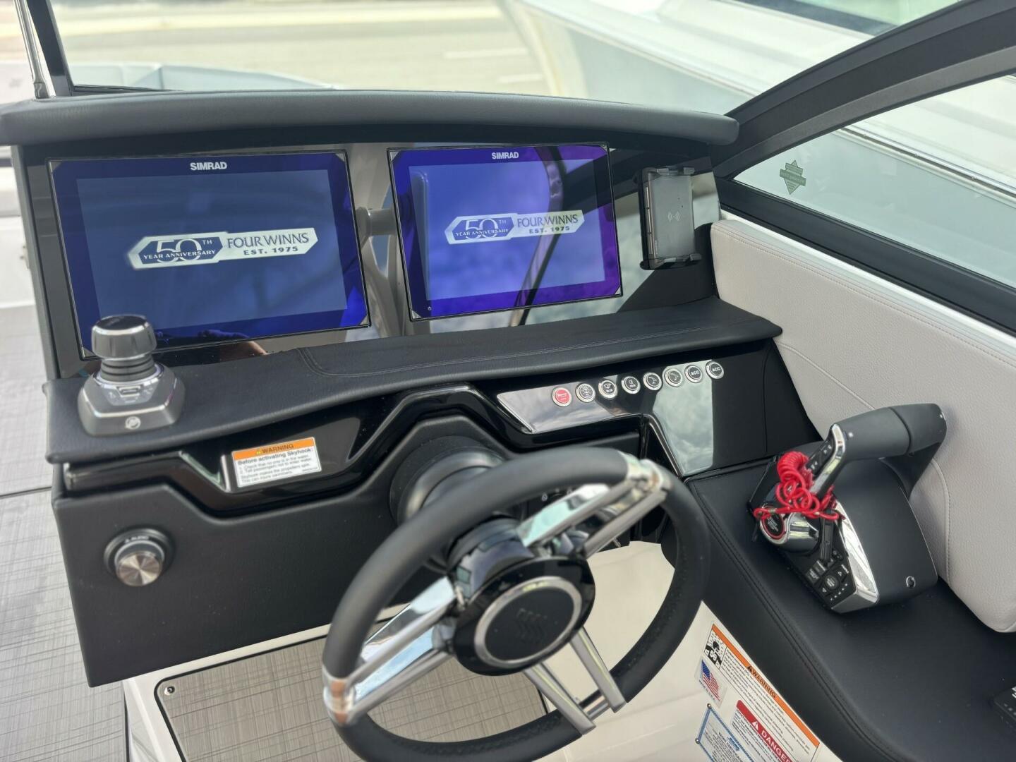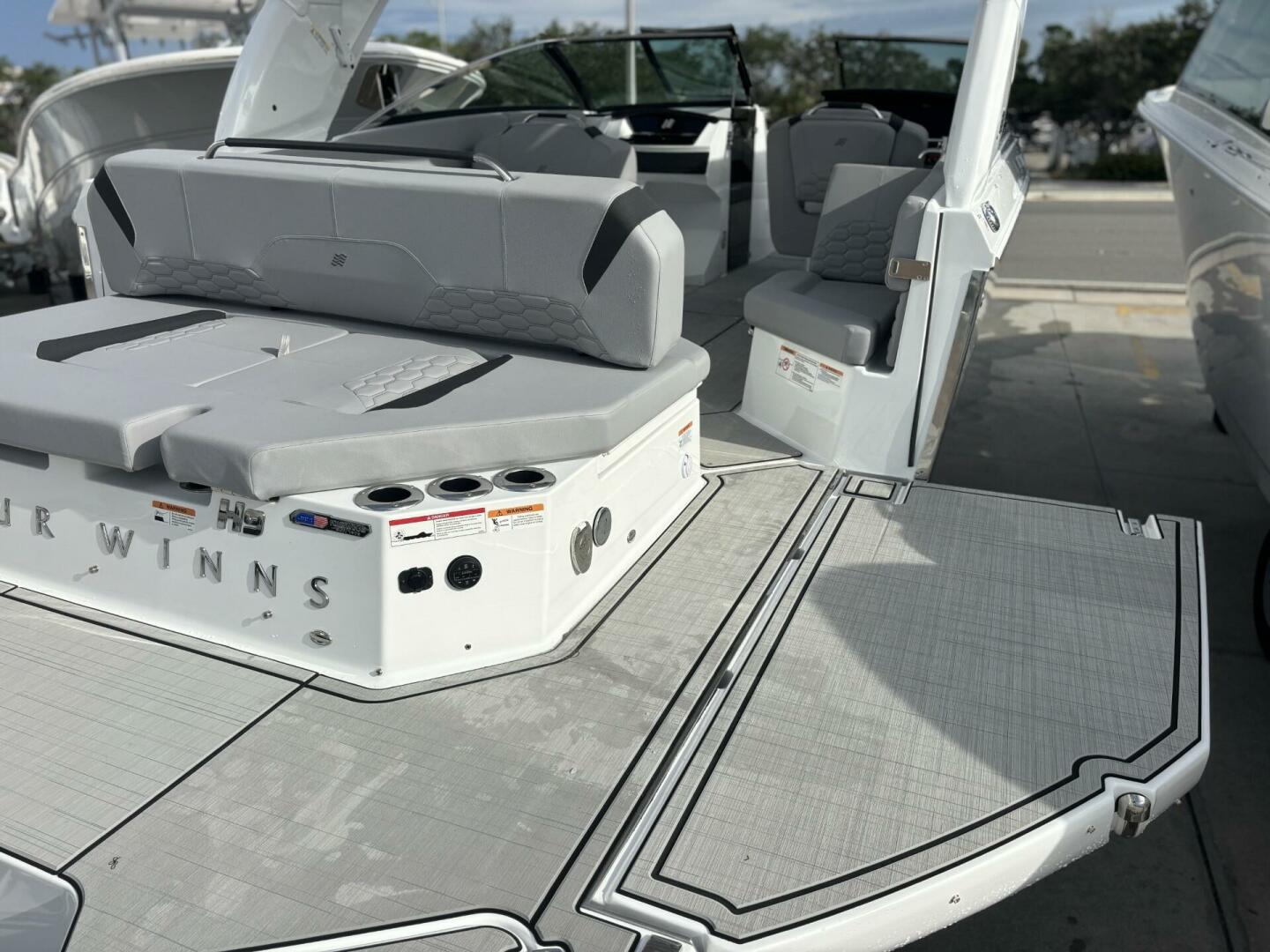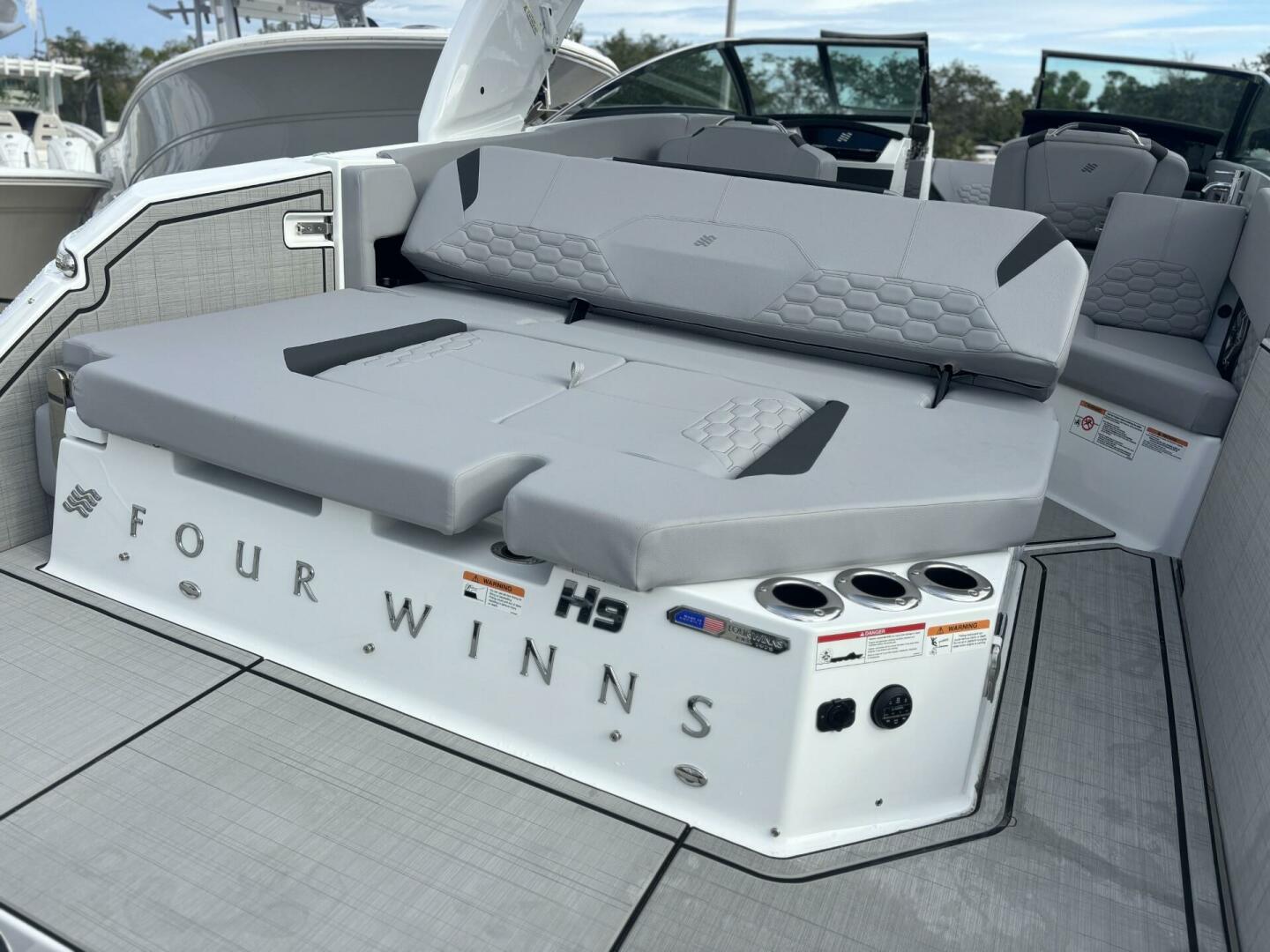 Elegance in every line. The H9 boasts elongated proportions for a striking silhouette, ensuring both visual appeal and a smoother presence on the water. Its vertical stem profile adds visual distinction and functional stability, while our signature windshield integrates seamlessly for optimal visibility and timeless elegance. Designed for easy water access with its swim platform, we invite you to step onto the newest, most innovative feature enhancing the grace and sophistication of the Four Winns H9.
