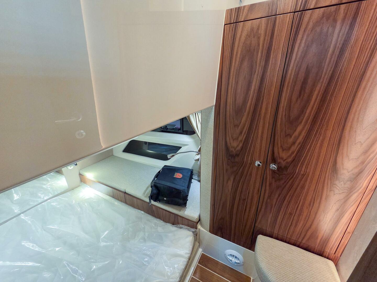 The co-pilot seat can flip over, so that the passengers can enjoy sitting in the driving direction and enjoying the trip in the saloon area. Cooking facilities are really spacious, even for the most passionate gourmets. In addition, the aft part of the boat can be equipped with a large grill. The aft sitting group can be delivered with many options like an extra fridge, ice-makers, extra sitting bench, storage or just open space. The need for storage is well taken care of all over the boat. Below deck: by placing the shower in the centre of the boat we were able to make a highly practical bathroom area. It is generous in space, standing height and it also gives way for a huge front master bed in the front cabin. The mid cabin is spacious as well and has enough room for two individuals to sleep and live in comfortably. As several marinas and lakes have restrictions on size – the 330 Scandinavia can be delivered with either a long or a short bathing platform.