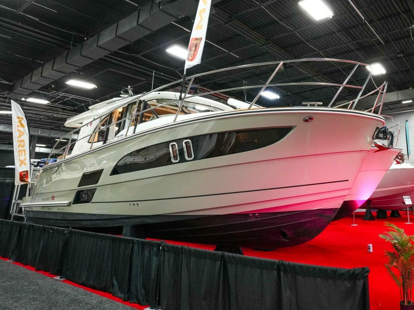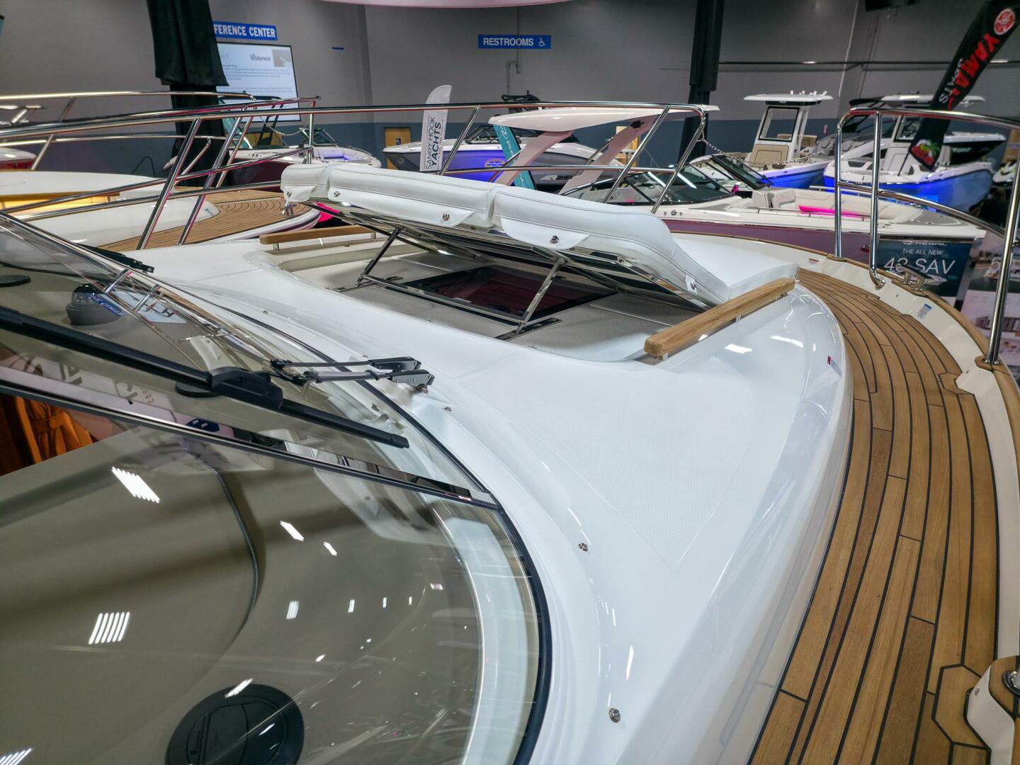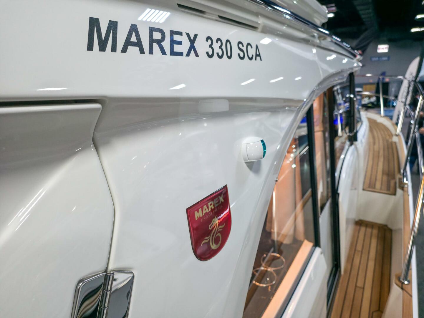 The new Marex 330 Scandinavia was designed as a smaller version of the Marex flagship – Marex 375 and as the next edition of the former Marex Scandinavia. It is a fully planing boat. The hull and deck are completely new. Our previous customers wished for a closed boat with a generous sitting area inside as well as a large sitting area outside and that is what we developed! This feature makes the boat suitable for many friends and easy day cruising. A sliding pilot door at the helm has also been requested and built in for easy deck access, thus making mooring and handling much easier. To meet different markets and various needs, the boat can be delivered with either a single or a double engine, both shafts or sterndrives. The cruising speed is from 23 to 30 knots and top speed from 28 to 38 depending on the engine power chosen. When properly enclosed the 330 Scandinavia is warm and makes the summer season last longer in the northern regions and at the same time can easily be cooled with a large air conditioner in warmer climates. The boat has a soft roof in the aft and a front hardtop. The canopy solution is the absolute quickest on the market – it is a sliding roof system with the side curtains stored in the targa arch. Just a minute from a completely closed to a fully open boat.