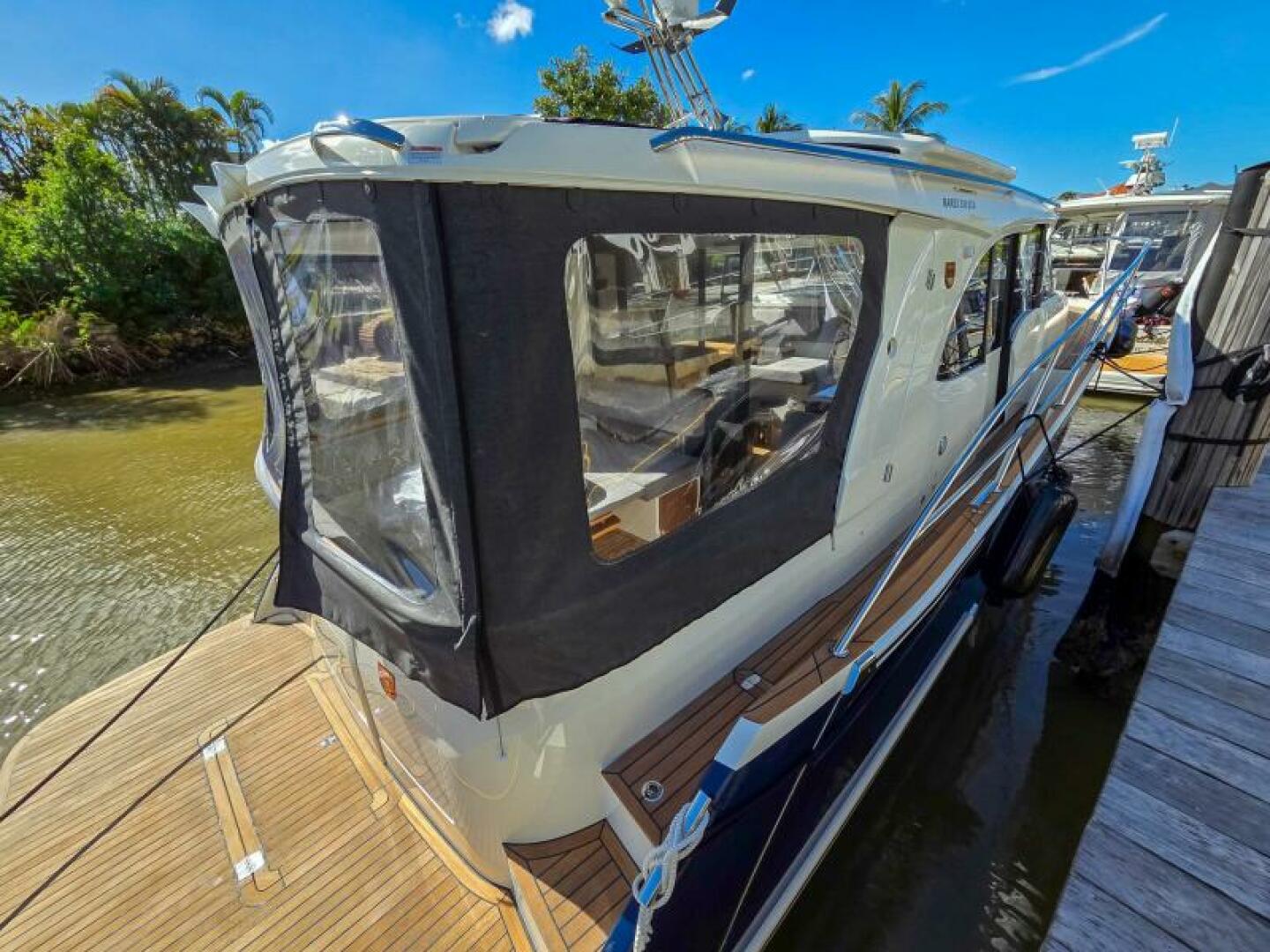 The new Marex 330 Scandinavia was designed as a smaller version of the Marex flagship – Marex 375 and as the next edition of the former Marex Scandinavia. It is a fully planing boat. The hull and deck are completely new. Our previous customers wished for a closed boat with a generous sitting area inside as well as a large sitting area outside and that is what we developed! This feature makes the boat suitable for many friends and easy day cruising. A sliding pilot door at the helm has also been requested and built in for easy deck access, thus making mooring and handling much easier. To meet different markets and various needs, the boat can be delivered with either a single or a double engine, both shafts or sterndrives. The cruising speed is from 23 to 30 knots and top speed from 28 to 38 depending on the engine power chosen. When properly enclosed the 330 Scandinavia is warm and makes the summer season last longer in the northern regions and at the same time can easily be cooled with a large air conditioner in warmer climates. The boat has a soft roof in the aft and a front hardtop. The canopy solution is the absolute quickest on the market – it is a sliding roof system with the side curtains stored in the targa arch. Just a minute from a completely closed to a fully open boat.