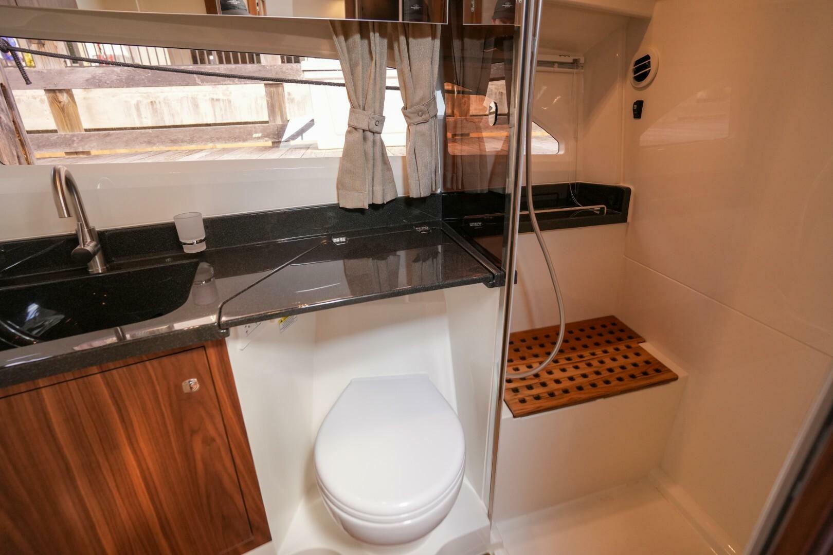 A handy door in the windscreen affords quick, safe and easy access to the foredeck, although the generous 28 cm side decks also allow easy movement around the boat. A well-designed helm position, excellent dashboard ergonomics and clear instrumentation provide a comfortable drive, while the spacious triple co-pilot seat assures an exciting experience for the whole family. The boat has a few engine options: 1 x Volvo Penta D6-400 (approx. top speed – 31 knots); 2 x Volvo Penta D4-300 (approx. top speed is 40 knots) or 2 x Mercury Diesel TDI 3.0L 260.