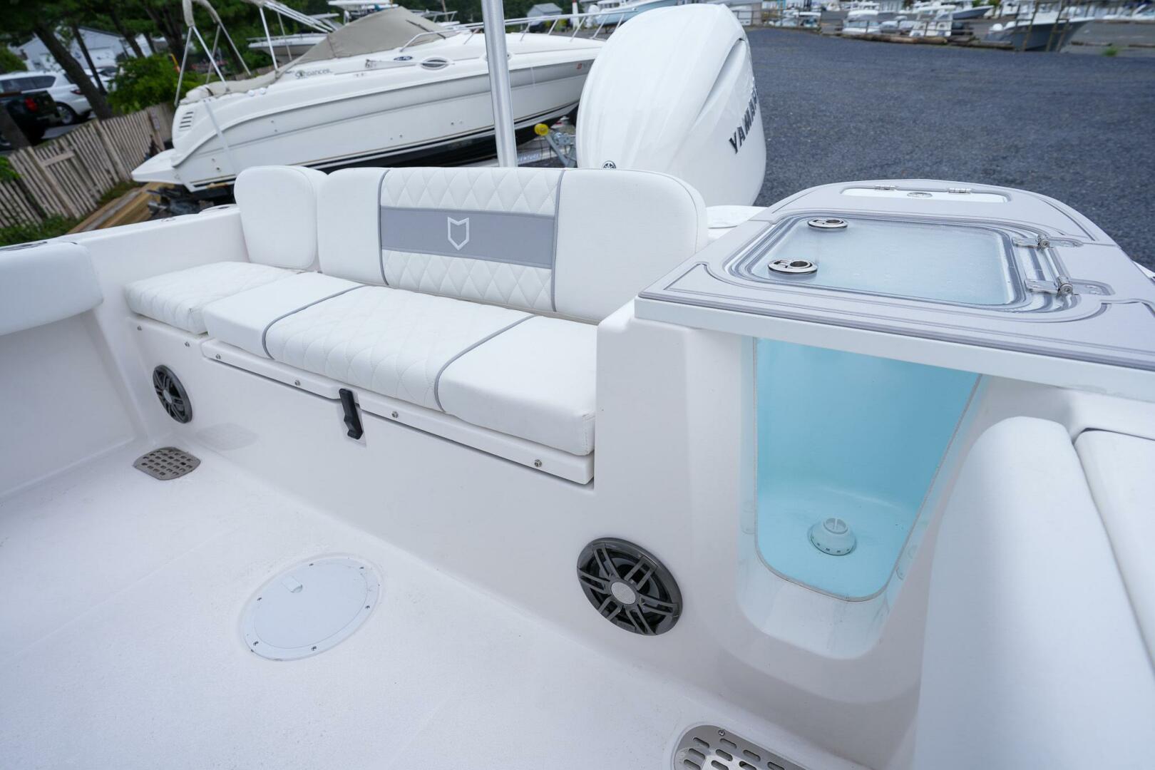 • transom storage compartment under bench seatplumbed and insulated for use as a cooler and notched for beach anchor storage