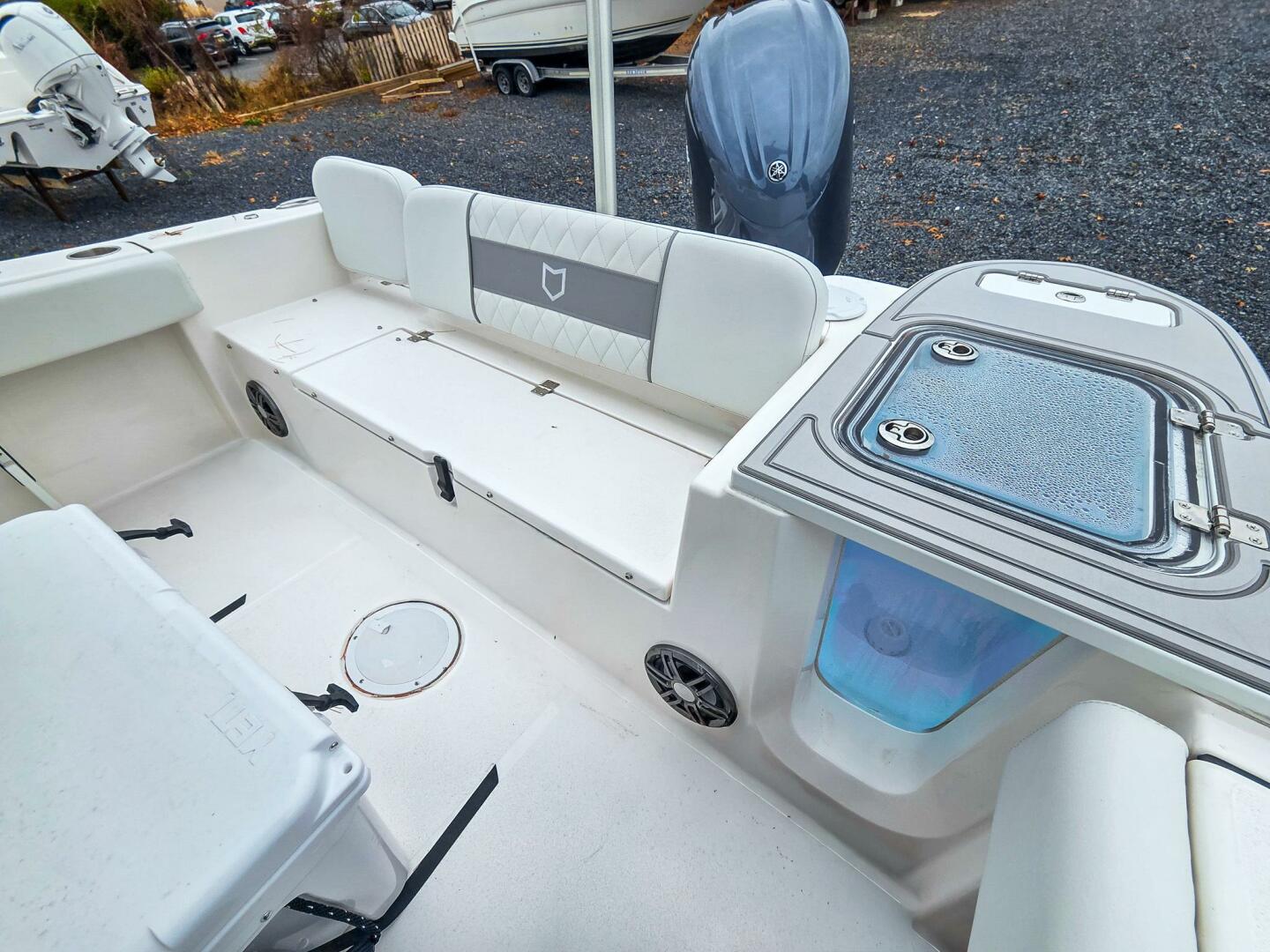 • transom storage compartment under bench seatplumbed and insulated for use as a cooler and notched for beach anchor storage