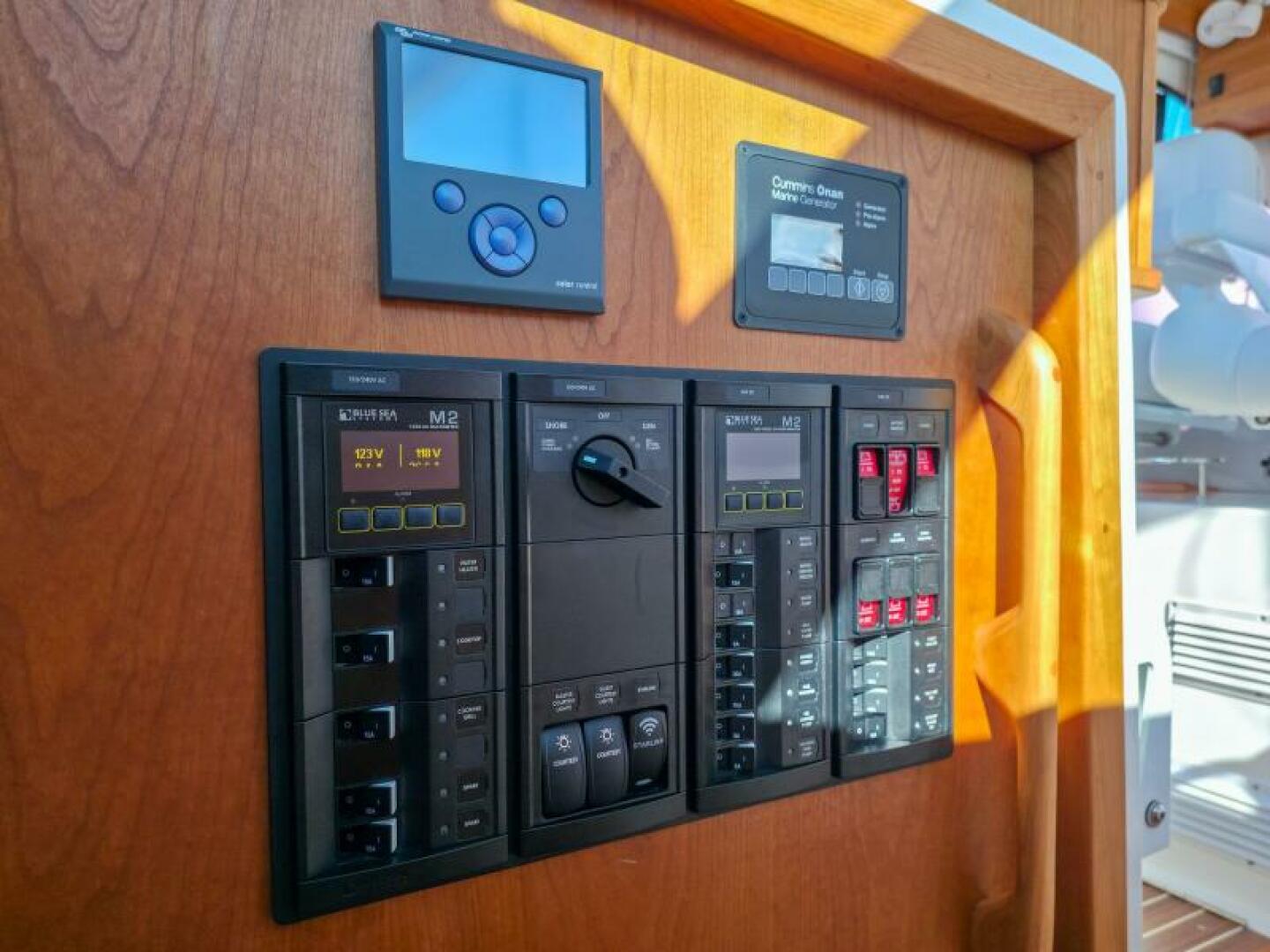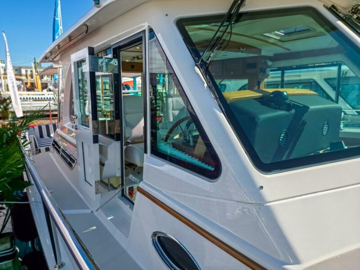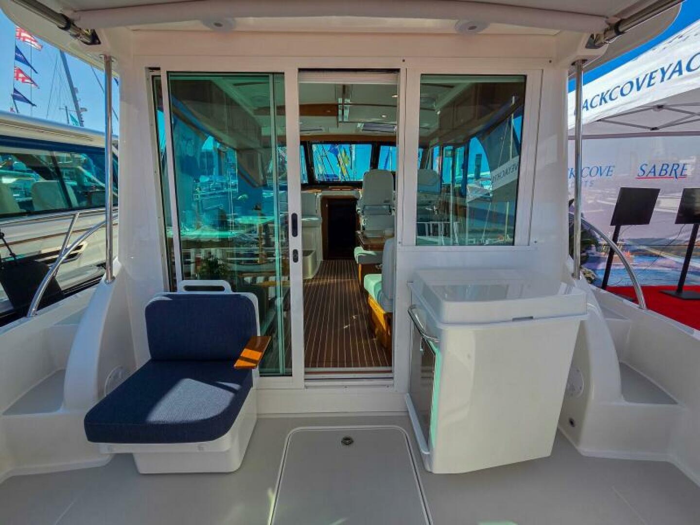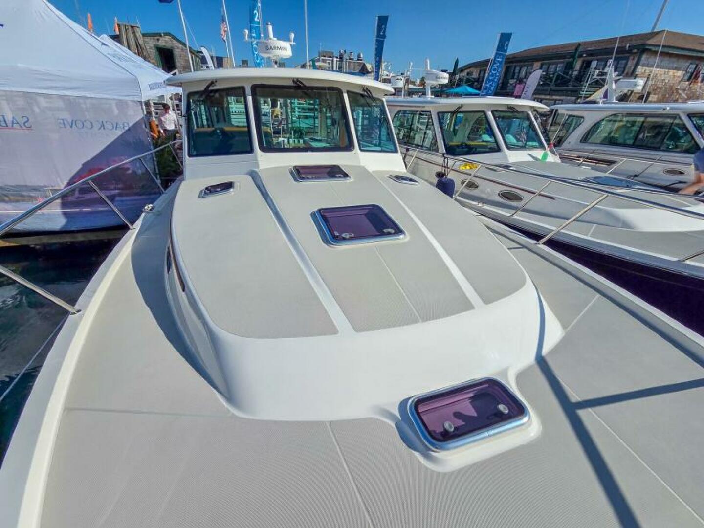 The Back Cove 41 is now reintroduced as the Back Cove 412. While the hull and interior layout remain unchanged, several key features have been added: a remote helm fuel tank switching system, frameless direct-bonded pilothouse windows, a full-height hinged helm door, a low-glare helm with black windshield mullions, and a new Glendinning cord reel. Other upgrades include updated cockpit cushions, a sliding salon door with a power window, and the option for either an aft-facing seat with a grill cabinet or two seats. The Volvo D8 600hp is now standard, with the Volvo D11 725hp option including Slow Speed Mode.