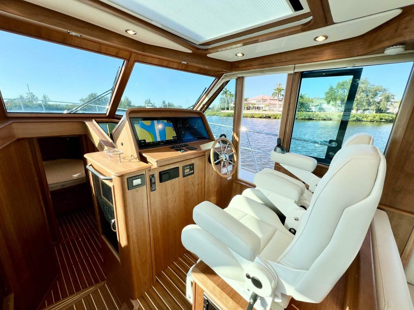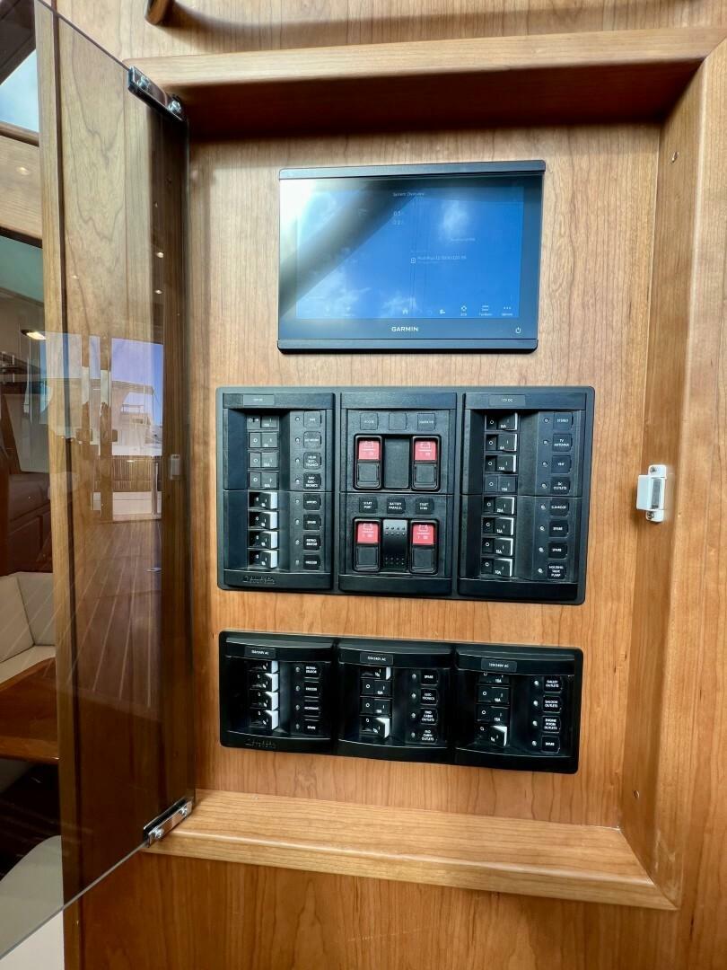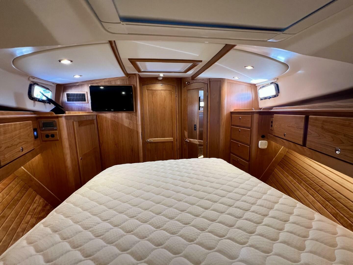 Highlights include a spacious salon with two banks of seating over six feet in length and a half-up galley that incorporates all the amenities of a modern kitchen without wasting an inch of precious storage volume. Below deck, a versatile hybrid lounge functions as guest berth, private retreat, or home office, depending on her owners’ needs. Her master stateroom is iconic Sabre, featuring an island berth and numerous storage compartments, all in warm American cherry. Finally, an adaptable utility room beneath the salon sole provides space for various supplemental storage and appliance solutions, including a side-by-side washer and dryer, wine cooler, or storage lockers.