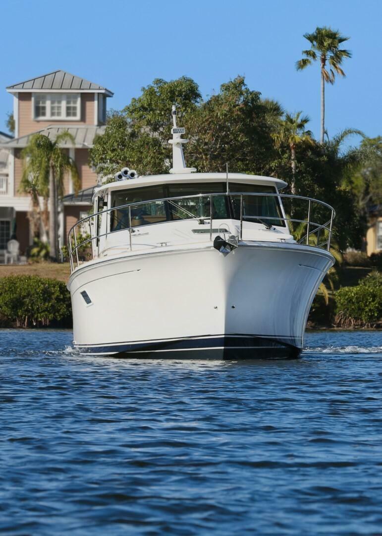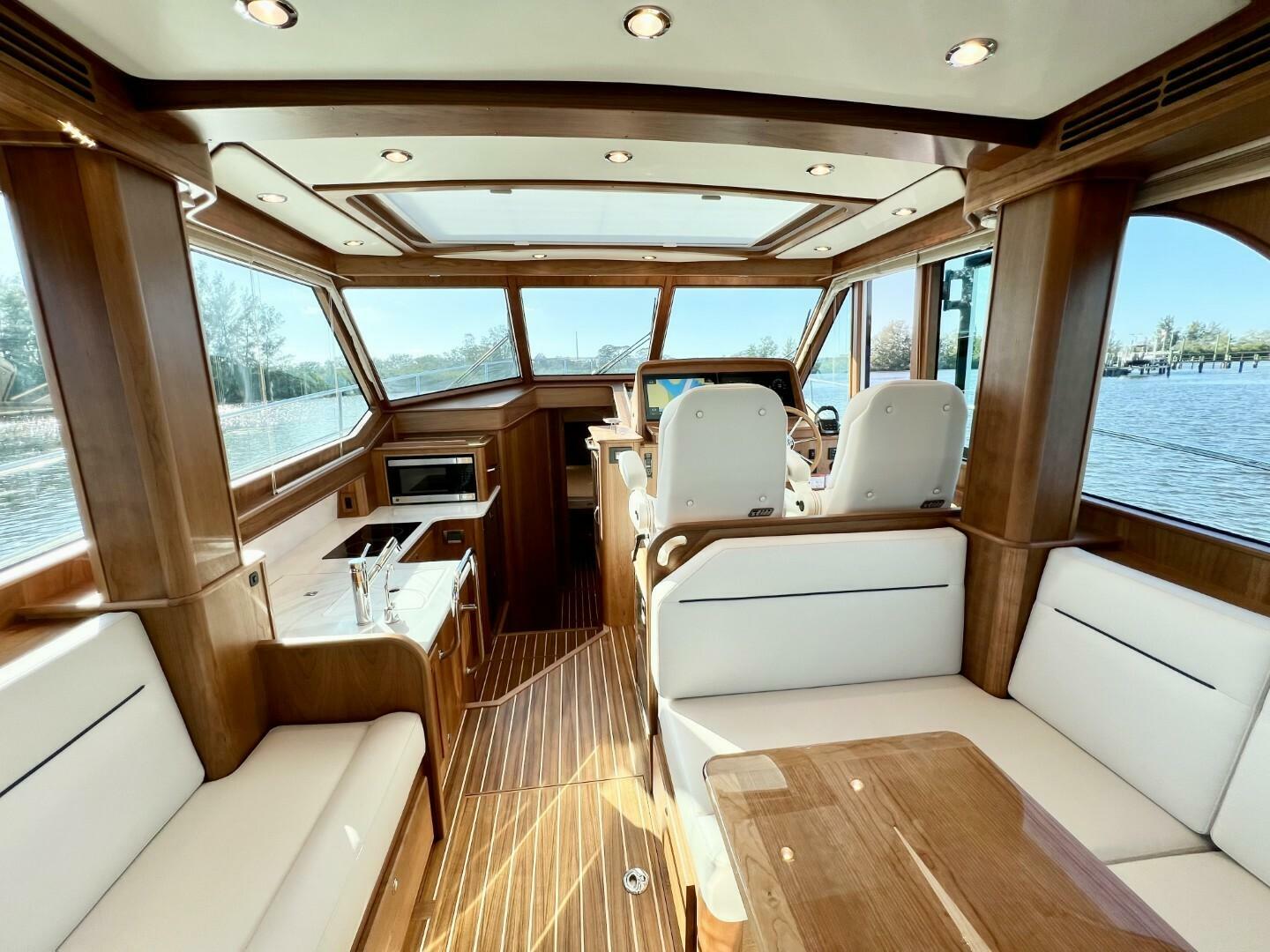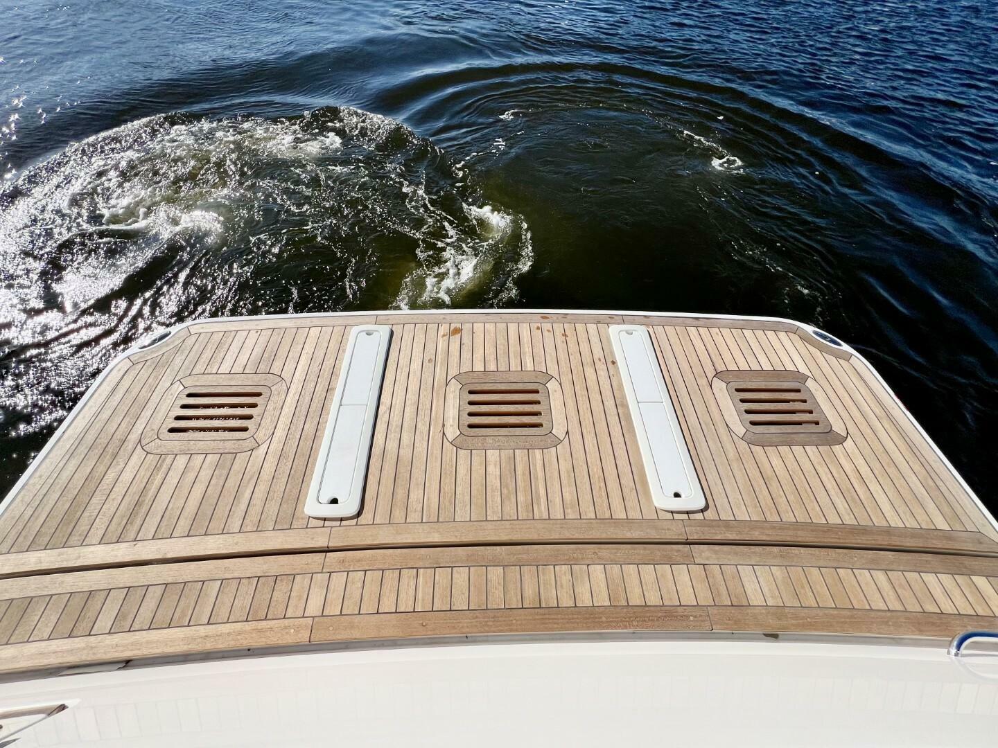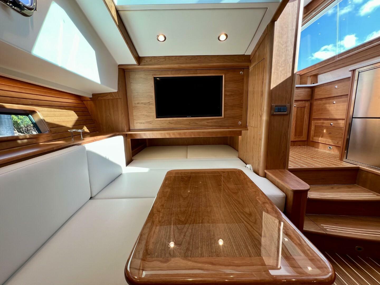 Highlights include a spacious salon with two banks of seating over six feet in length and a half-up galley that incorporates all the amenities of a modern kitchen without wasting an inch of precious storage volume. Below deck, a versatile hybrid lounge functions as guest berth, private retreat, or home office, depending on her owners’ needs. Her master stateroom is iconic Sabre, featuring an island berth and numerous storage compartments, all in warm American cherry. Finally, an adaptable utility room beneath the salon sole provides space for various supplemental storage and appliance solutions, including a side-by-side washer and dryer, wine cooler, or storage lockers.