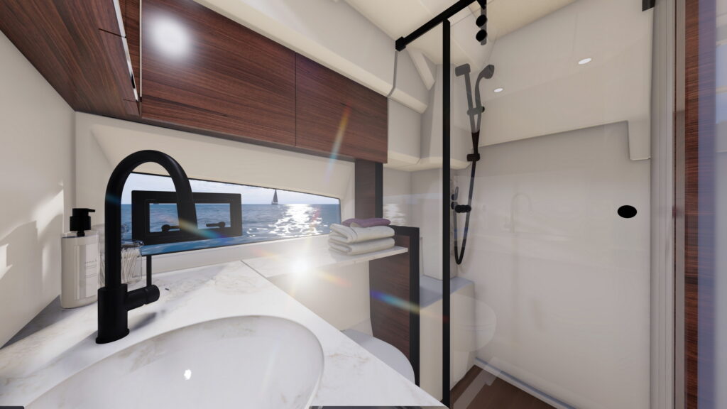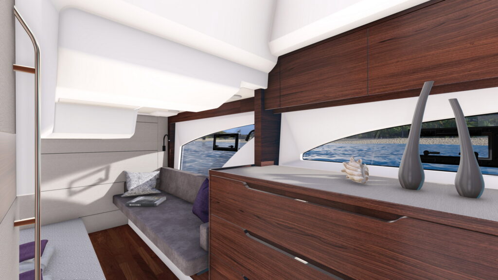 The Marex 390 is available with several engine options to suit different cruising needs. Owners can choose between single or twin sterndrives, or with shaft drive motorization coming later. Fuel and water tank capacities are generous, making the boat well-suited for longer trips at cruising speed. For added convenience, anew pilot door provides easy access to the side deck ,simplifying docking and maneuvering while also enhancing onboard ventilation