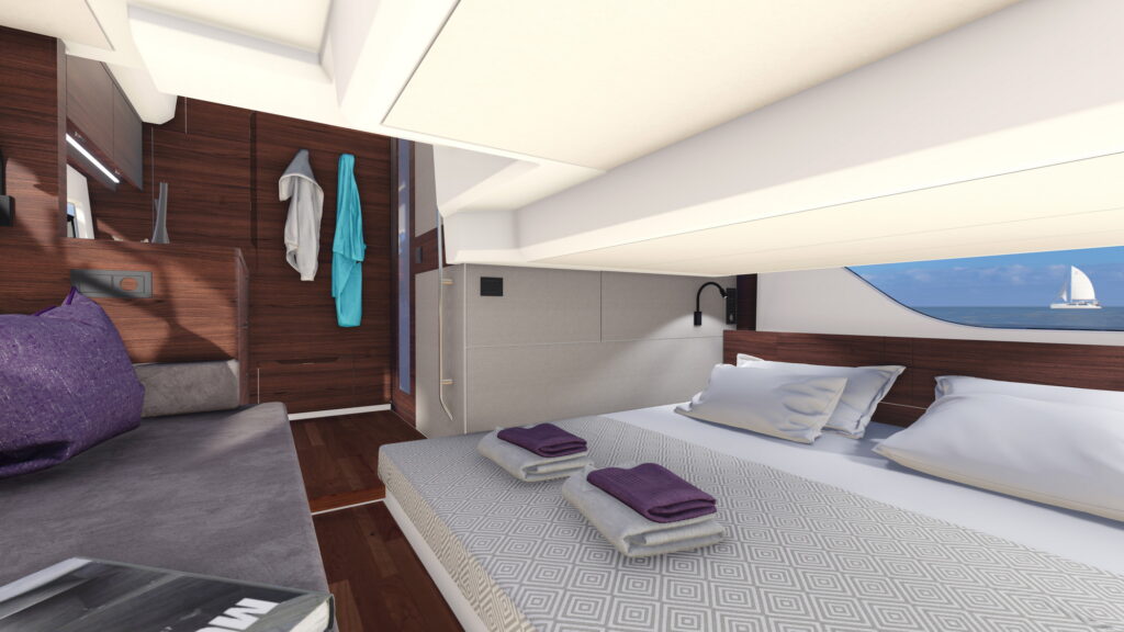 The accommodation on the Marex 390 is designed to deliver true home comfort on the water. Both the forward and midship cabins feature enlarged double beds with premium mattresses that improve sleeping quality. Spacious wardrobes and generous standing height add to the overall sense of comfort. In the midship cabin, a sofa serves as a cozy seating area or an additional sleeping space for children. A separate shower contributes to the home-like atmosphere, while large windows on the lower deck fill the space with natural light, creating a bright and airy ambiance