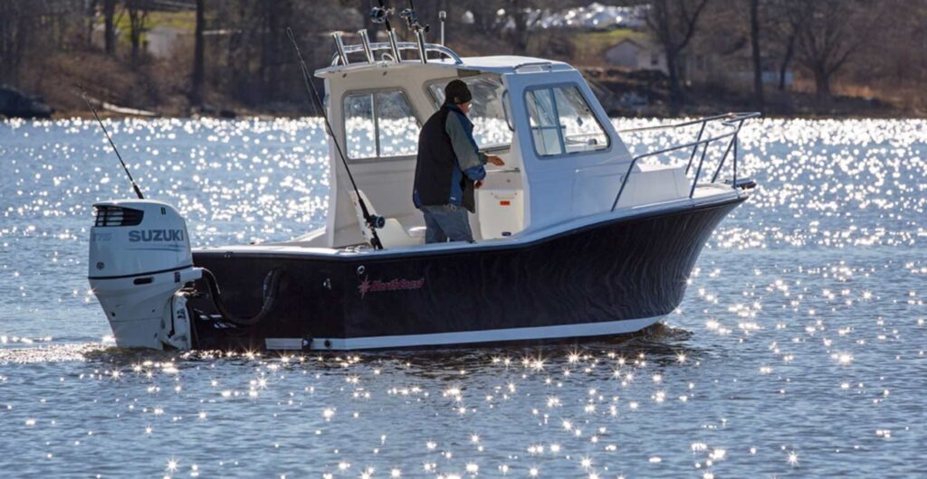 Get on the water earlier or extend your fishing season into the Fall, with the NorthCoast 215. Open the front and side windows for ventilation while heading to your favorite fishing spot. The VBerth and portable head provide overnight capabilities. Cockpit is self bailing with courtesy lights, molded box storage, full transom, bow rail and two tone deck are just the beginning of our standard specifications. Check out the huge transom live well, saltwater wash-down, rod holders, tackle boxes and hard top rocket launchers.