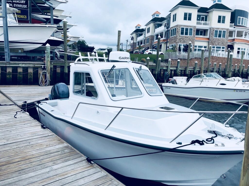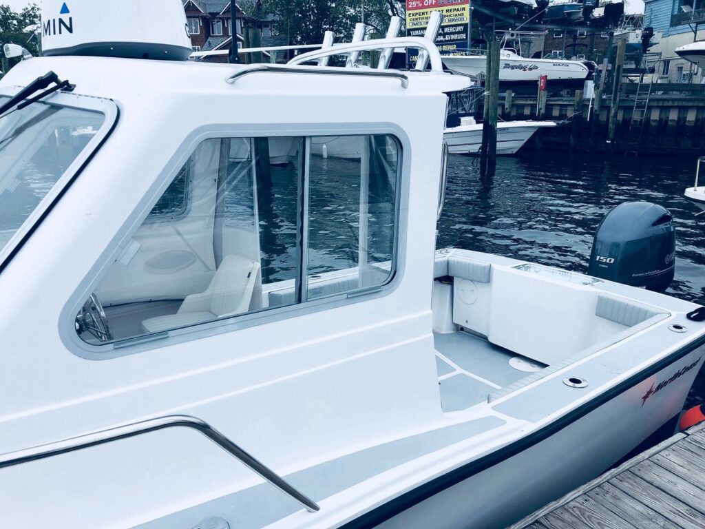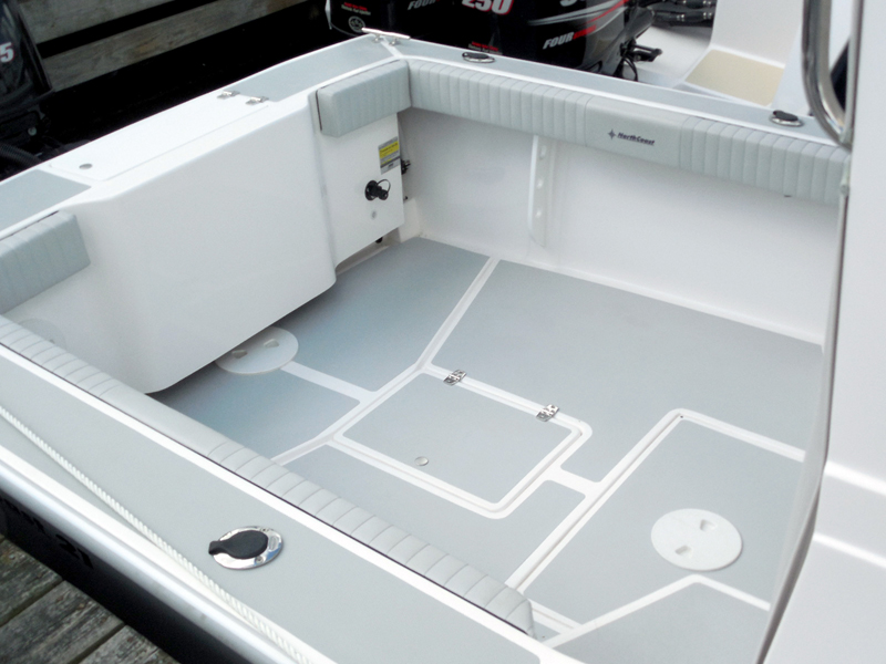 12 Year structural hull warranty • “No wood” Construction • White hull w/ boot stripe • Cored deck and molded hull liner w/two tone molded non-skid (Gray/Tan) • Foam filled composite grid stringer system • High density foam cored transom • Positive flotation • Integral bow sprit w/ roller • 316 1” Stainless Steel Bow rail