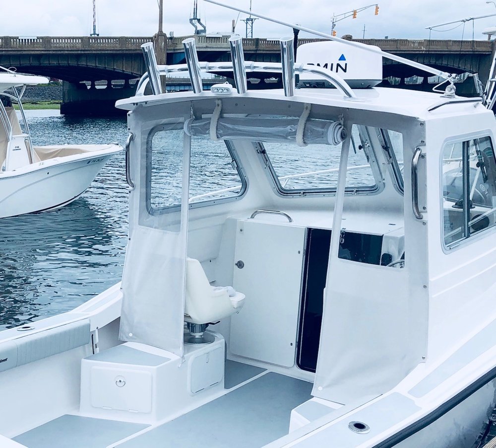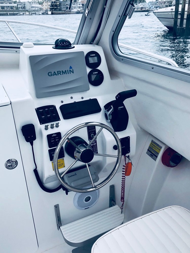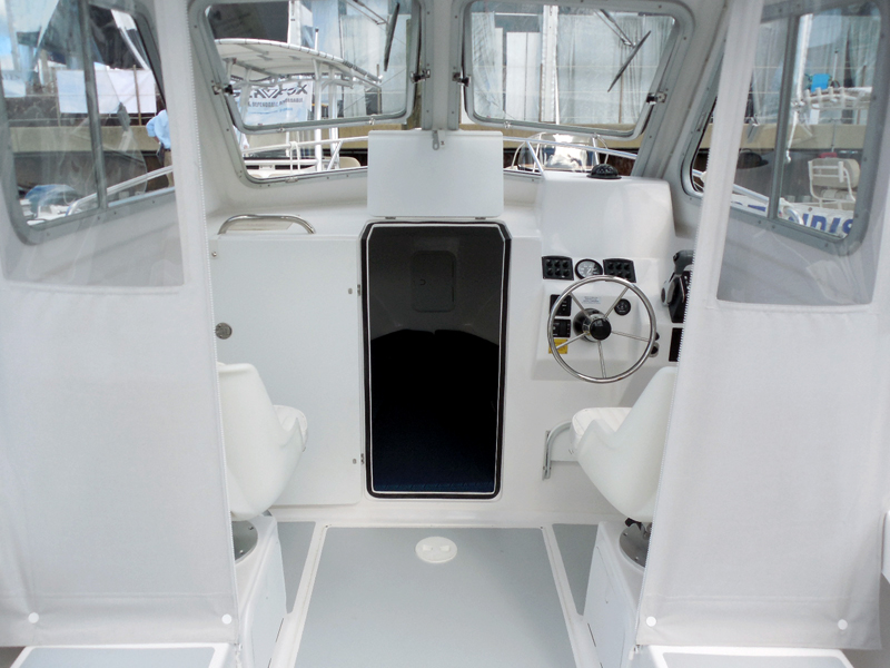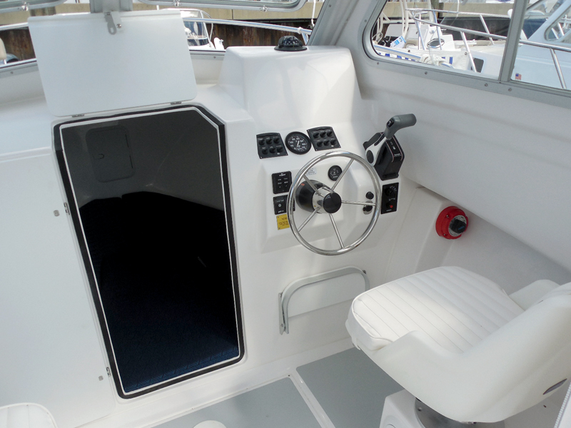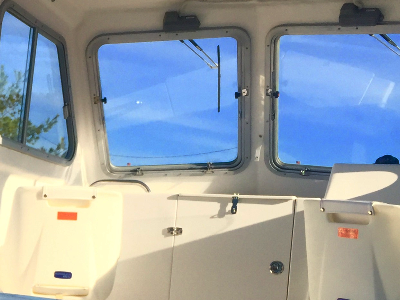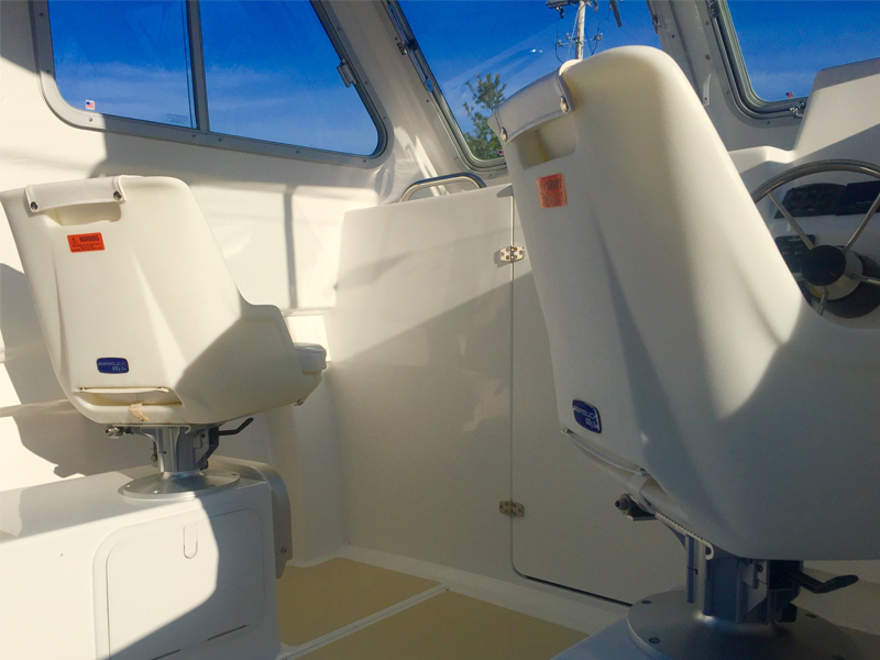PILOTHOUSE • Opening front windows • Sliding side windows • Windshield wipers P&S • Spreader light (hard top) • Dome light overhead • EDSON SS steering wheel w/ knob • Hydraulic steering system • Ritchie Compass • DC panel 6 gang (2) • DC plug & horn at helm • Trim tab switches • Helm seats on molded box w/ tackle boxes / drawers below P&S • Aft canvas enclosure