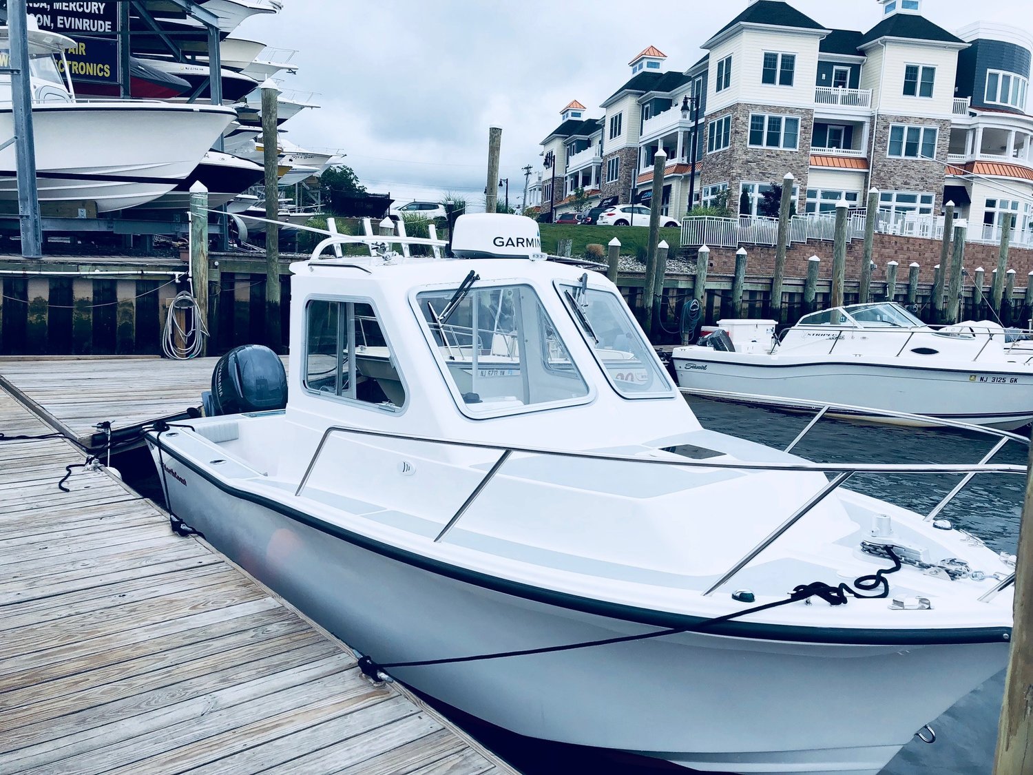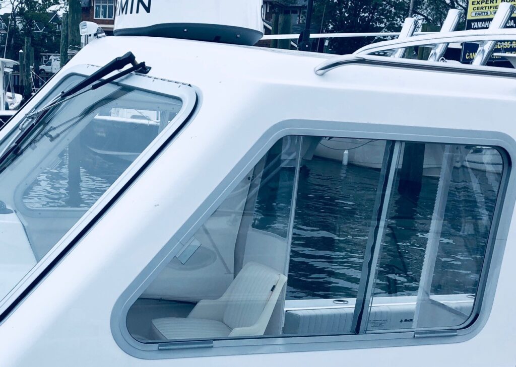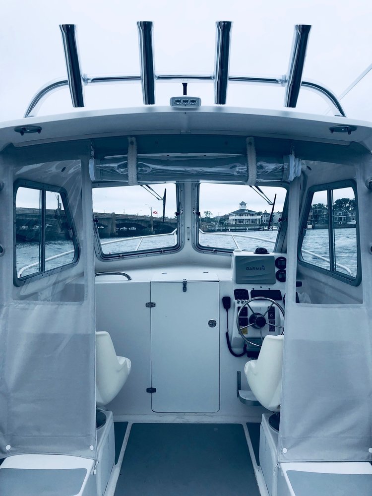 PILOTHOUSE • Opening front windows • Sliding side windows • Windshield wipers P&S • Spreader light (hard top) • Dome light overhead • EDSON SS steering wheel w/ knob • Hydraulic steering system • Ritchie Compass • DC panel 6 gang (2) • DC plug & horn at helm • Trim tab switches • Helm seats on molded box w/ tackle boxes / drawers below P&S • Aft canvas enclosure