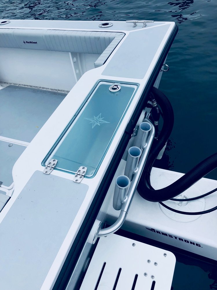COCKPIT • 20gal. Blue Live Well (transom) •32gal Cockpit Fish Box •Salt water wash down system • Rocket launchers (hard top) • Self-bailing cockpit w/ (2) scuppers • Cockpit bolster package • Armstrong engine bracket • Swim ladder