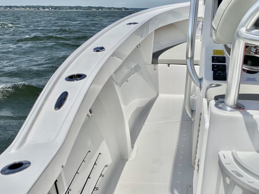 • 12 Year structural hull warranty • “No wood” Construction • White hull w/ boot stripe • Cored deck and molded hull liner w/two tone molded non-skid (Gray/Tan) • Foam filled composite grid stringer system • High density foam cored transom • High impact Rub rail w/ insert