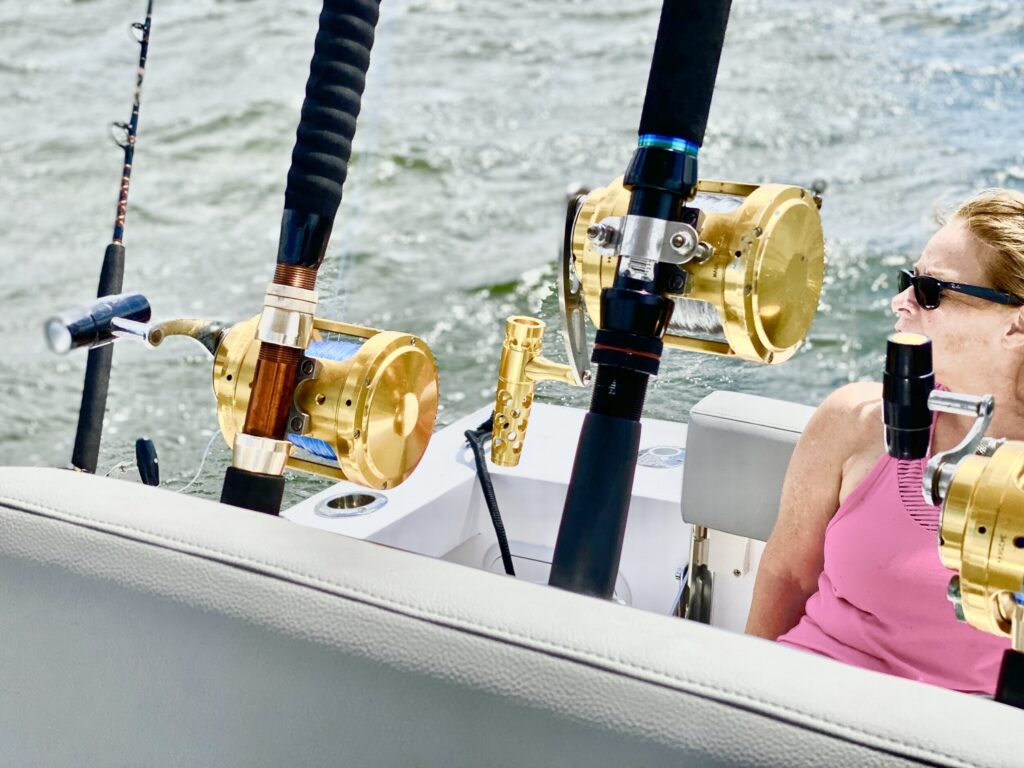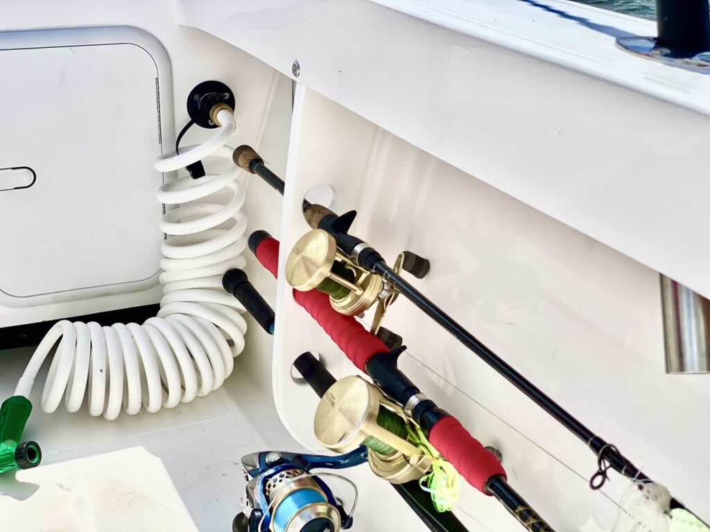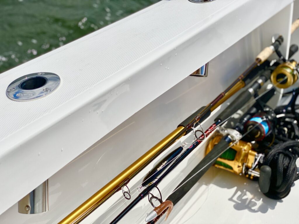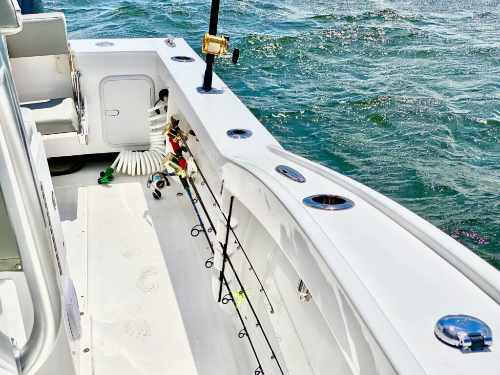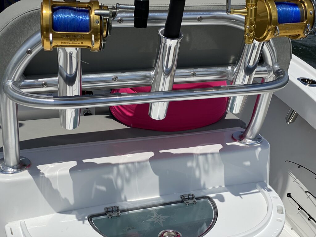 COCKPIT • FRP leaning post w/ backrest and (3)Rocket Launchers, Blue Live well w/light, clear lid and (10) tackle boxes • (6) Rod storage under gunwales P&S • Custom stainless steel rod holders (4) • Rod / Cup holders (6) •Cockpit courtesy lights (2) • Self-bailing cockpit w/ (2) scuppers • Saltwater Washdown • Stainless steel locking latches throughout (6) • Stainless steel thru-hulls • Stainless steel ½” bow & stern eyes (3) • Stainless steel 8” spring line cleats (2) • Stainless steel 10” stern cleats (2) • Fuel/water separator • Crosslink poly fuel tank w/ shut off valve • Stainless steel fuel fill deck plate • (2) Batteries • Automatic bilge pumps (2)