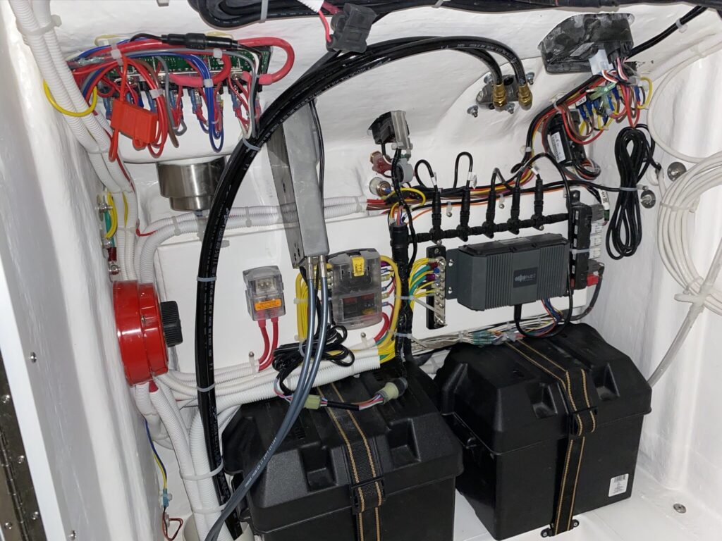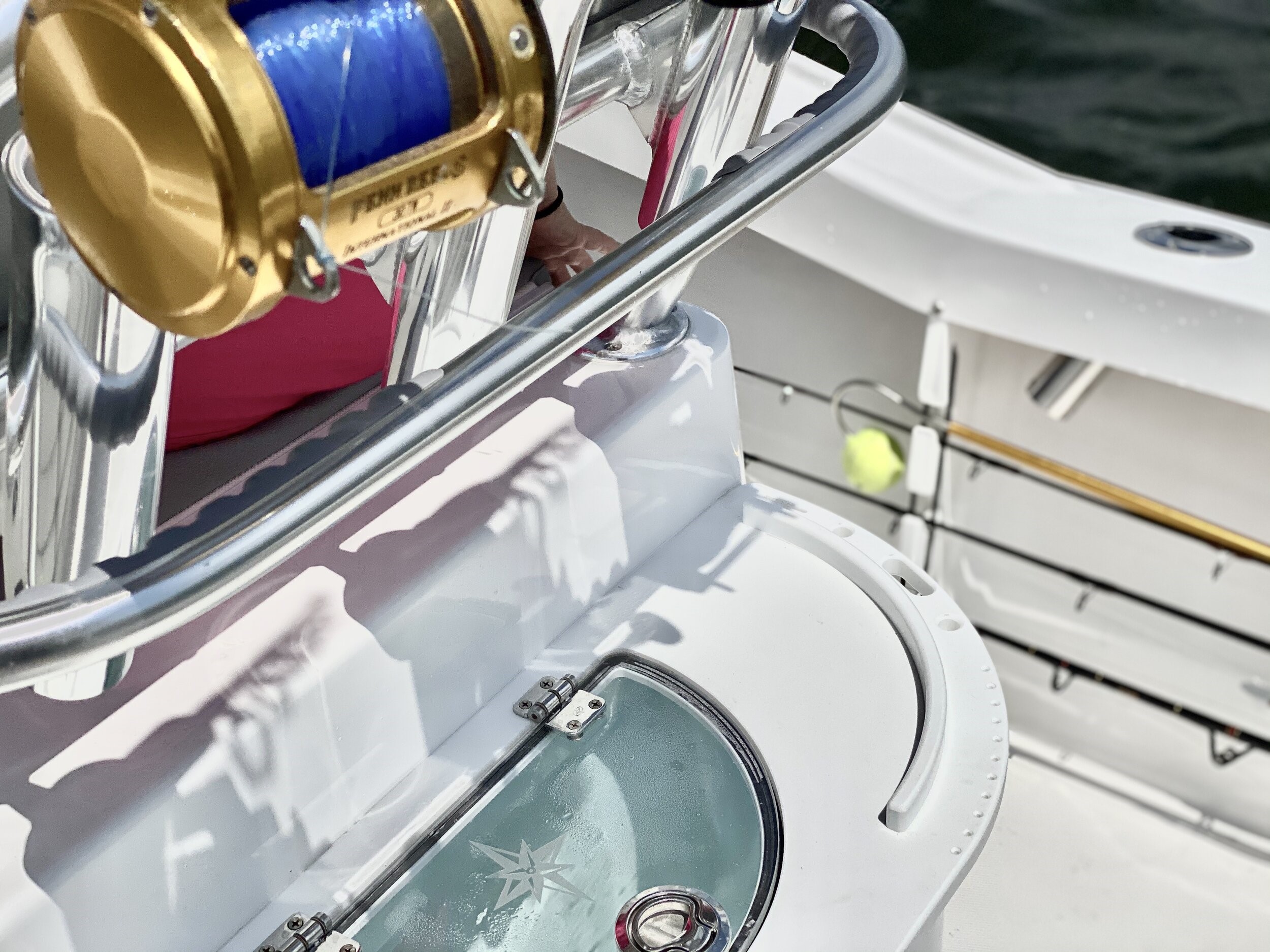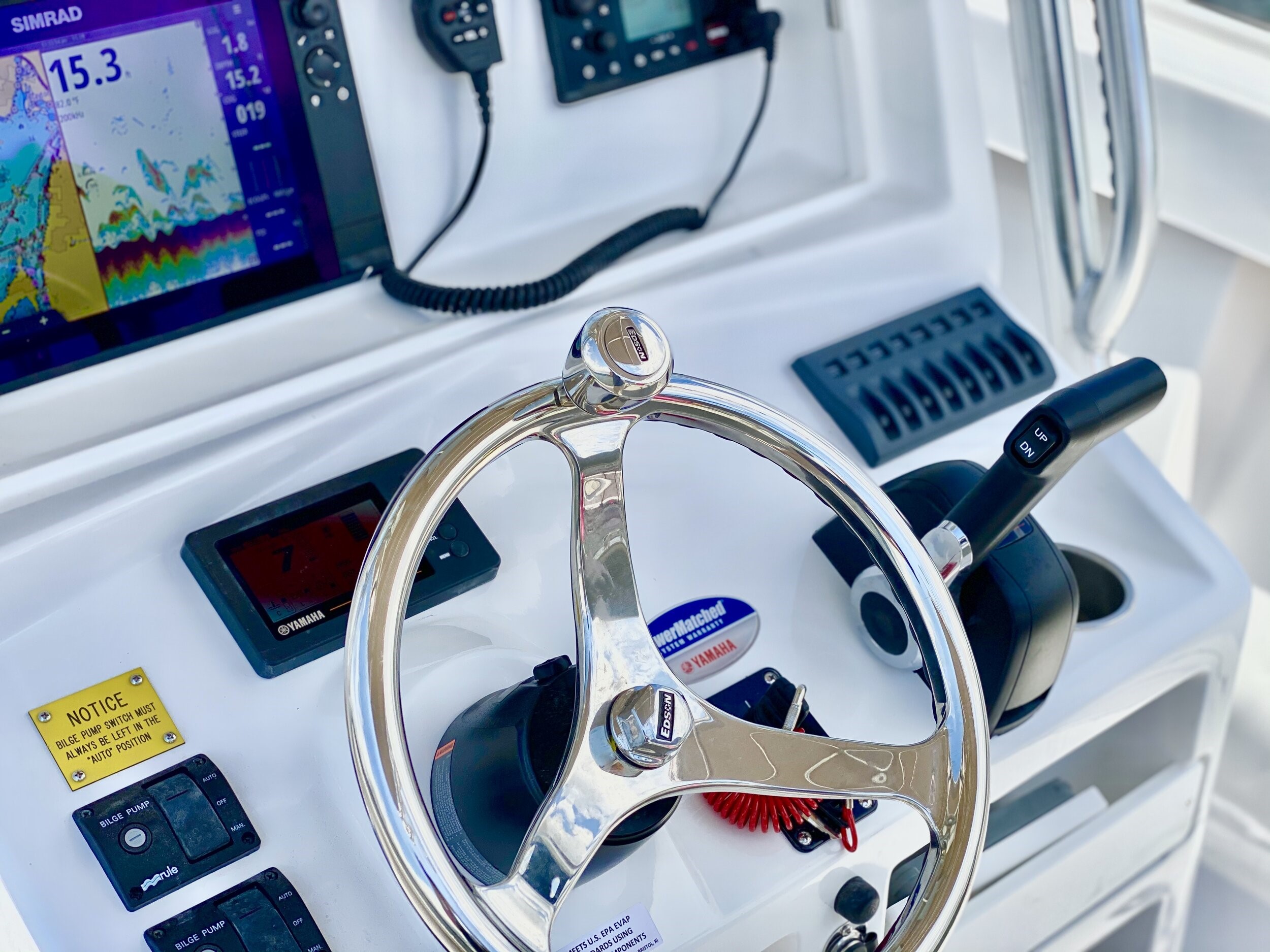 HELM / CONSOLE • Tinted windshield & wrap around handrail on console • Ritchie Compass • Center console w/ molded foot rest, storage bins & SS cup holder • EDSON SS steering wheel • Hydraulic steering system • Lockable electronics box in console • Lockable storage in console • DC power plug & horn at helm • Trim tab switches • DC electrical panel 8 gang • Dual battery switch • New Molded T-Top underside matches non-skid •(4) Rocket Launchers • Cockpit spreader light on T-Top