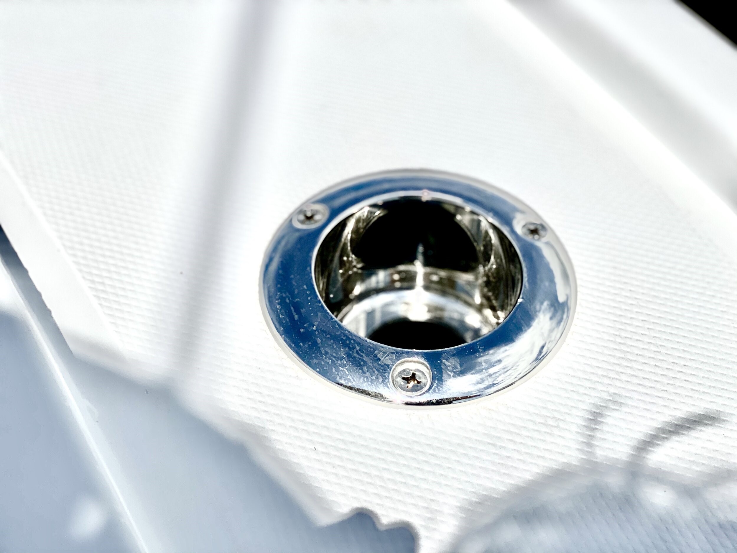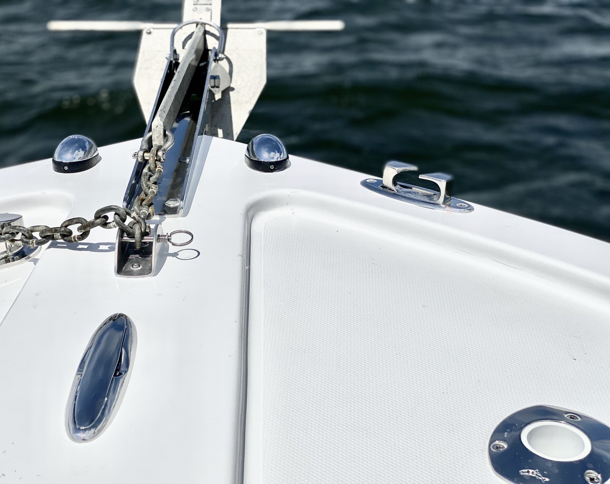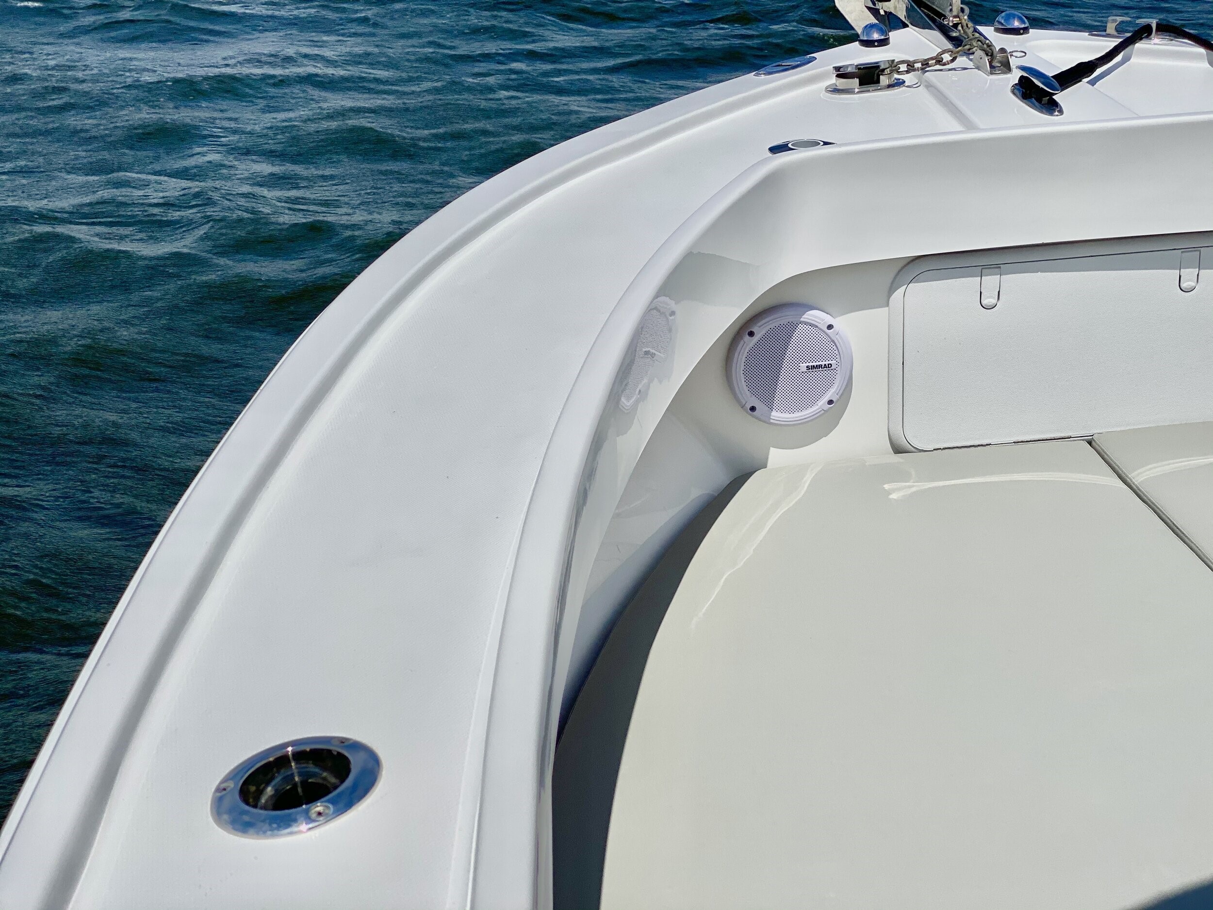 DECK • Running lights • Stainless steel 6” bow chocks (2) • Stainless steel 10” bow cleat • Anchor locker • Stainless steel bow anchor roller w/ hawse pipe & chain lock • Forward casting platform w/251qts. of lockable storage P&S ( 62.8gal each) •In deck storage area forward of console is a massive 16 cubic feet • Engine bracket w/ Full transom and swim ladder / Combined 35gal Blue Live Wells w/lights